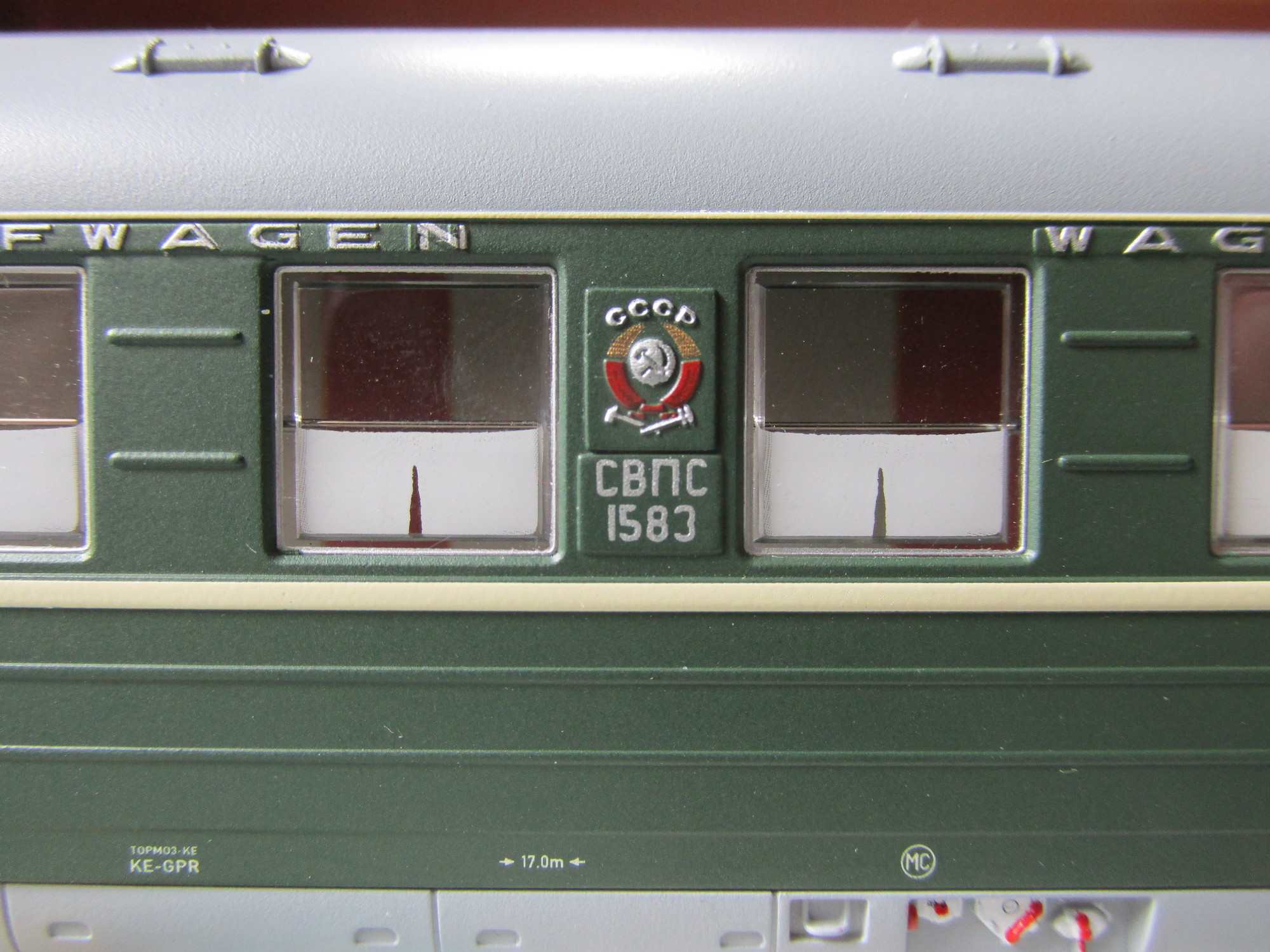 Вагоны принадлежности СЖД, с разными номерами. Деталировка впечатляет - очень хорошо проработаны тележки и подвагонное оборудование (несмотря на то, что оно скрыто фальшбортами), надписи тоже на высоте. Отдельно радует проработка междувагонных переходов и полноразмерные буферные тарелки. Из замечаний можно отметить только чуть грубоватое литьё и шероховатость деталей суфле.