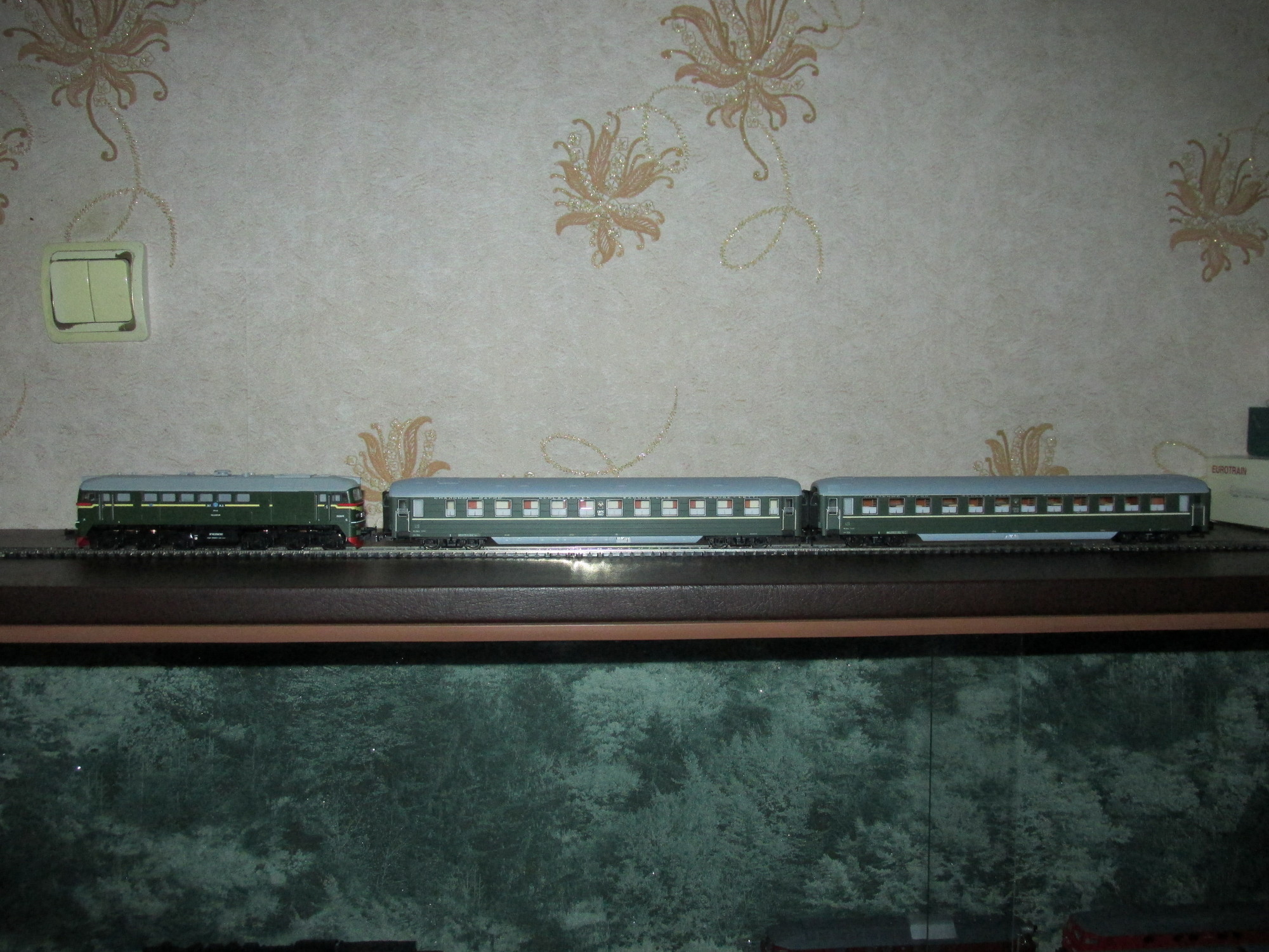 Установим вагоны на рельсы, прицепим локомотив. М62-1169 от ROCO по цветовой гамме подойдёт хорошо. Как говорится, теперь есть к чему стремиться - поезд должен быть полносоставным!