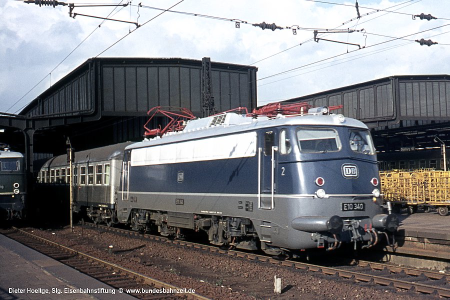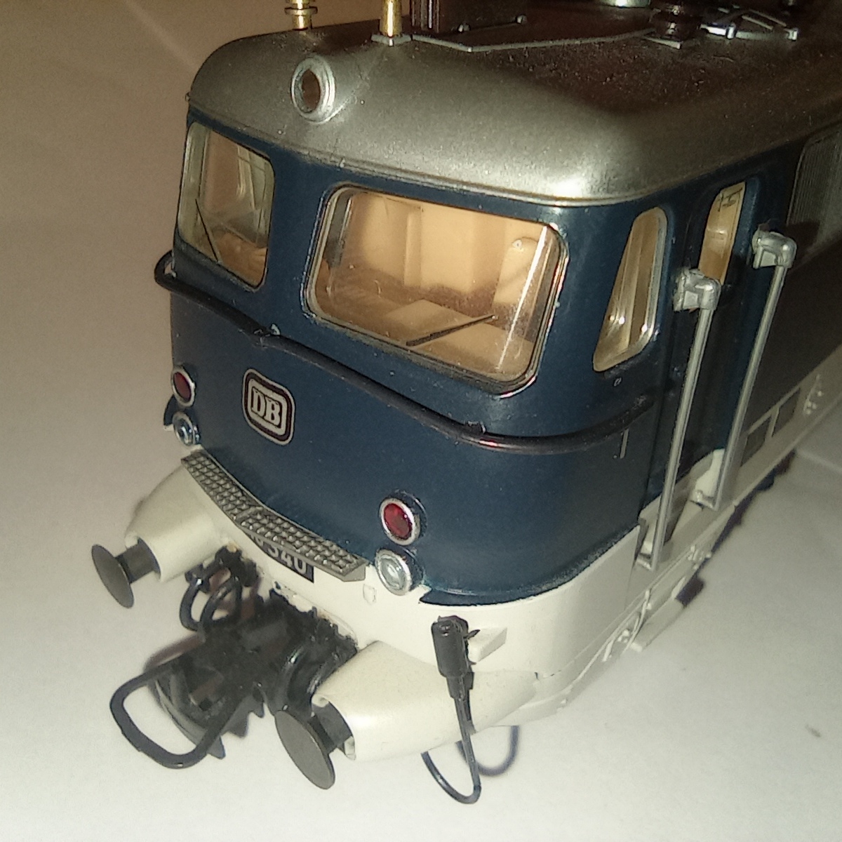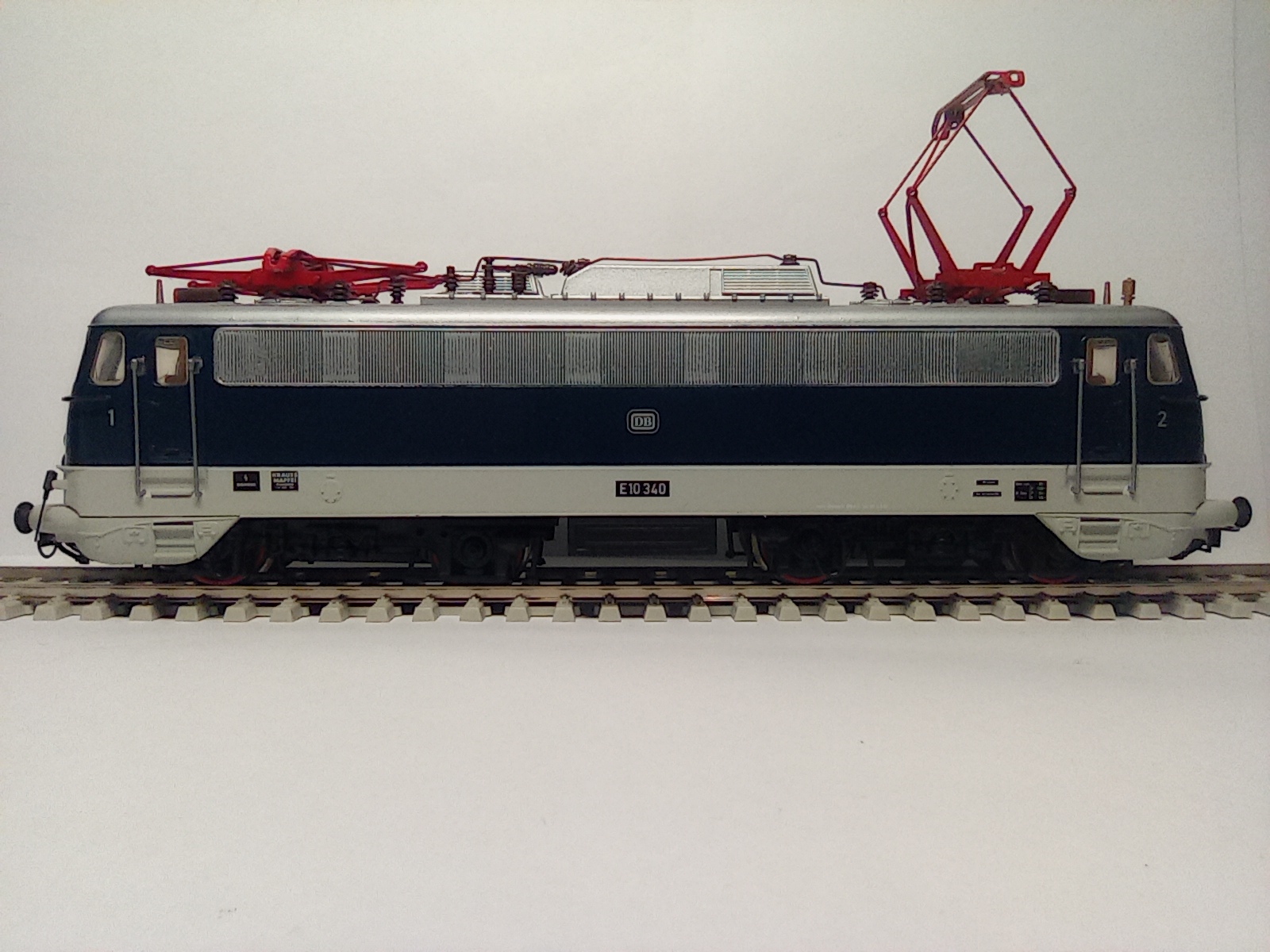 Модель Е10 340 выпускалась начиная с 1988 года. Являлась представителем третьей эпохи, аналоговой и под цифру адаптирована не была, имела движок с одним маховиком и приводом на обе тележки. Свет ламповый через световоды в торцах кабин. Также есть возможность переключения питания с рельс на пантографы. Наклдные детали - это всякие шланги и поручни. Как по мне поручни выполнены немного грубовато по сравнению с аналогичной моделью ROCO. Также, Liliput немного прогадал с серым тоном юбки - слишком светлый. Такой тон подходит больше Е10 384. Кстати, про серый тон юбки. Все локомотивы Е10 изначально имели окрас - верх синий стальной или синий кобальт, а низ чёрный, за исключением Е10 340, Е10 383, Е10 384 (на фото ниже), у которых низ был серым различных тонов.