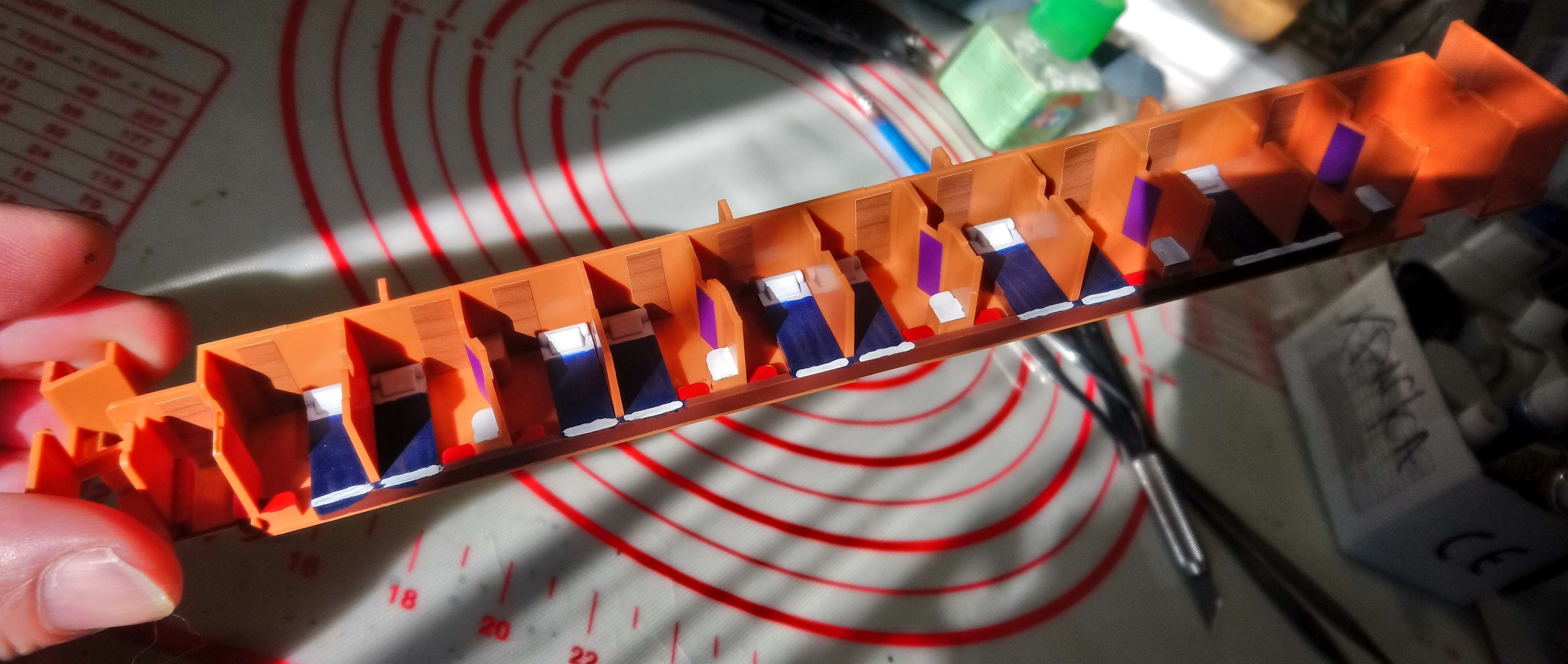 Они ломаются и теряются.Лучше бы отлили с корпусом.Все цветные ништяки под вагоном красил я.