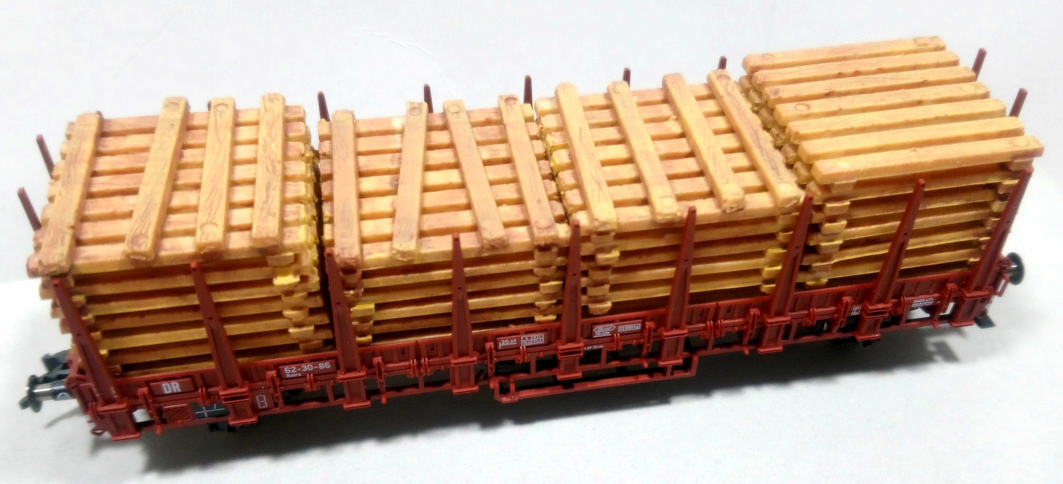 Прикольно получилось. Хотя мне кажется шпалы и пиломатериалы грузятся в транспорт пачками без междурядных прокладок для исключения сдвига и сползания при троганьи и торможении. Прокладки используют только между пачками для облегчения затяжки строп при выгрузке