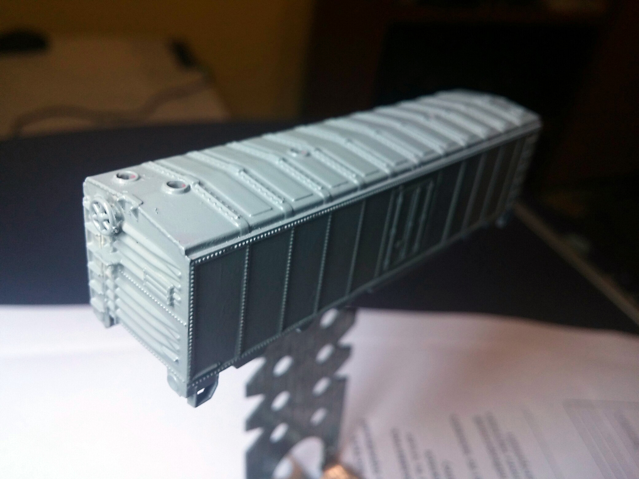 Для тех кто хотел глянуть шо получается из аэрографа - вот......сегодня я первый раз решился подуть из него не моршинскую, а загрунтовать вагон который не жалко. Первый блин комом, глазом видно на плоских поверхностях подтеки......но где-то ж надо учиться