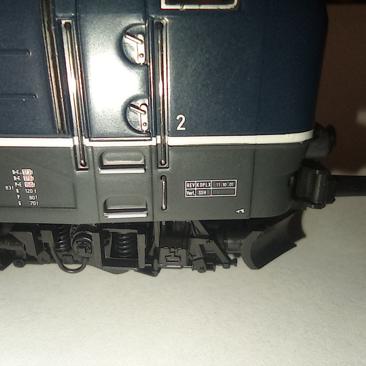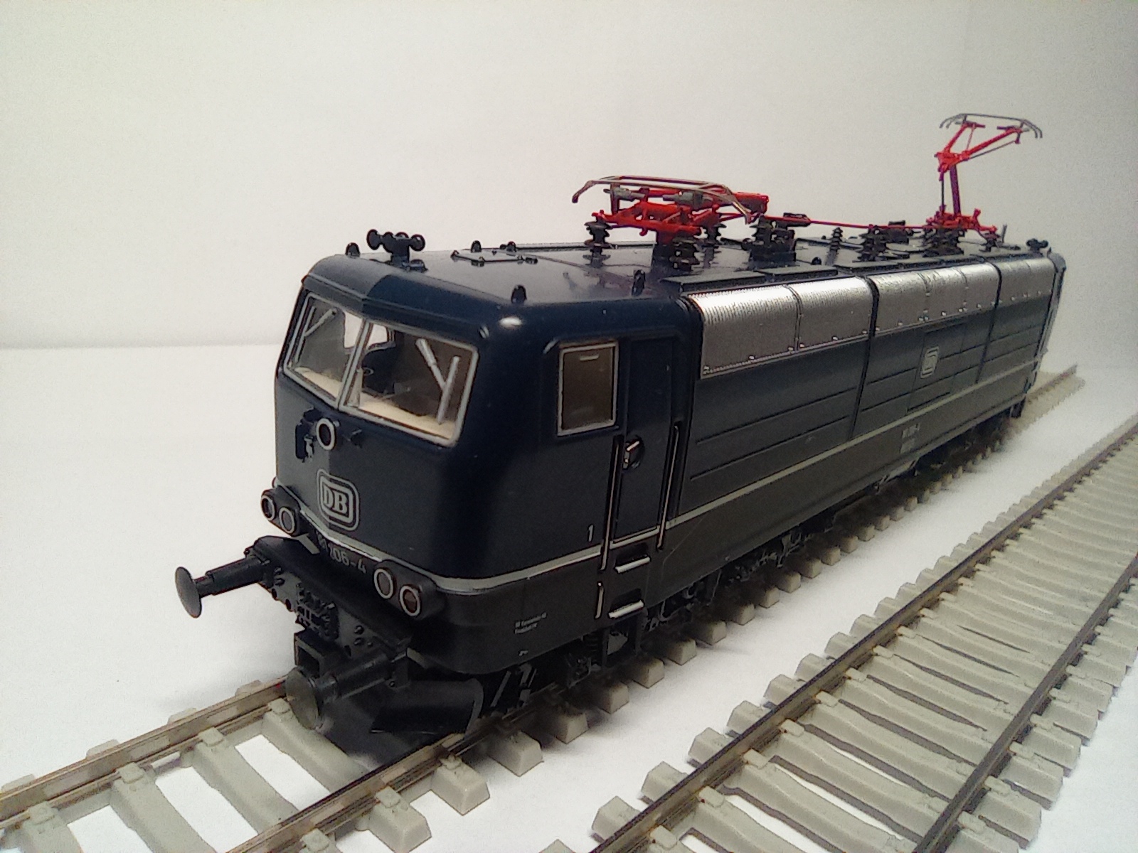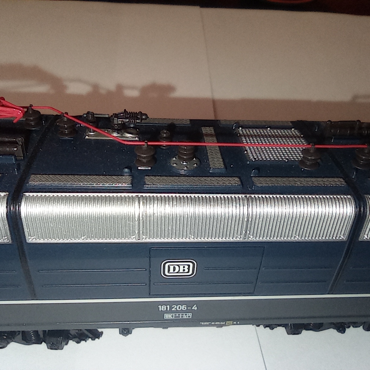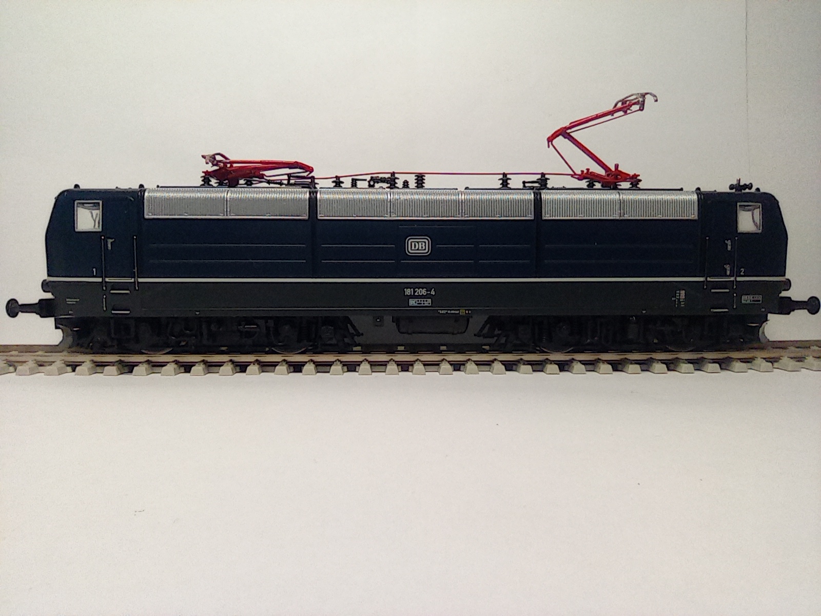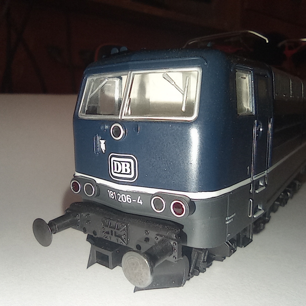Представлю BR181 206-4 от ROCO. Отлично проработанная модель, выпускалась в период с 2007 по 2010 год. Является представителем пятой эпохи, имеет 8-pin разъём под декодер, пятиполюсный движок с маховиком и приводом на обе тележки. Свет ламповый белый-красный через световоды Также есть возможность переключения питания с рельс на пантографы. Наклдные детали - это всякие шланги, поручни. Дворники и разъёмы на кабине отлиты вместе с кузовом. Есть ммитацмя машинного отделения.