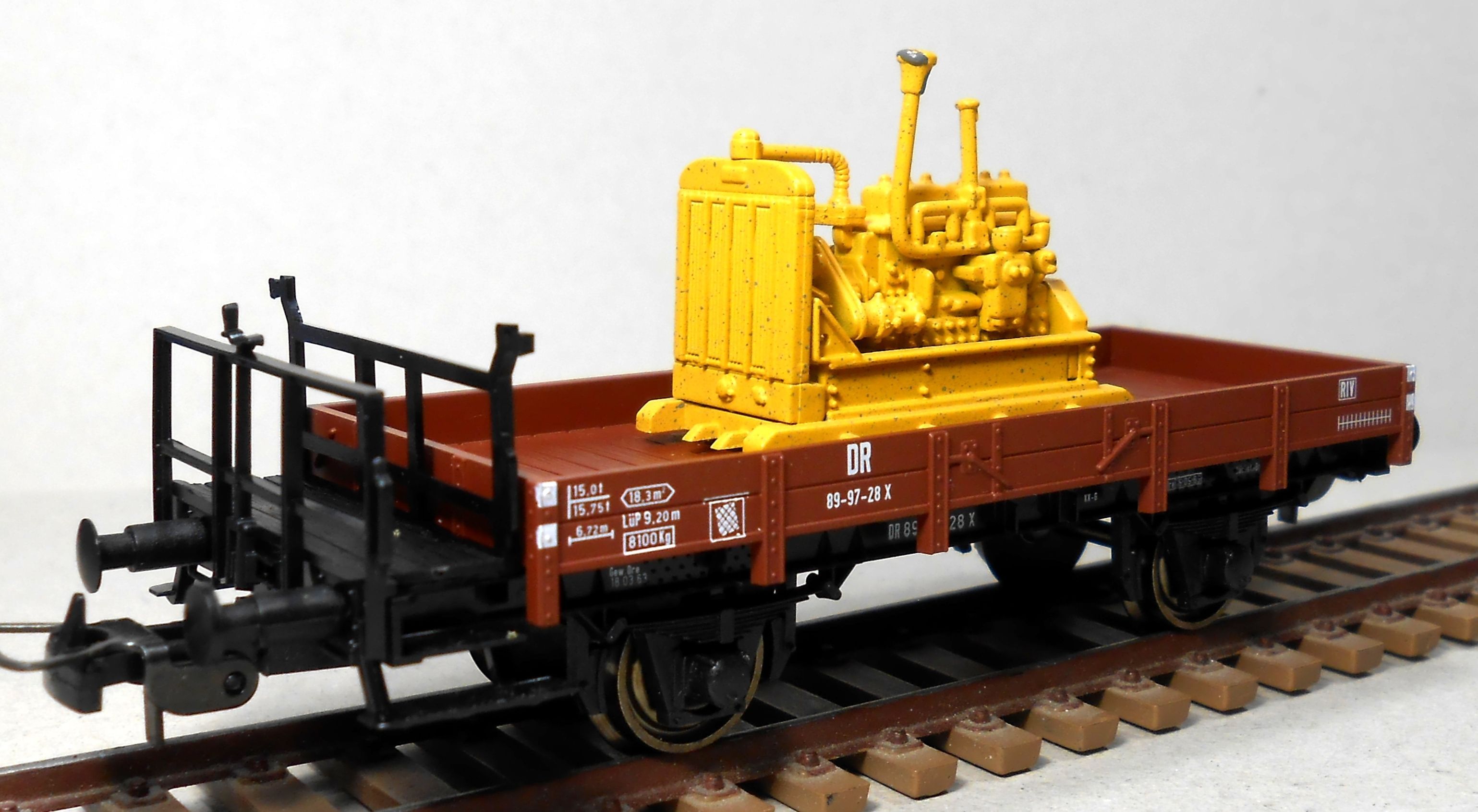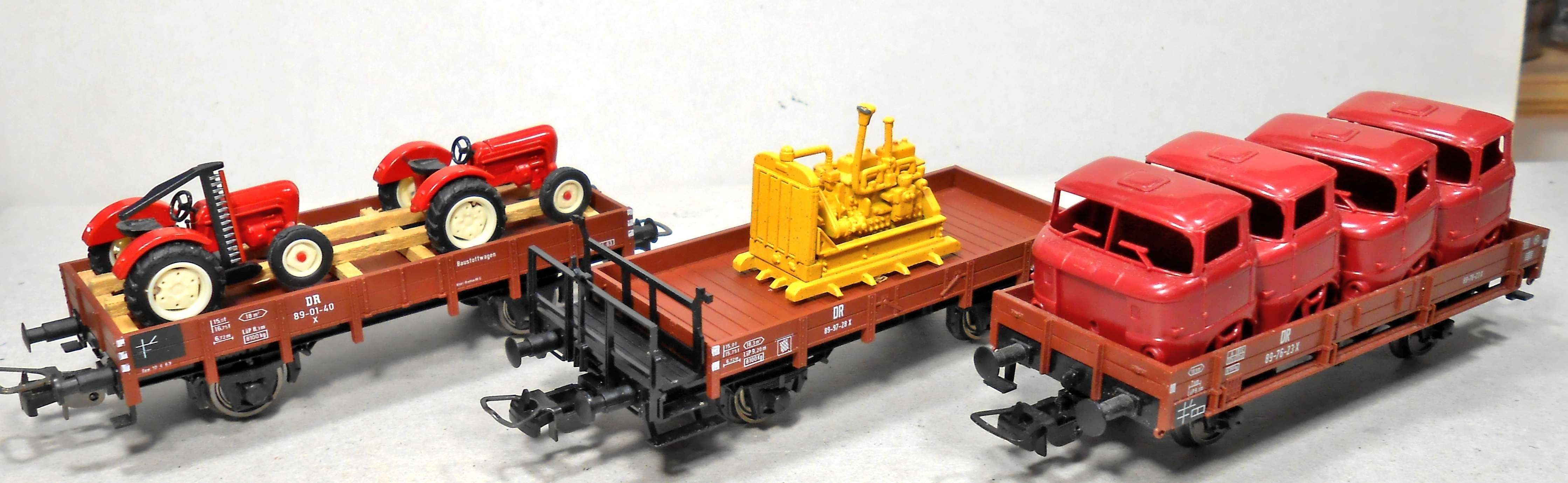 Мелкокалиберная платформа от Заксена. На полках есть еще пара вагонов данного типа .И все три разные.Вот они все вместе.