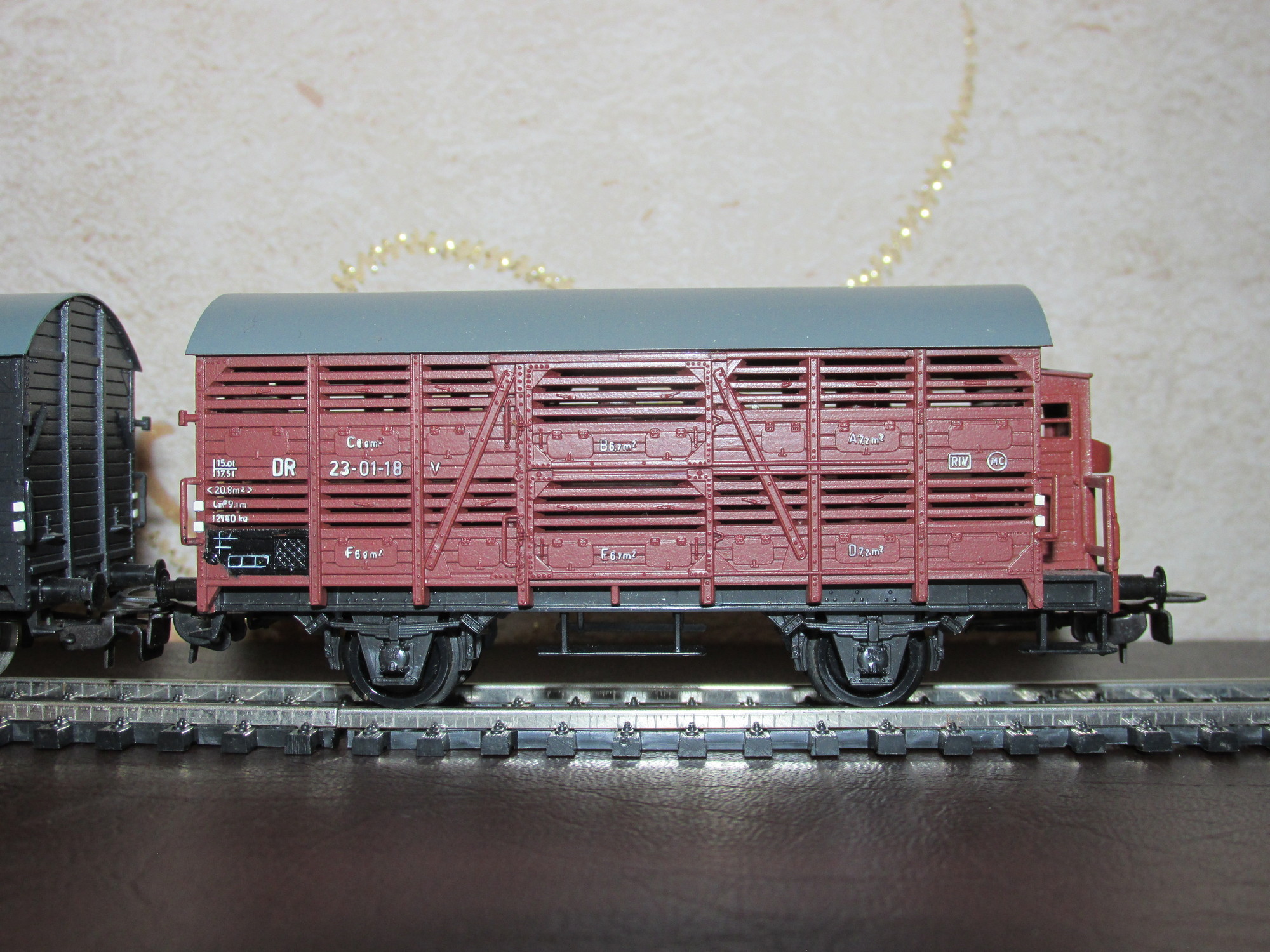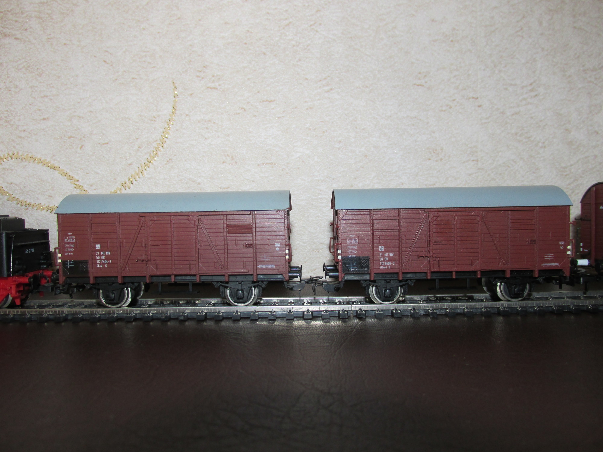 Всем хорошо известные крытые вагоны от старого Piko типа G "Kassel", прототип грузоподъёмностью 15т., база вагона - 4500 мм. В коллекции представлены вагоны принадлежности DR (выпускались под артикулом 5/127 (5/6446/010)) и SNCF (артикул 5/127-071 (5/6446/071)). Также имеется вагон-скотовоз с тормозной будкой той же базы принадлежности DR (артикул 5/160-01). Вагоны далеко не новые, не совсем прототипичные, у них то и дело лопаются поручни, кронштейны для фонарей и подножки