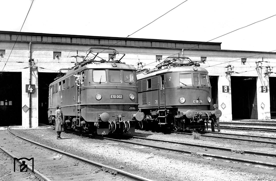 Также, совместное фото, на котором рядышком предсерийный Е 10 002 1953-го года постройки и Е 18 24 1936-го:
