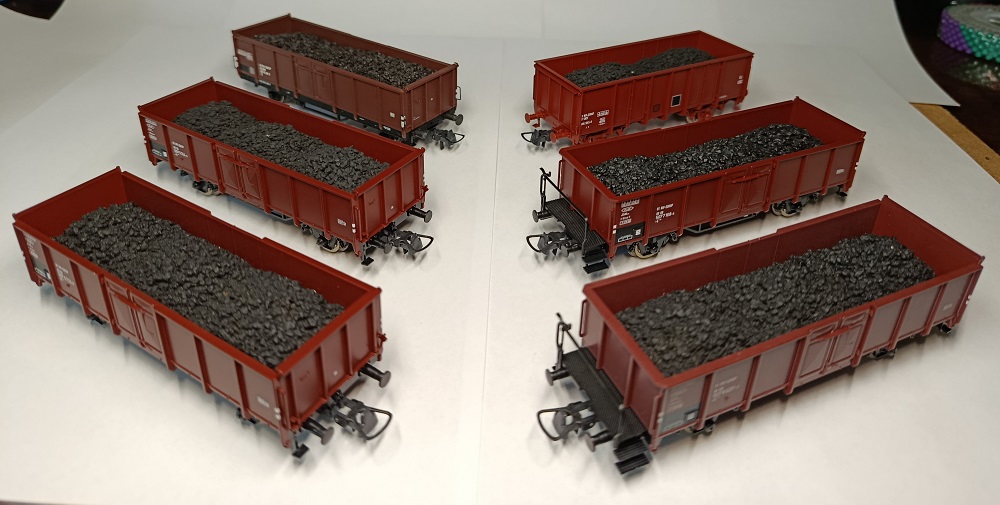 Невеличке поповнення. Напіввагони типу Е (Omm) завантажені вугіллям. Набір Roco, нажаль неповний. В комплекті, окрім вагонів DB та одного SNCF, ще повинен бути вагон CFL, але не склалося. Довелося замінити його вагоном від Liliput приналежності ÖBB. Вагон не був завантажений вугіллям. Завантажив сам.