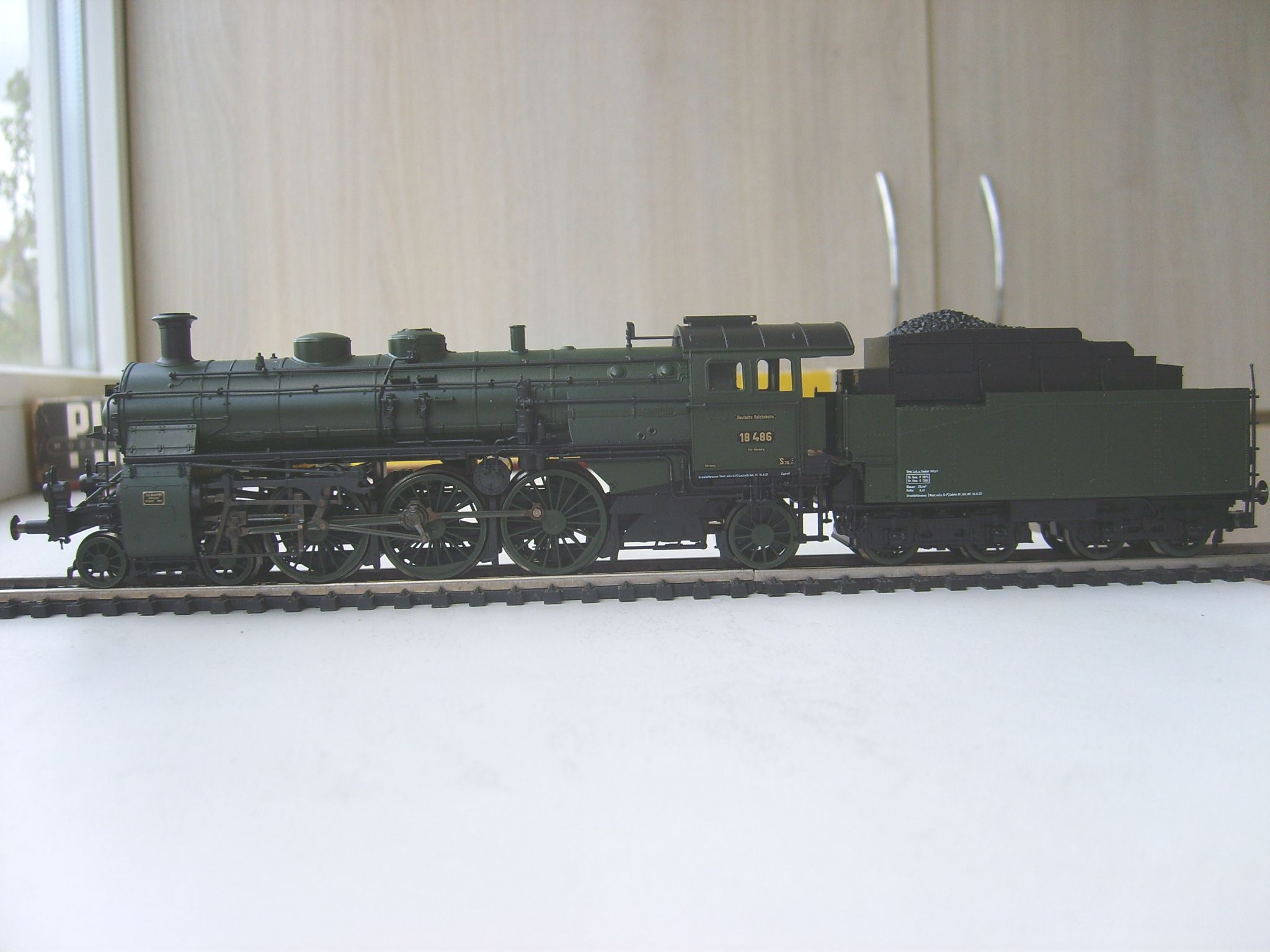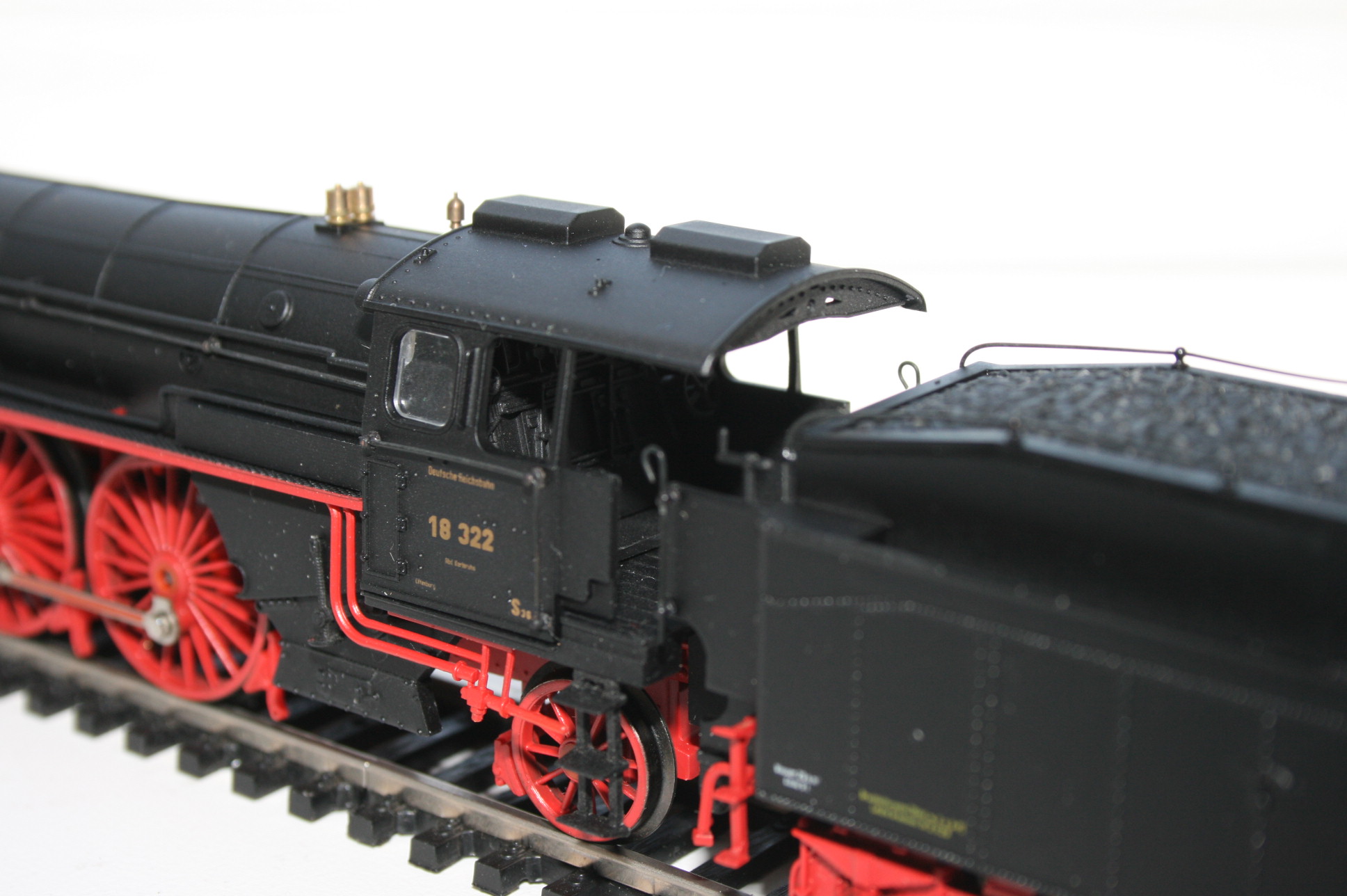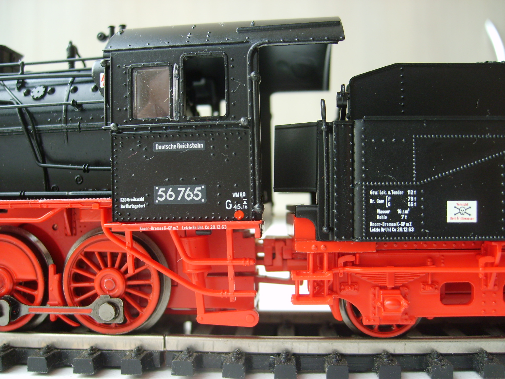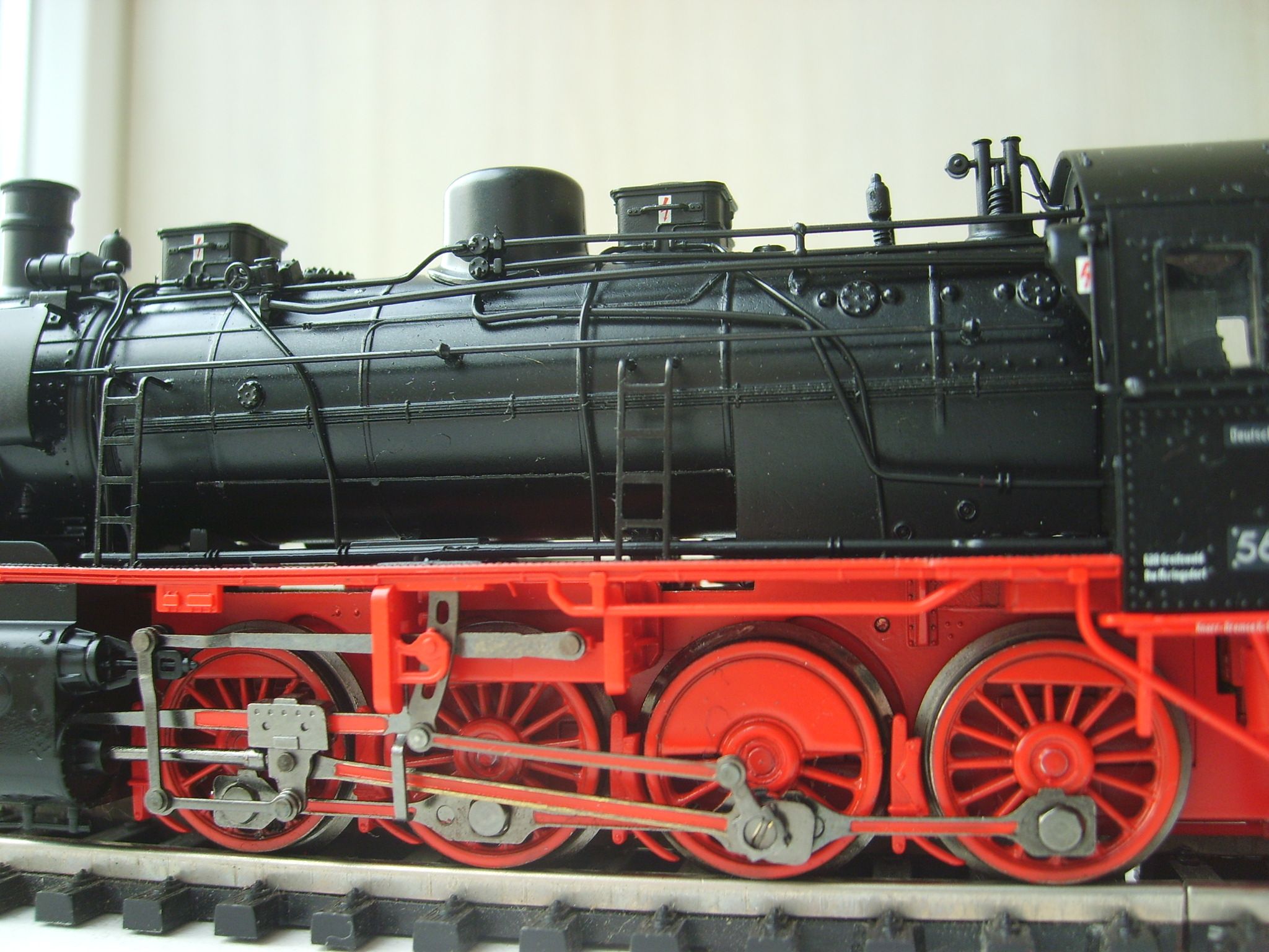 Модель такого переделанного из 55 в 56 паровоза выпускает фирма Лилипут. В данном случае принадлежности восточно-германских ж.д.. Если честно - на ходу ещё не пробовал, но сам локомотив тяжёлый, привод организован в паровозе, а тендер катается "прицепом". Сцеплен паровоз с тендером с помощью динамической сцепки, что позволяет сохранять минимальное расстояние между ними, в этой-же сцепке организована и передача питания с помощью разъёма. Свет организован уже на диодах, но его цвет можно будет определить только во время "ходовых испытаний". Деталировка очень хорошая - даже трубы песочниц сделаны отдельными деталями.