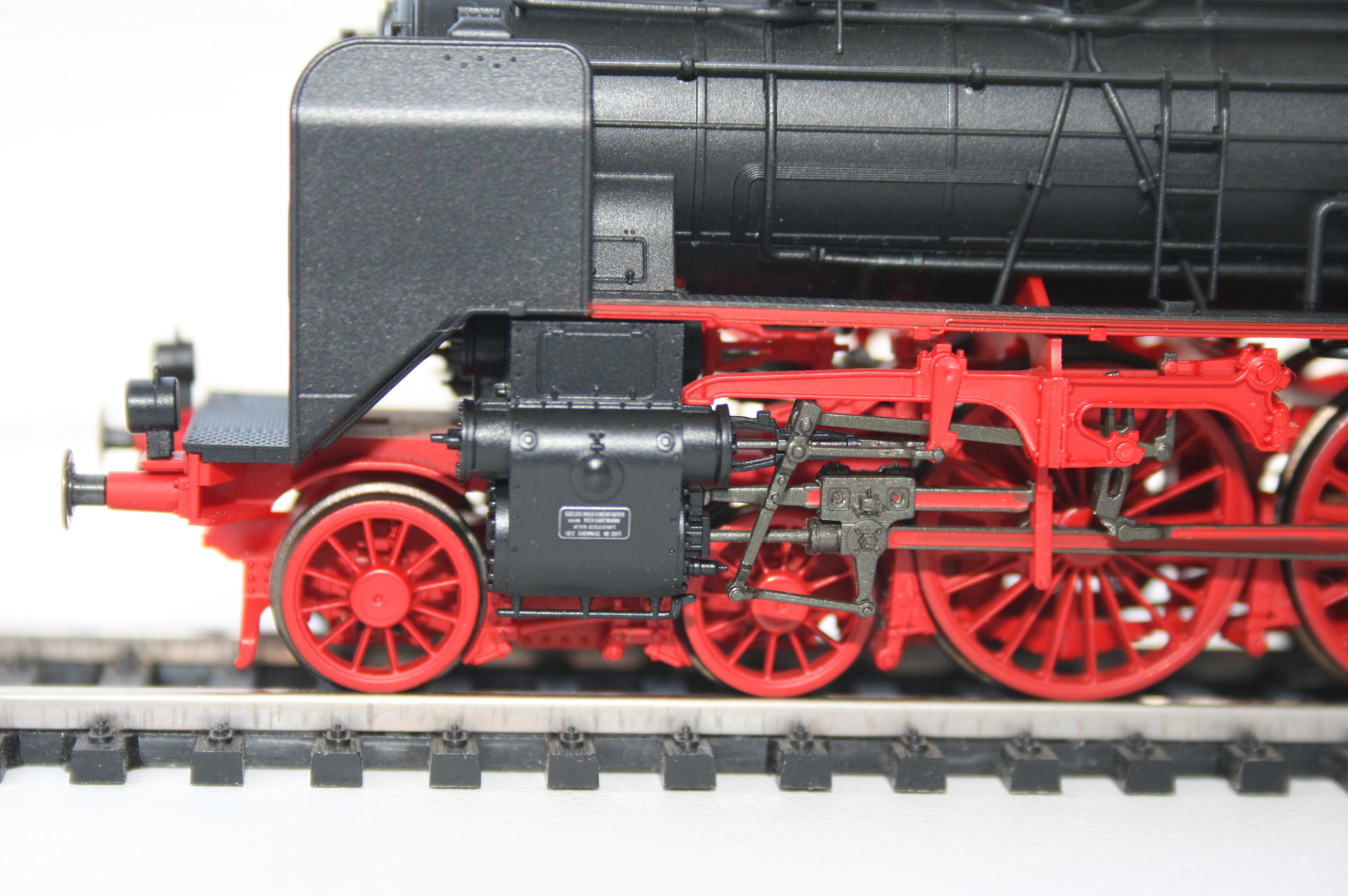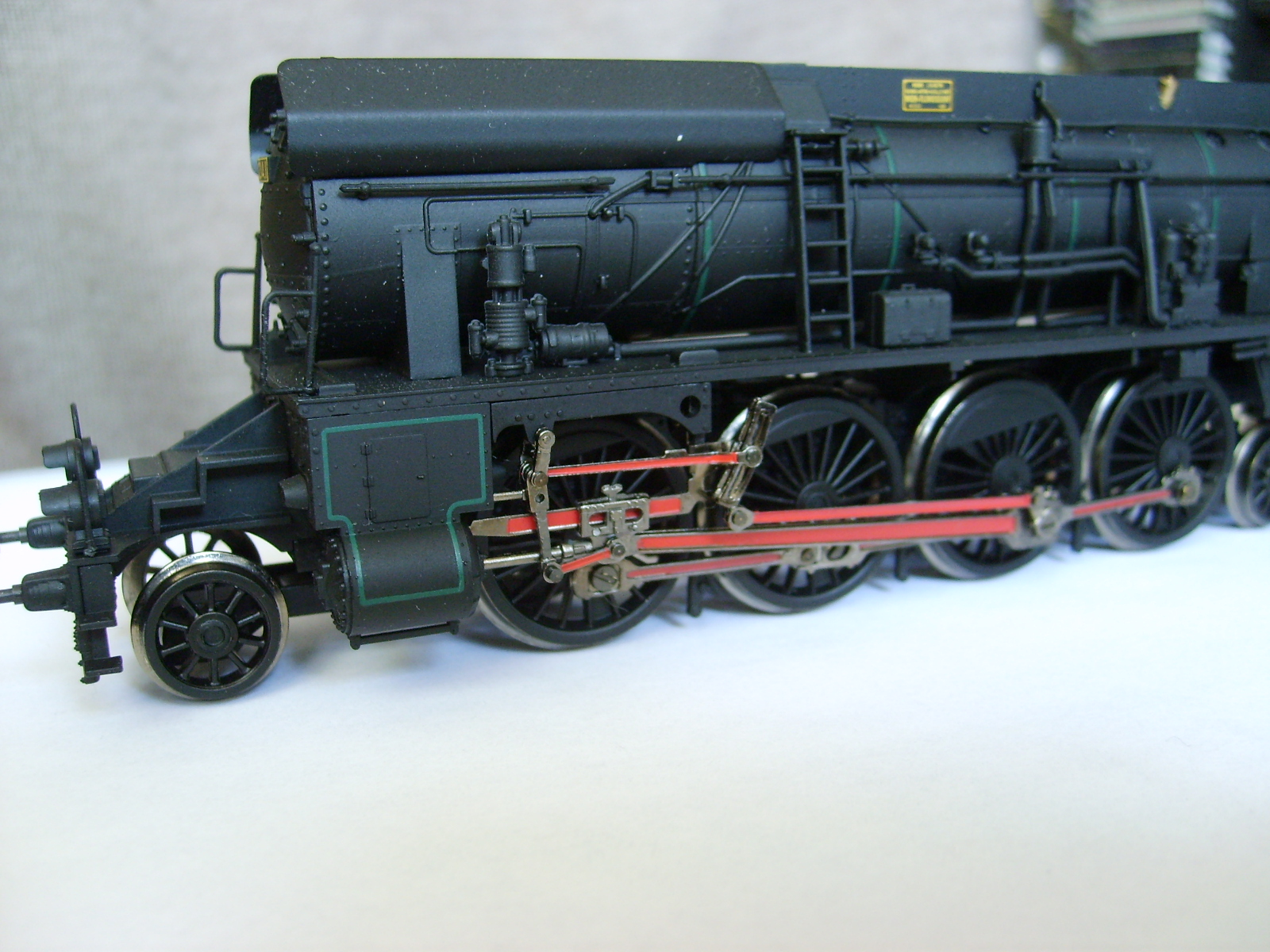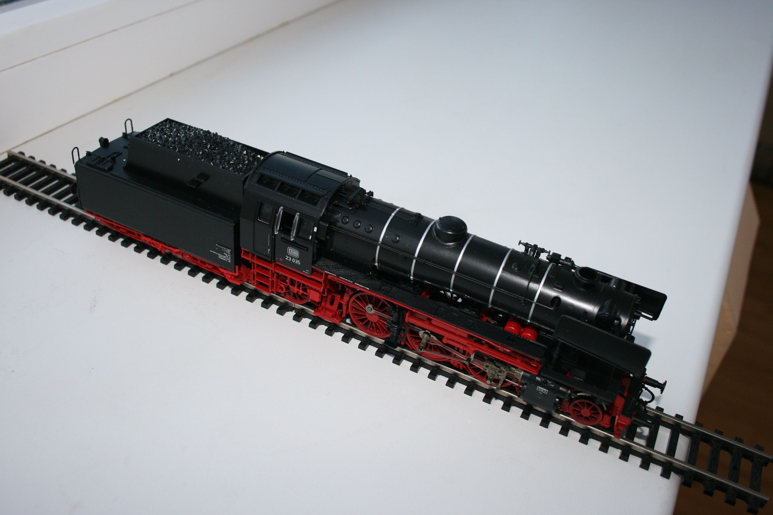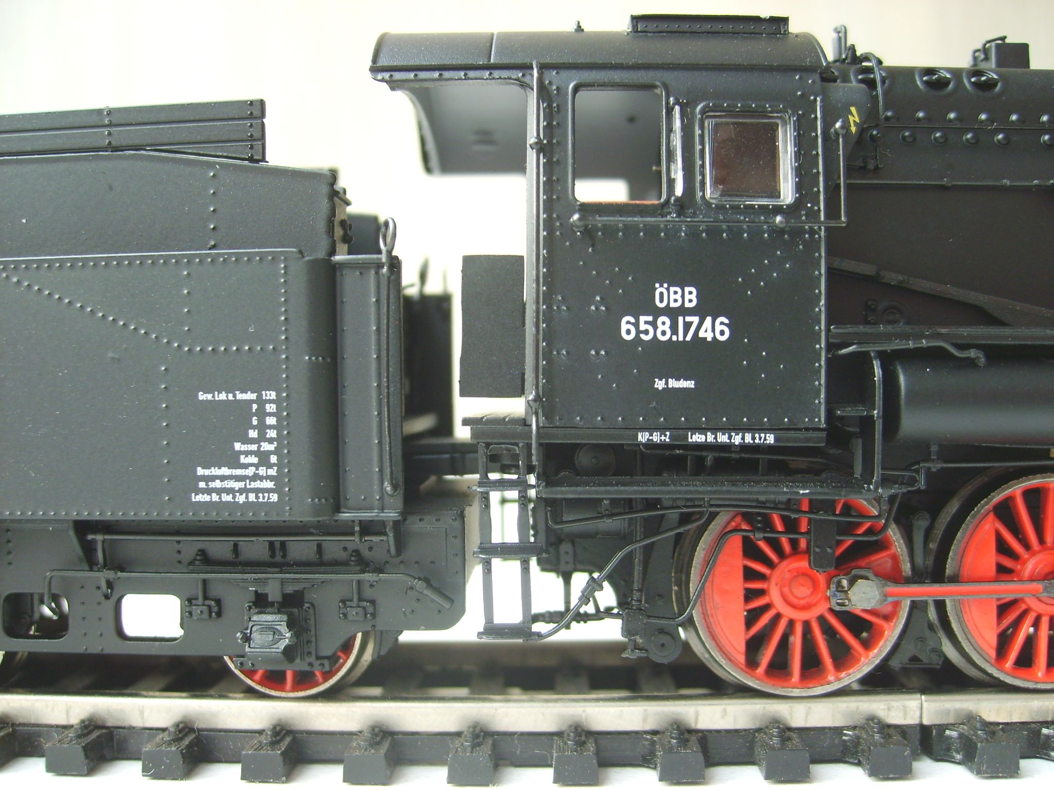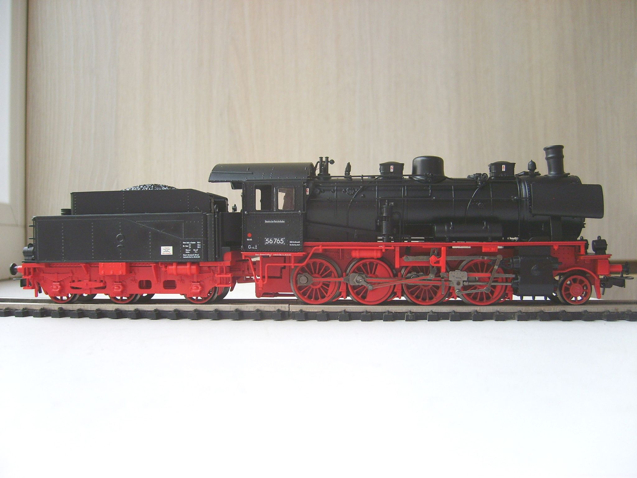 Модель такого переделанного из 55 в 56 паровоза выпускает фирма Лилипут. В данном случае принадлежности восточно-германских ж.д.. Если честно - на ходу ещё не пробовал, но сам локомотив тяжёлый, привод организован в паровозе, а тендер катается "прицепом". Сцеплен паровоз с тендером с помощью динамической сцепки, что позволяет сохранять минимальное расстояние между ними, в этой-же сцепке организована и передача питания с помощью разъёма. Свет организован уже на диодах, но его цвет можно будет определить только во время "ходовых испытаний". Деталировка очень хорошая - даже трубы песочниц сделаны отдельными деталями.