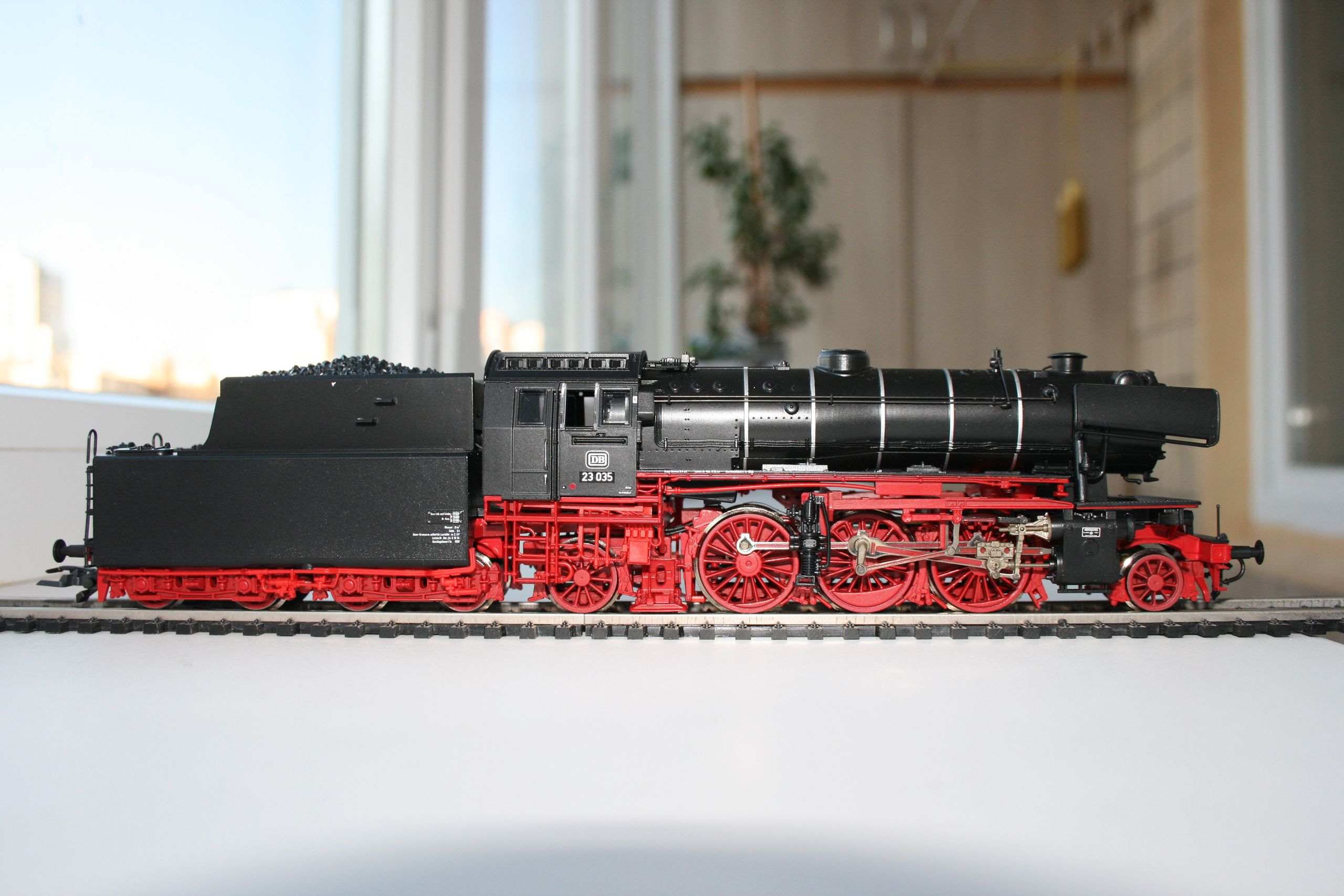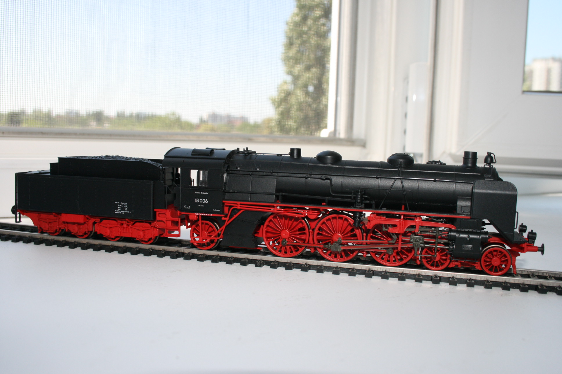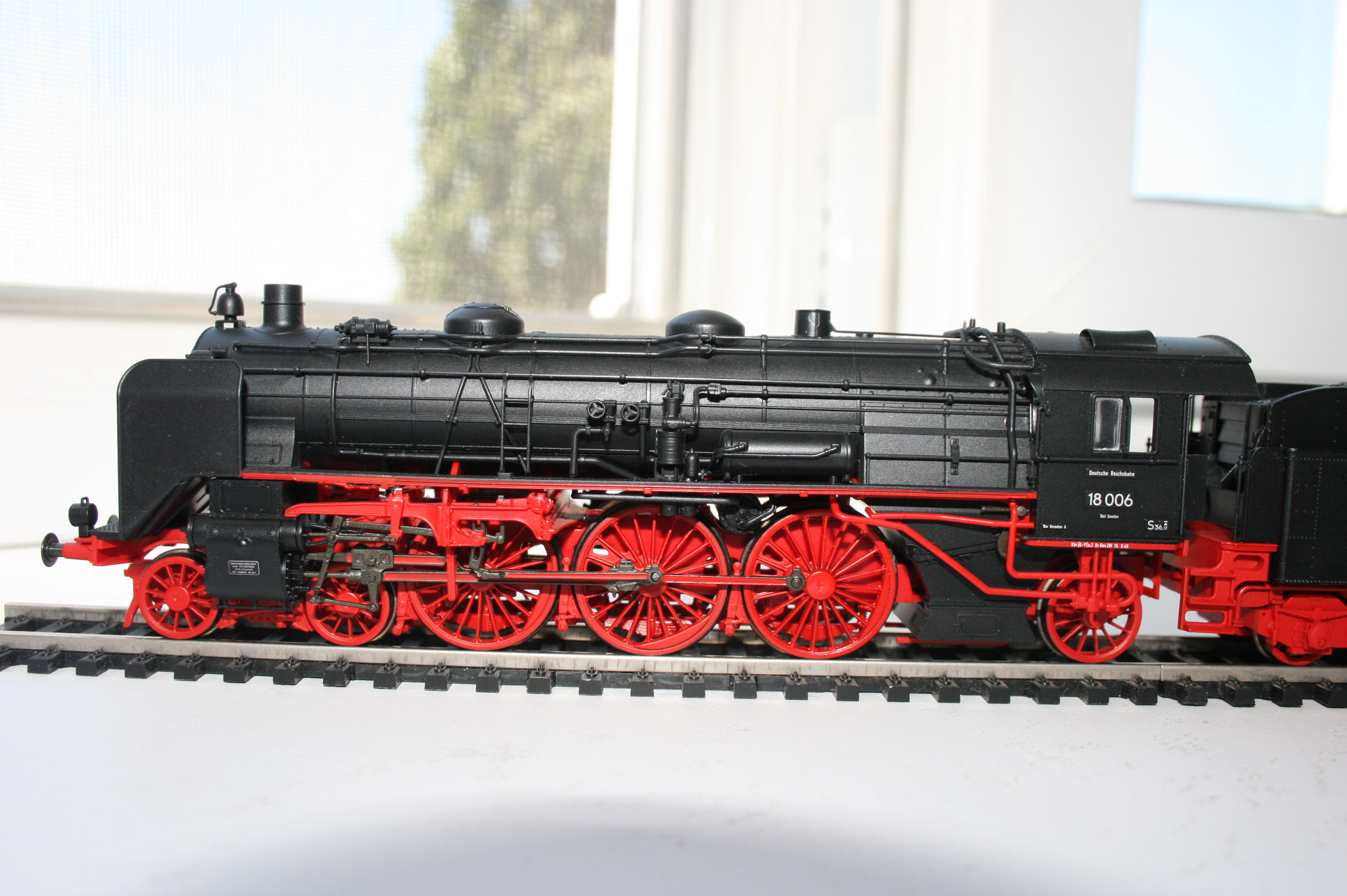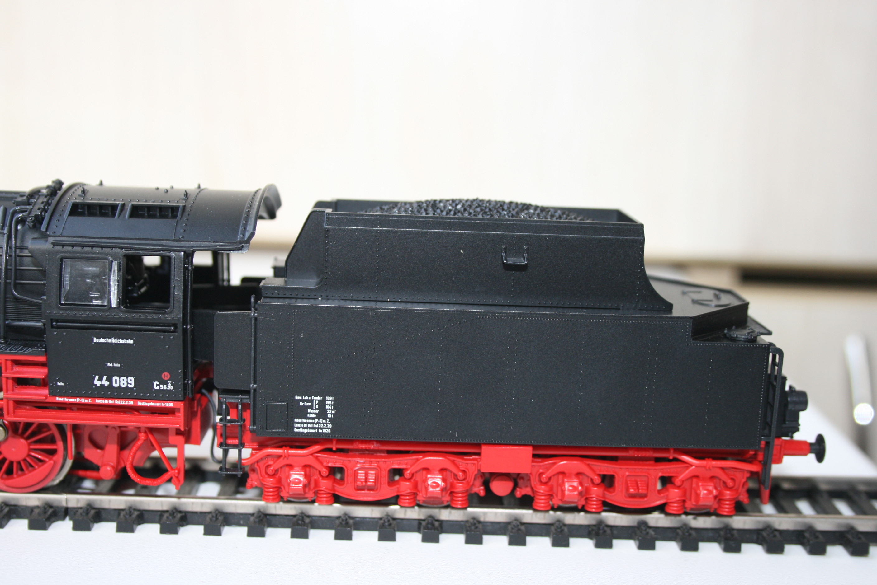 Модель такого переделанного из 55 в 56 паровоза выпускает фирма Лилипут. В данном случае принадлежности восточно-германских ж.д.. Если честно - на ходу ещё не пробовал, но сам локомотив тяжёлый, привод организован в паровозе, а тендер катается "прицепом". Сцеплен паровоз с тендером с помощью динамической сцепки, что позволяет сохранять минимальное расстояние между ними, в этой-же сцепке организована и передача питания с помощью разъёма. Свет организован уже на диодах, но его цвет можно будет определить только во время "ходовых испытаний". Деталировка очень хорошая - даже трубы песочниц сделаны отдельными деталями.