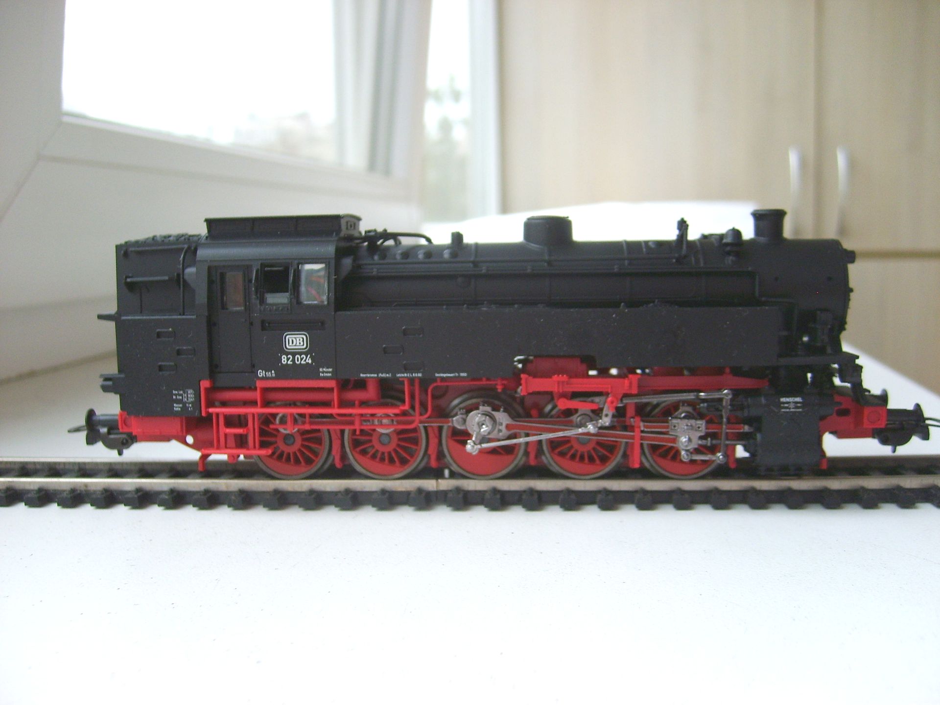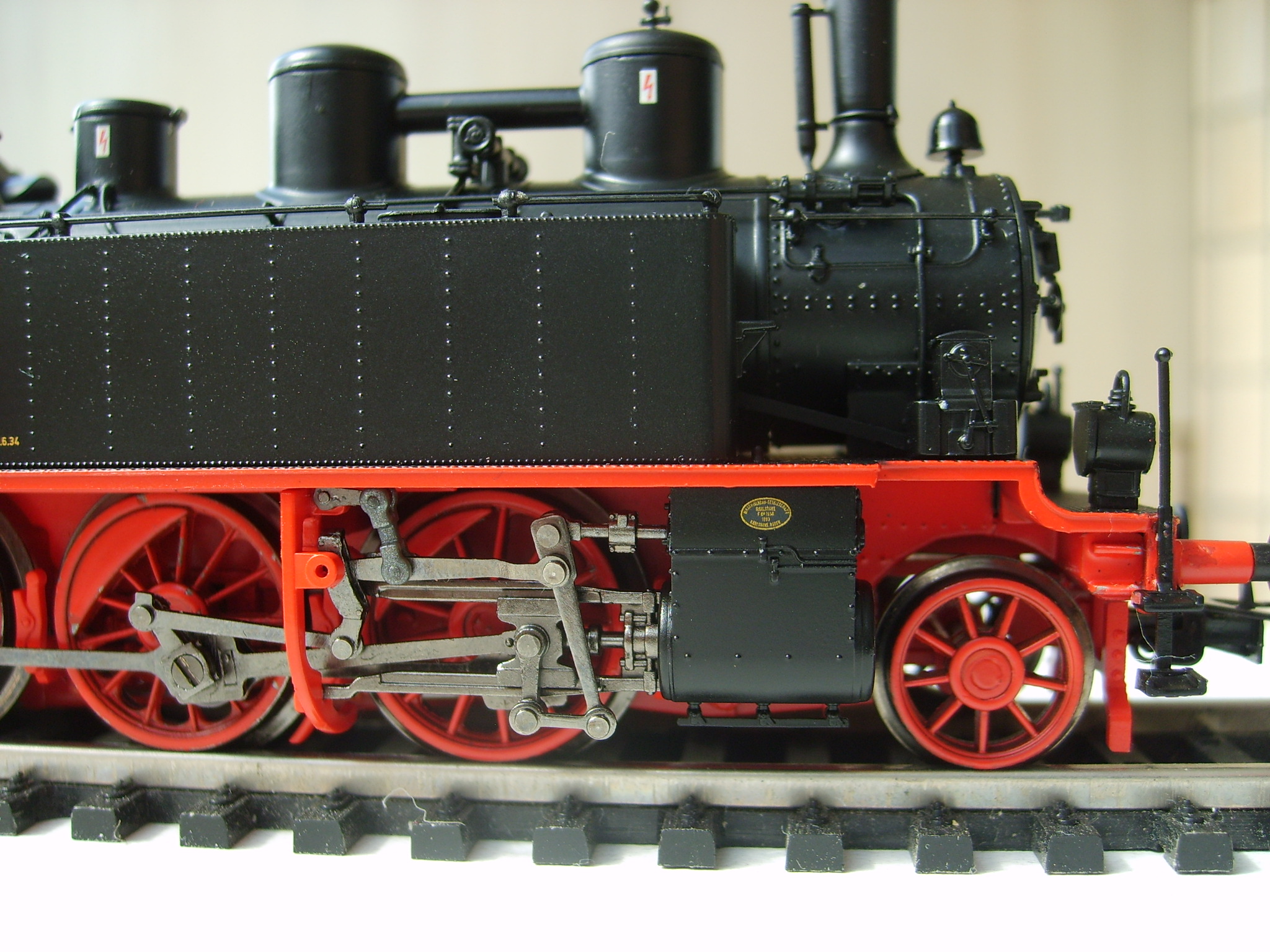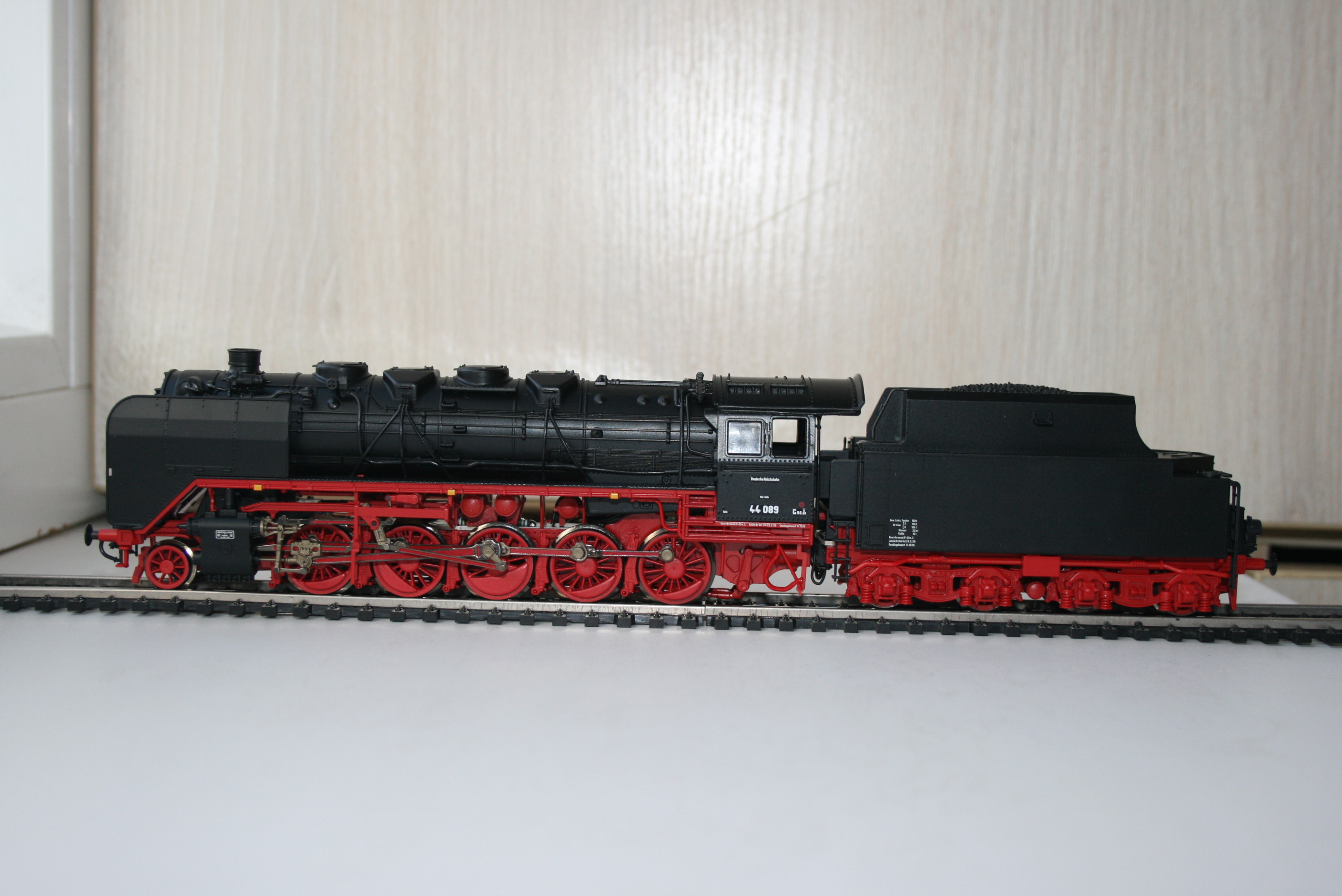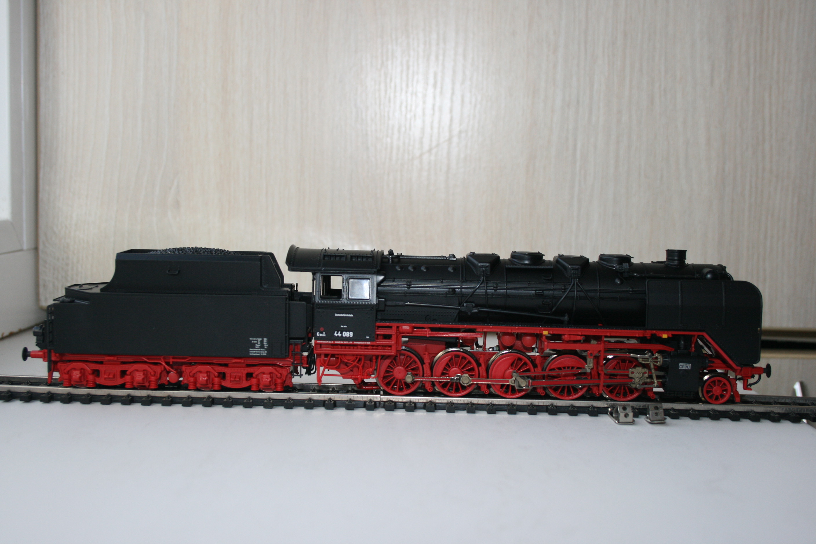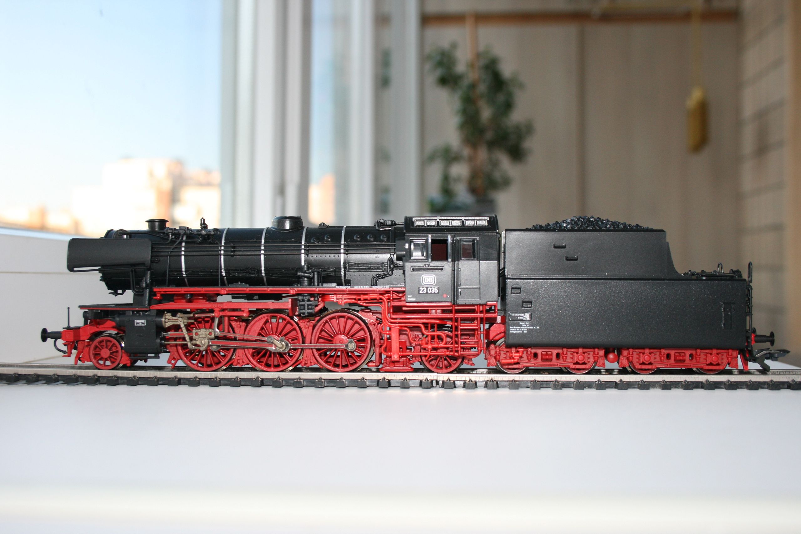 Модель такого переделанного из 55 в 56 паровоза выпускает фирма Лилипут. В данном случае принадлежности восточно-германских ж.д.. Если честно - на ходу ещё не пробовал, но сам локомотив тяжёлый, привод организован в паровозе, а тендер катается "прицепом". Сцеплен паровоз с тендером с помощью динамической сцепки, что позволяет сохранять минимальное расстояние между ними, в этой-же сцепке организована и передача питания с помощью разъёма. Свет организован уже на диодах, но его цвет можно будет определить только во время "ходовых испытаний". Деталировка очень хорошая - даже трубы песочниц сделаны отдельными деталями.