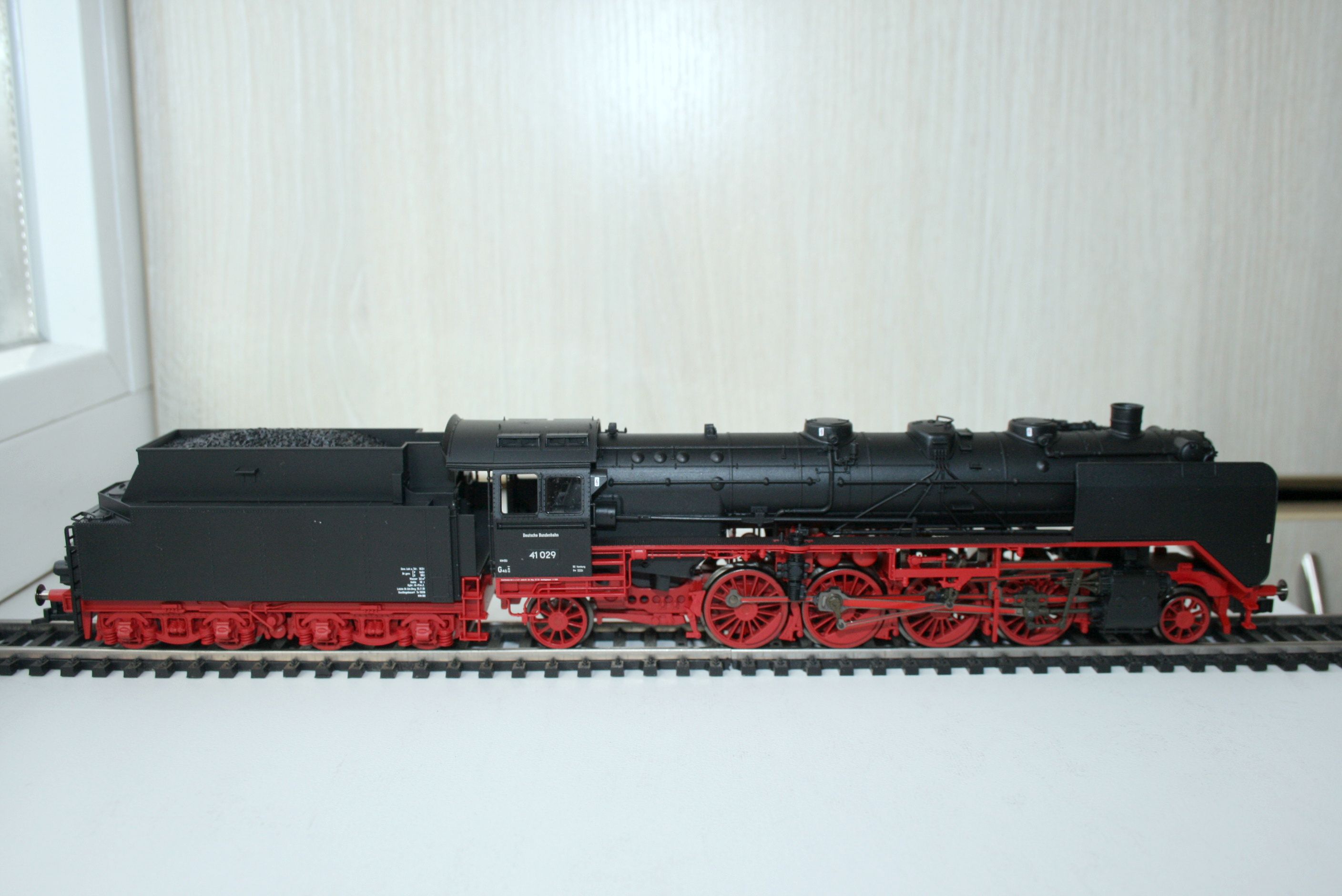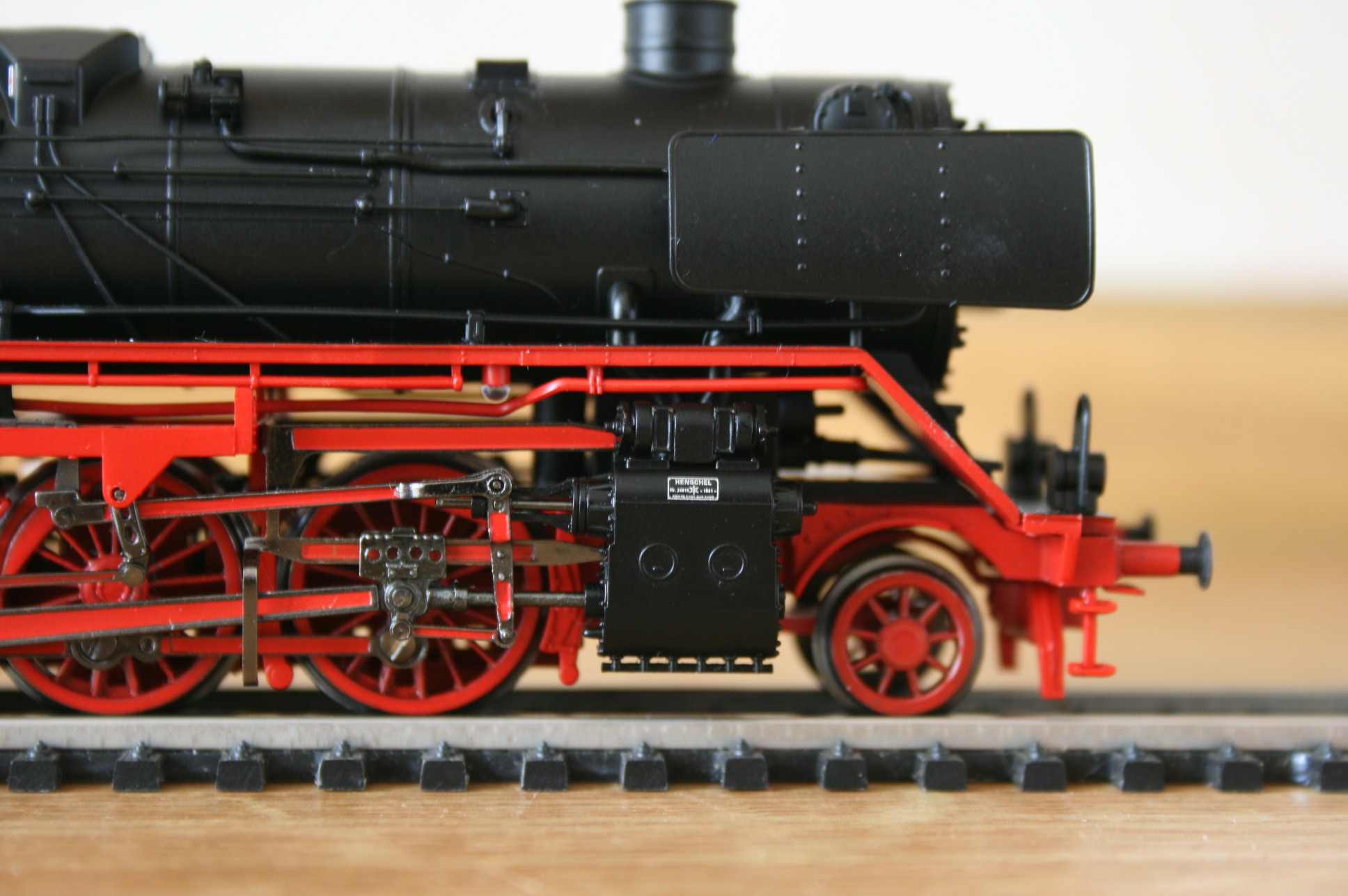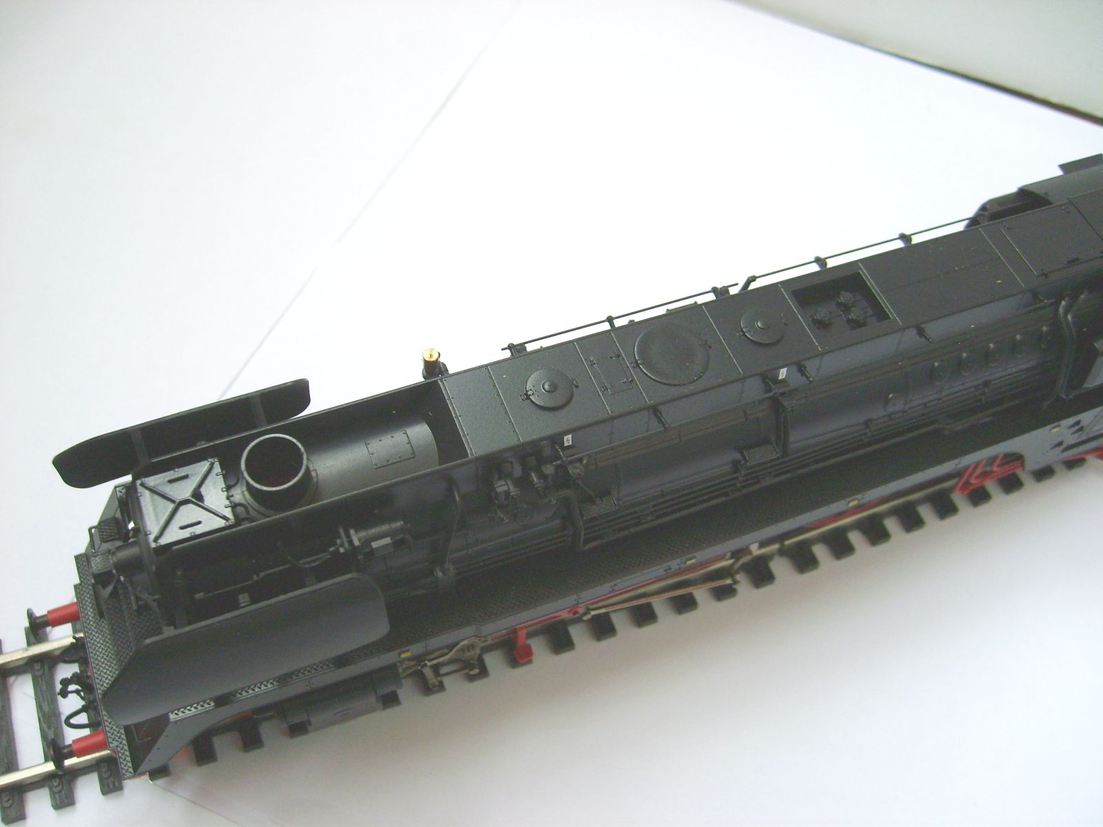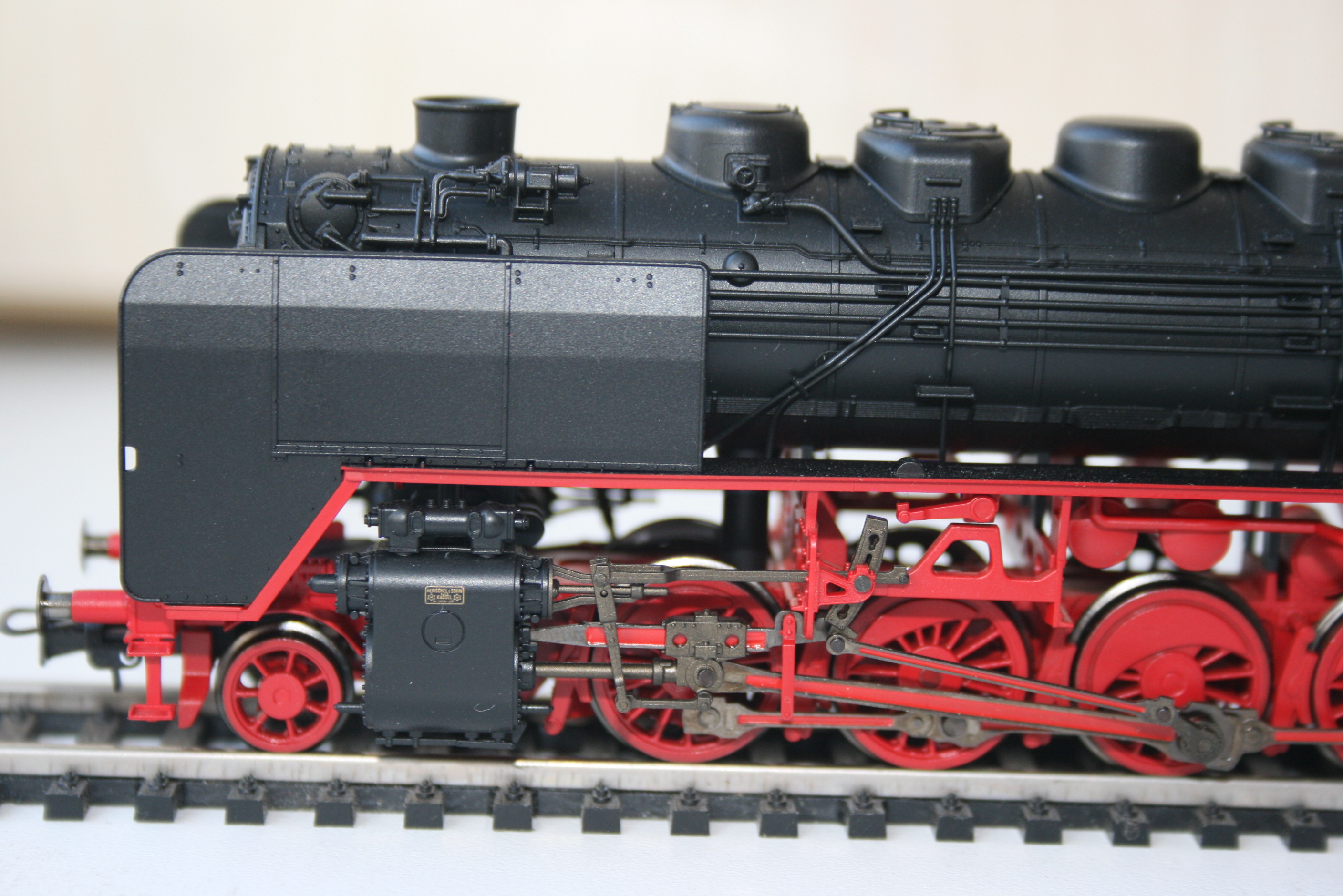Модель фирмы Piko появилась на свет в 1994 году, поэтому деталирована лучше, чем более ранние 01.5, reko 41 или 52.19-20 - многие трубопроводы установлены отдельно. Представляет из себя выпущенный Хеншелем (что видно по табличке и соответствует номеру) паровоз, на котором уже установлен в левом водяном баке водоподогреватель, а положение буферных фонарей соответствует фабричному. Часть мелочёвки не установлена, включая трапики к угольному ящику. А в общем модель оставляет неплохое впечатление. Единственная претензия - слишком большие отверстия под навесное оборудование. Просто защёлкнуть не удастся - придётся клеить.