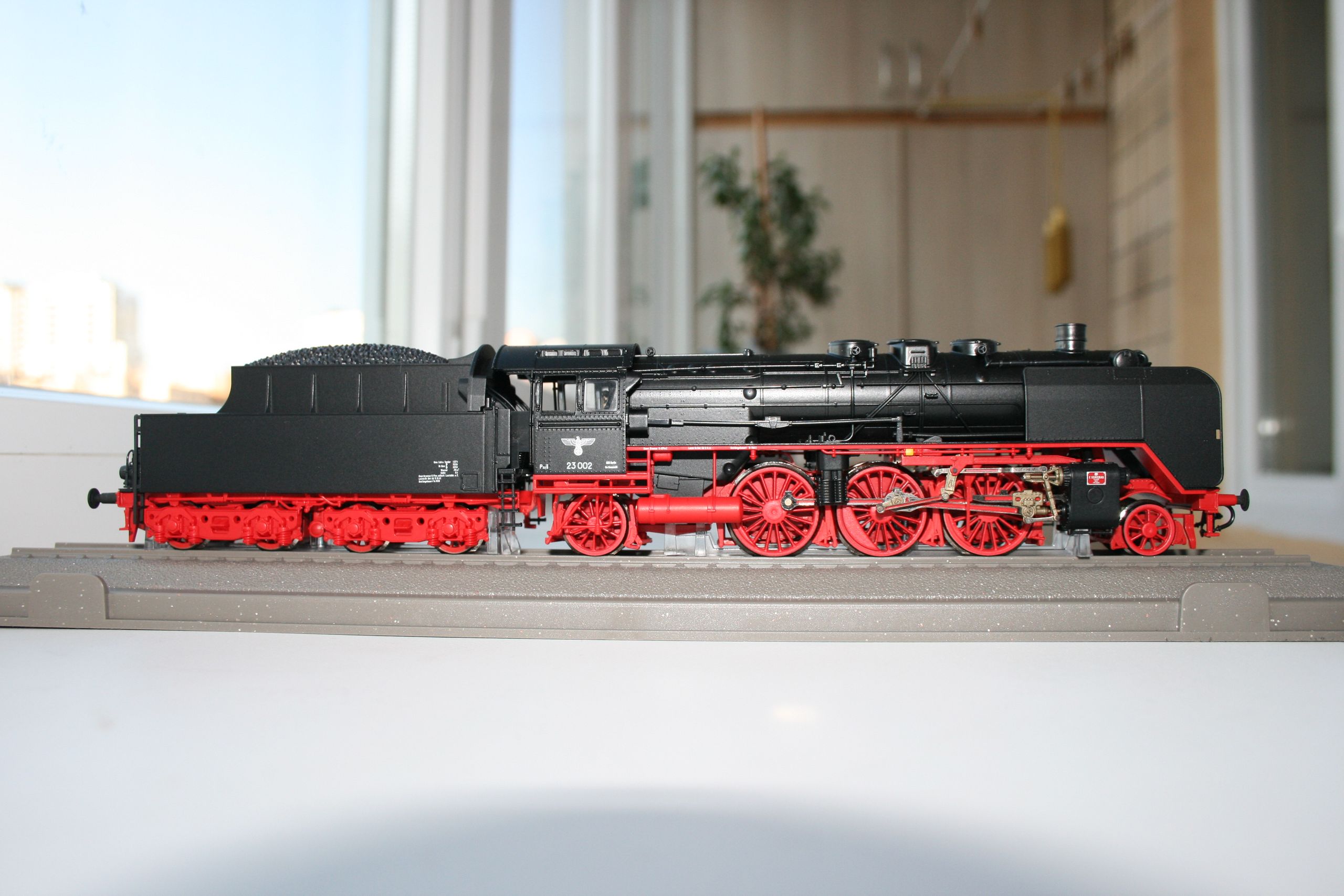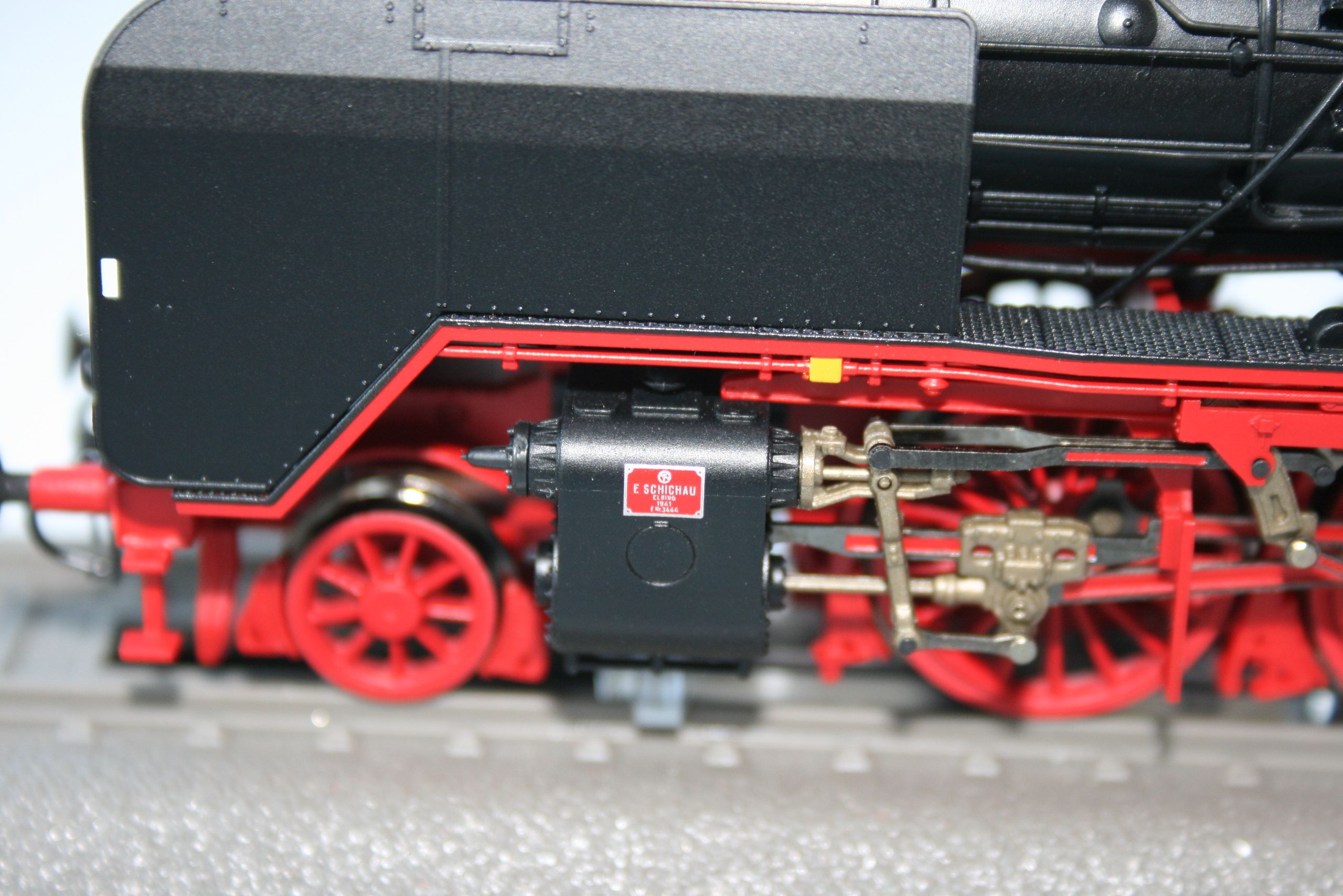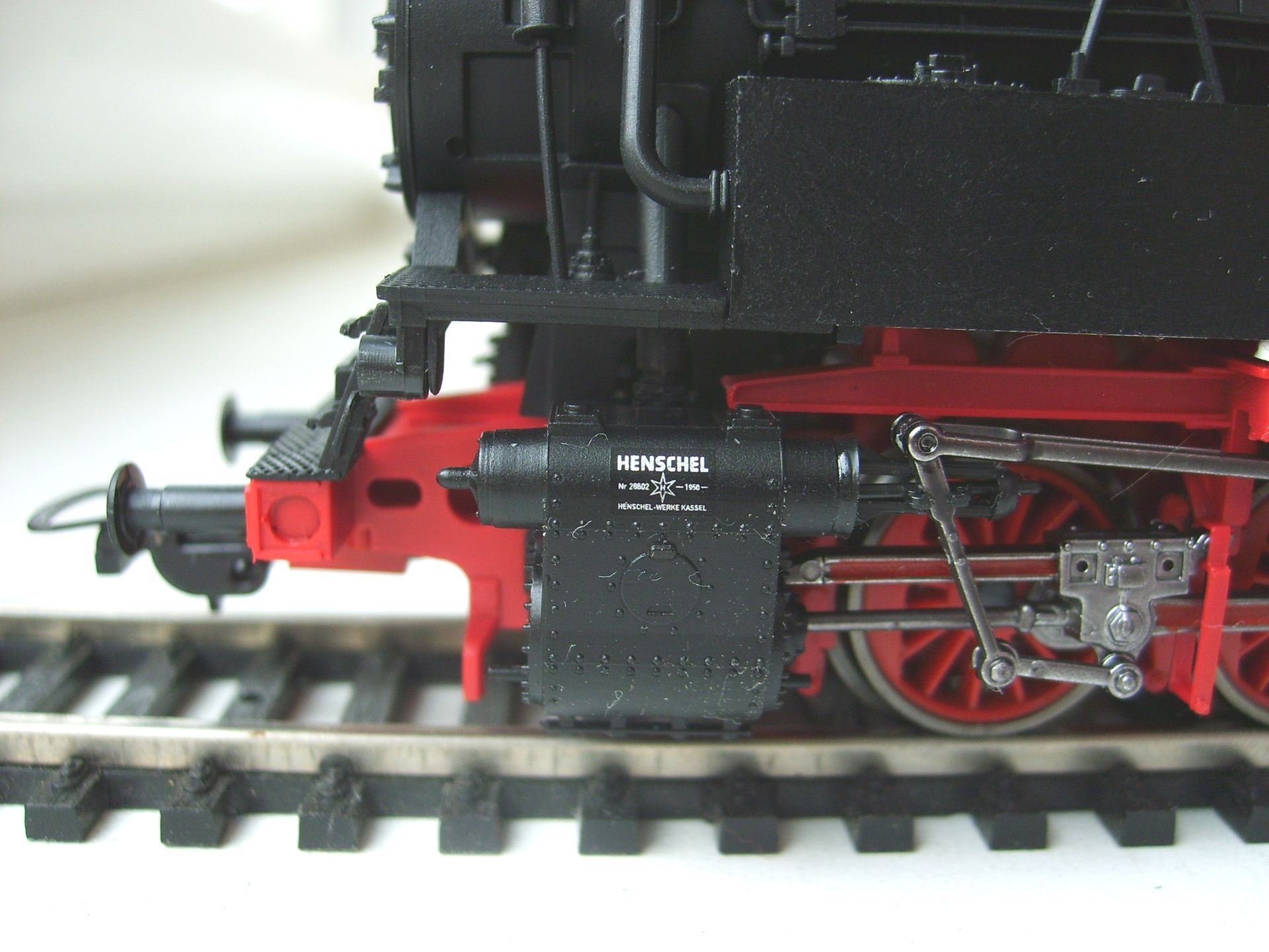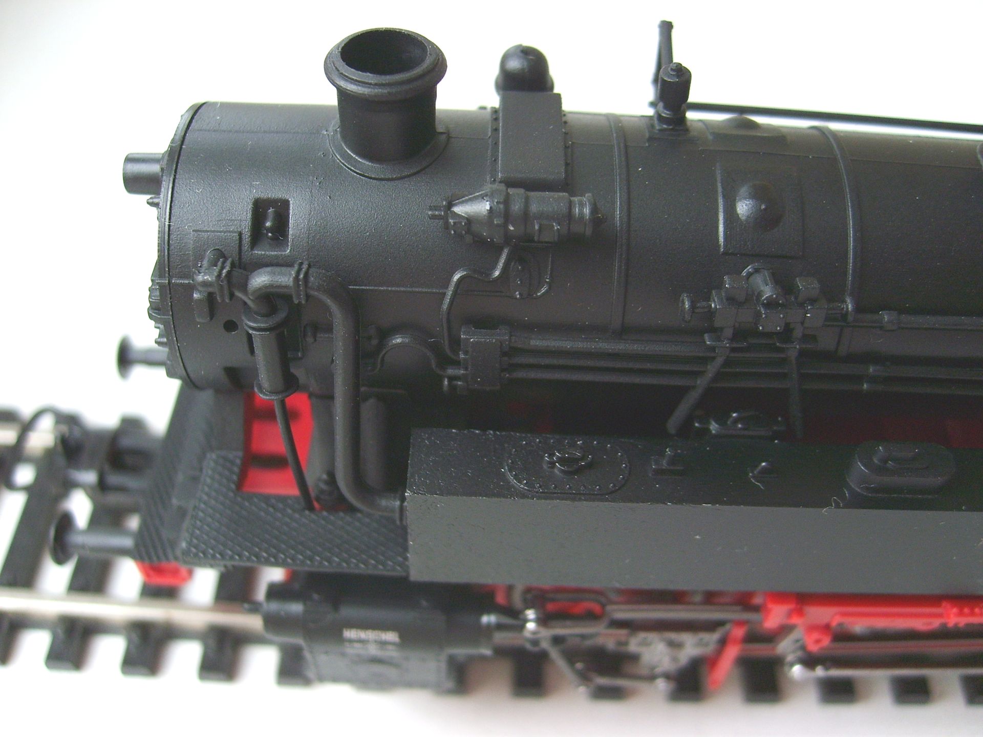 Модель фирмы Piko появилась на свет в 1994 году, поэтому деталирована лучше, чем более ранние 01.5, reko 41 или 52.19-20 - многие трубопроводы установлены отдельно. Представляет из себя выпущенный Хеншелем (что видно по табличке и соответствует номеру) паровоз, на котором уже установлен в левом водяном баке водоподогреватель, а положение буферных фонарей соответствует фабричному. Часть мелочёвки не установлена, включая трапики к угольному ящику. А в общем модель оставляет неплохое впечатление. Единственная претензия - слишком большие отверстия под навесное оборудование. Просто защёлкнуть не удастся - придётся клеить.