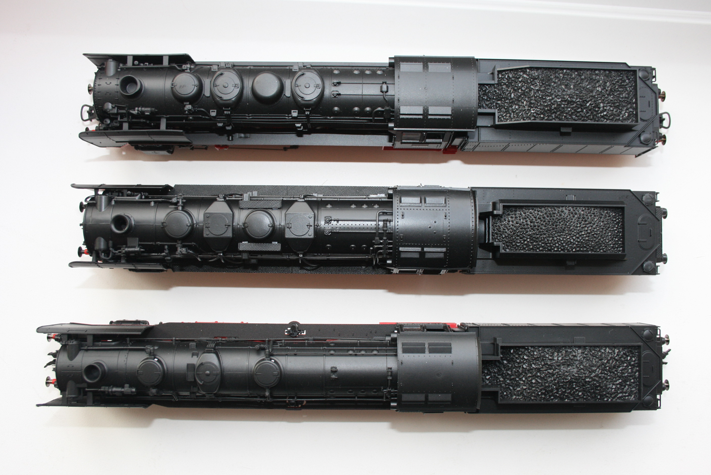 Касательно двух других моделей (Roco) - это паровозы, прошедшие после войны реконструкцию и получившие новые котлы, созданные с учётом всех достижений того времени. Каждая из дирекций (DB и DR) разработала свой проект модернизации, в результате чего внешний вид паровоза существенно изменился: у паровоза DB полностью поменялась передняя часть в районе буферного бруса и дымовой коробки, а песочницы перенесены с верхней части котла в район продольных трапов; у паровоза DR продольные трапы перенесли выше, установили дисковые движущие колёса, по верху котла поставили обтекатель парового колпака и песочниц, тянущийся от трубы до будки, установили частичный обтекатель вдоль всего продольного трапа от буферного бруса до будки, насосы перенесли в район бегунковой тележки, сделали коническую крышку дымовой коробки, вписав в неё прожектор, серия была изменена на 01.5. Особенно удалась модернизация ГДР (это признавали даже западные немцы), правда впоследствии обтекатели убрали и дисковые колёса поменяли на спицевые. У всех моделей тендеры 2'2'T34.