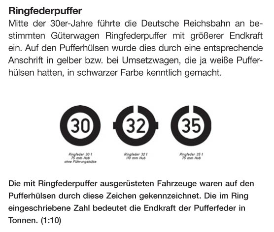 Mitte der 30er-Jahre führte die Deutsche Reichsbahn an bestimmten Güterwagen Ringfederpuffer mit größerer Endkraft ein. Auf den Pufferhülsen wurde dies durch eine entsprechende Anschrift in gelber bzw. bei Umsetzwagen, die ja weiße Pufferhülsen hatten, in schwarzer Farbe kenntlich gemacht.