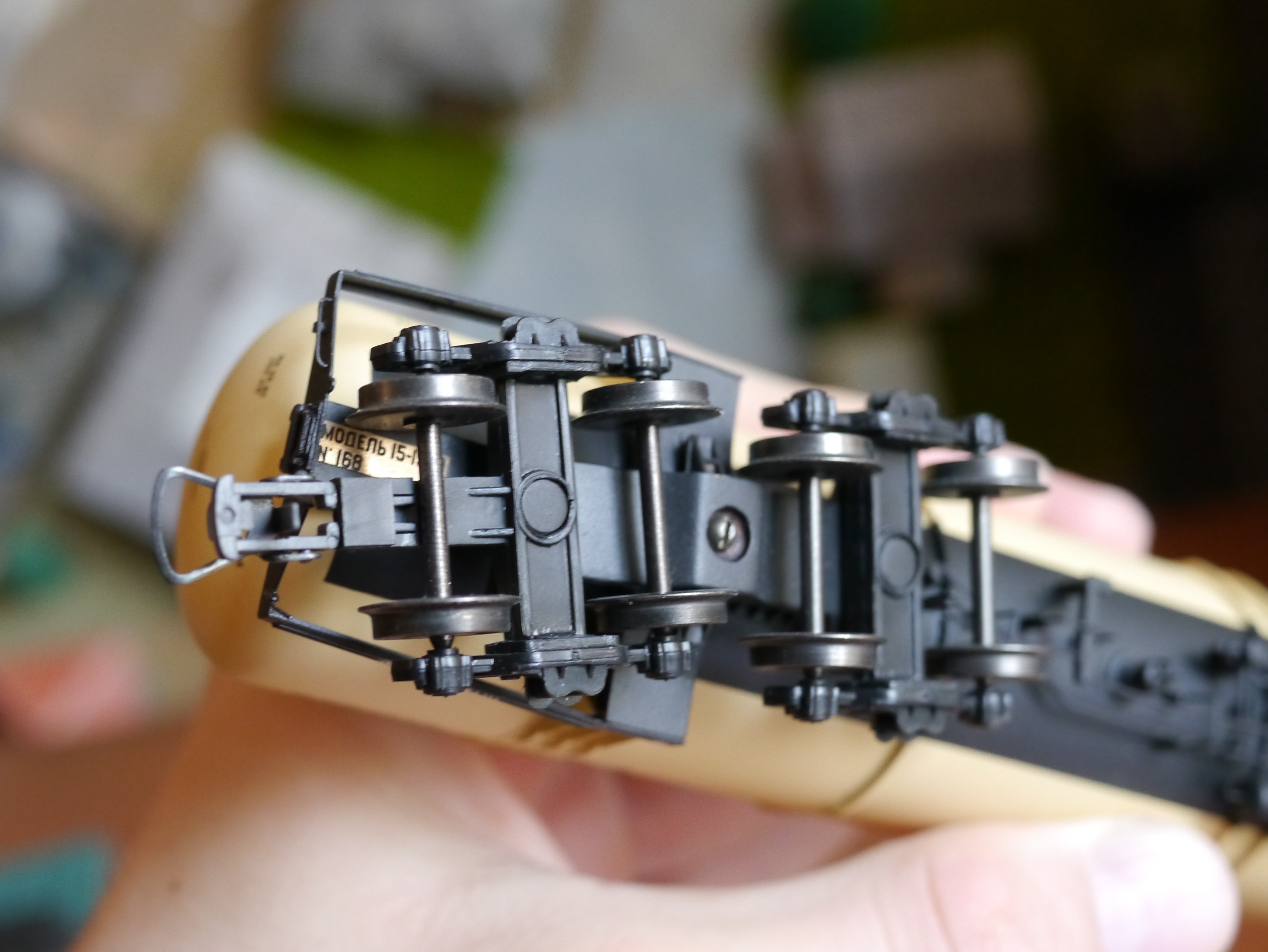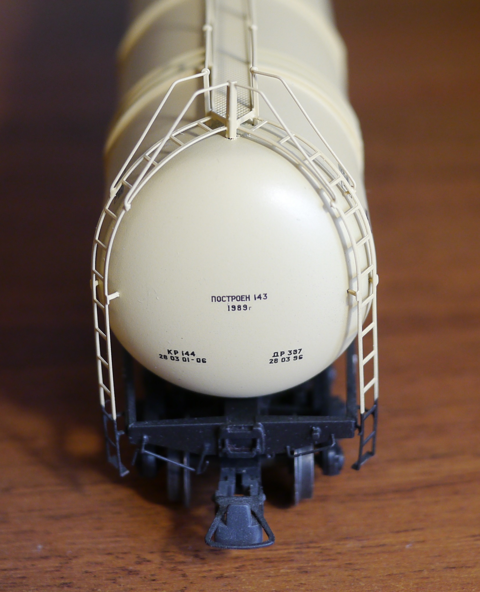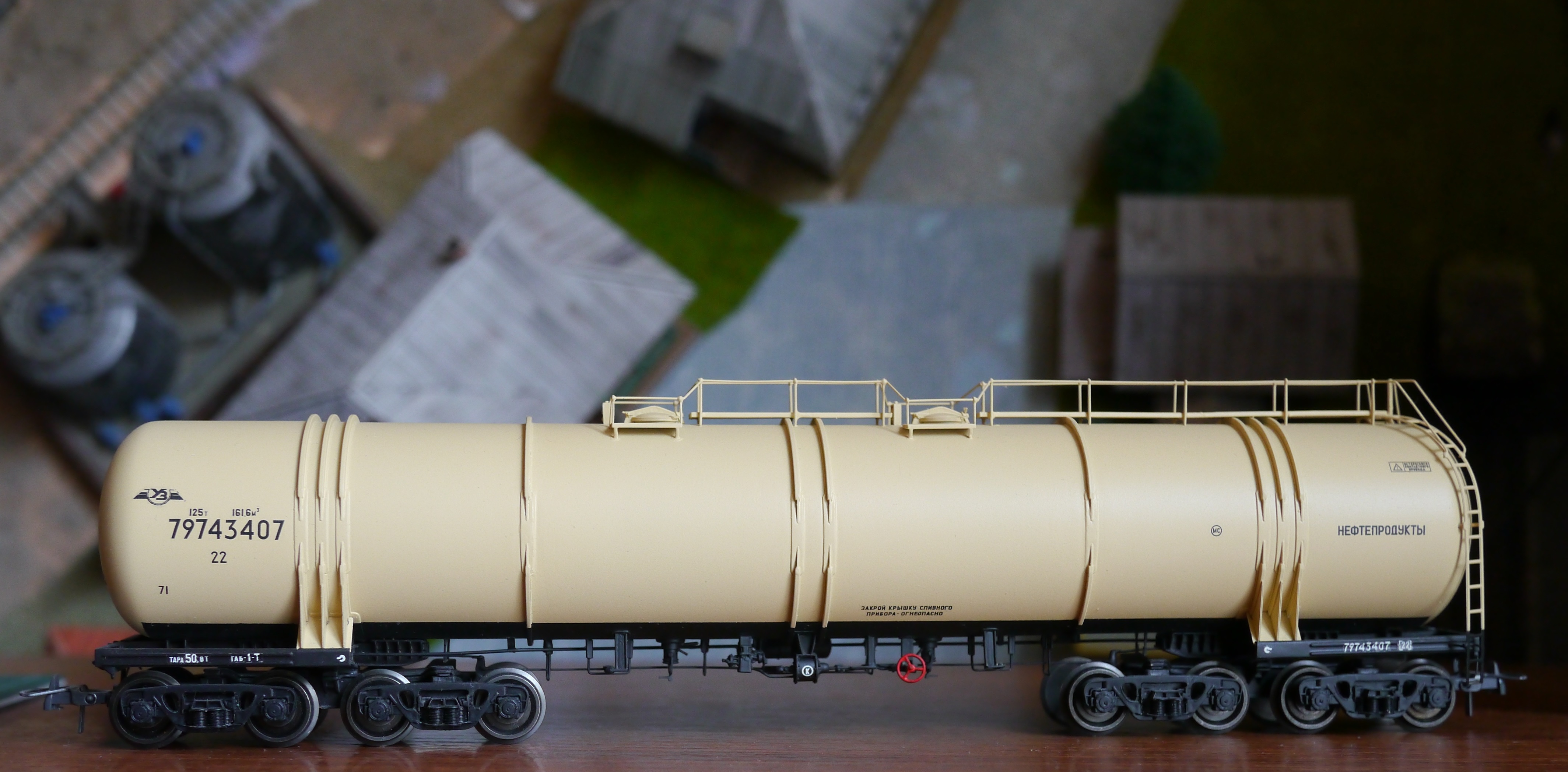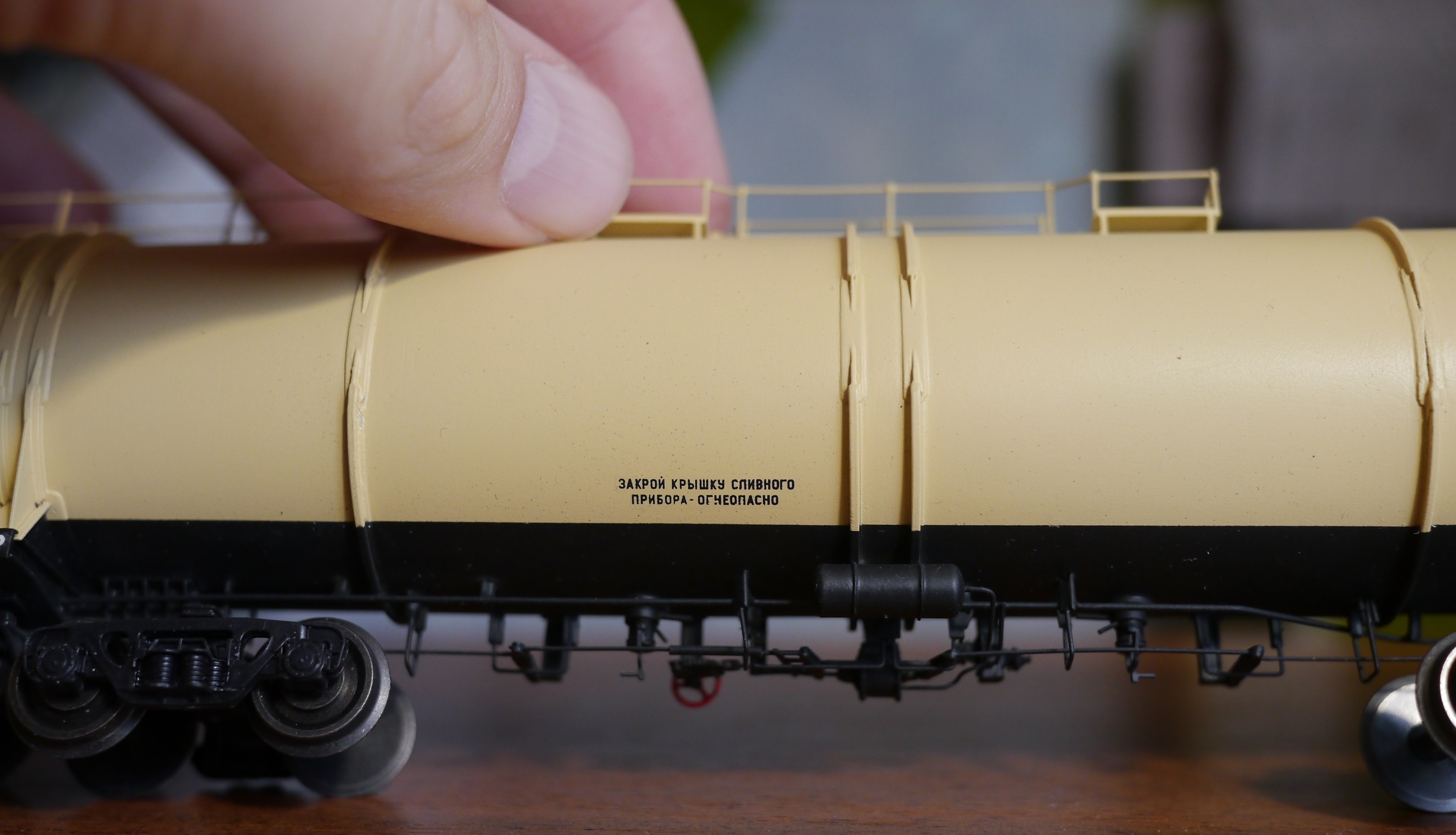 Вагон сделан достаточно прочно - ничего не гнется, если берешь в руки. Модель можно перевернуть и смело поставить на поручни. Отмечу, что у меня есть еще одна модель от "Онеги" - то же самое, прочные металлические накладные. Цистерна хорошо ходит, в том числе в Р2 и по стрелкам. Хороший накат.