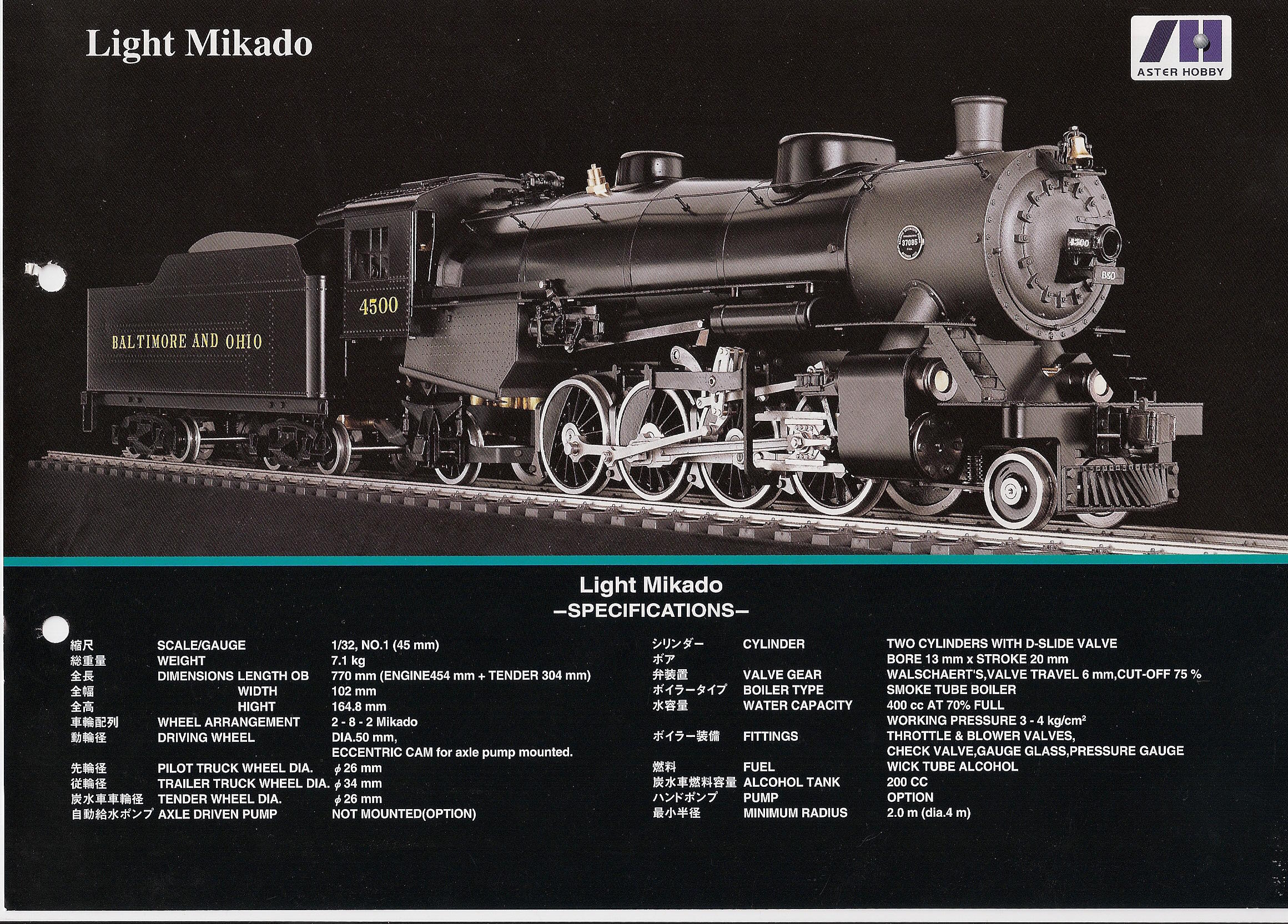 Предварительные испытания показали, что USRA Light Mikado может легко справиться с 30 - 40 вагонами на стандартных уклонах. Модель плавно шла на низкой скорости с малой нагрузкой, но характерный звук отсечки паровой машины особенно радовал слух при работе с тяжелым составом. Обычно комплекты Aster включают детали с окончательной отделкой, однако данный кит поставлялся с наборами 50-ти наклеек номеров и обозначения дорог, где эксплуатировался прототип.