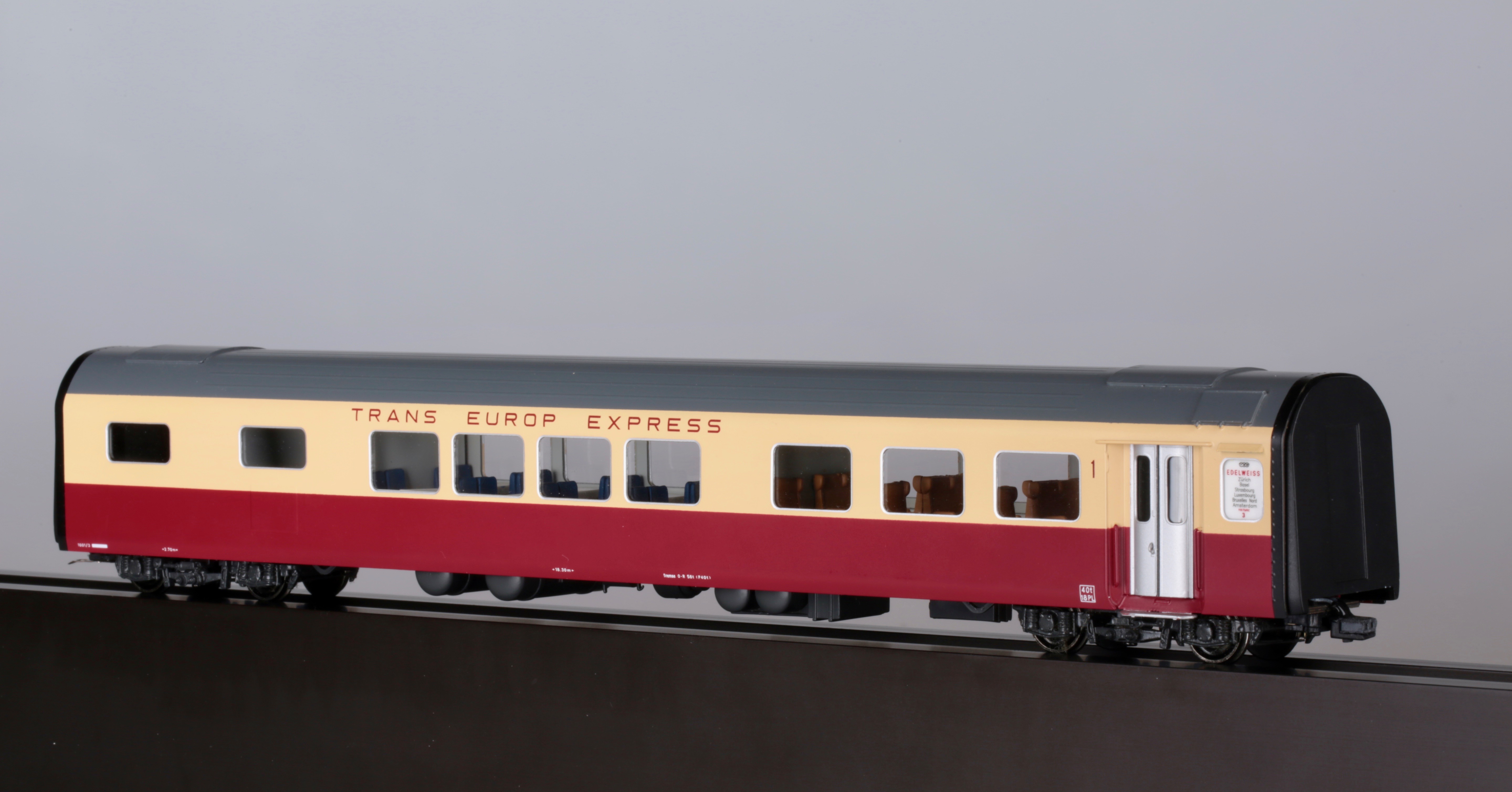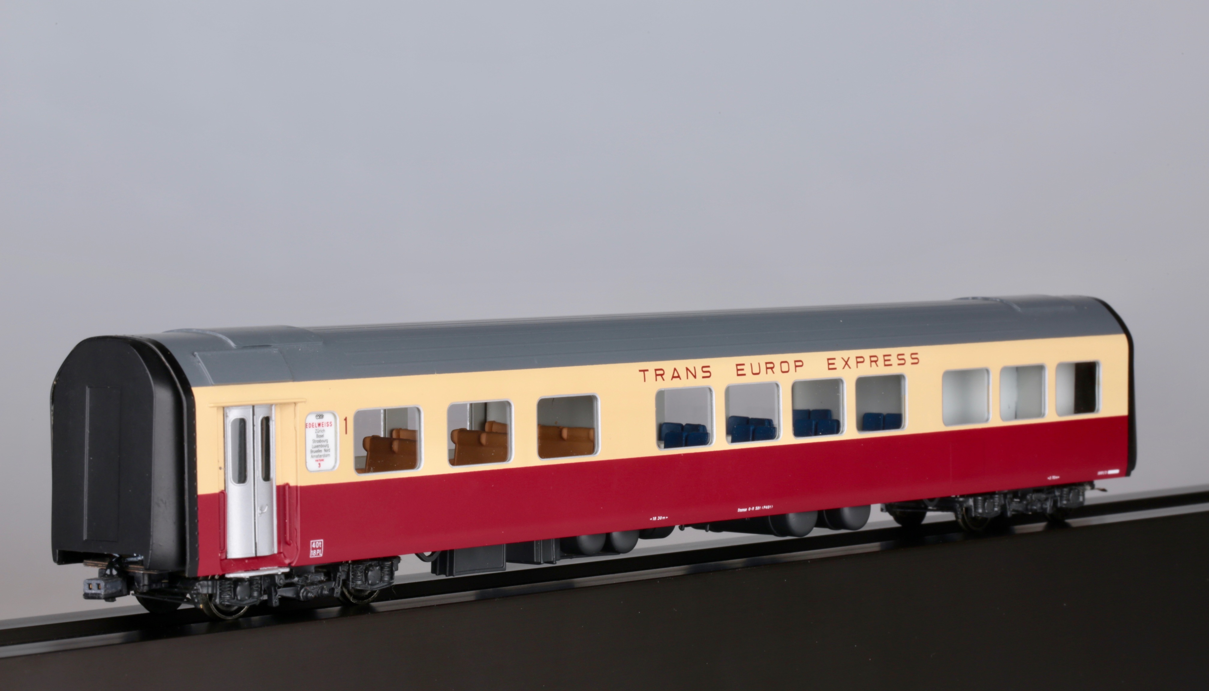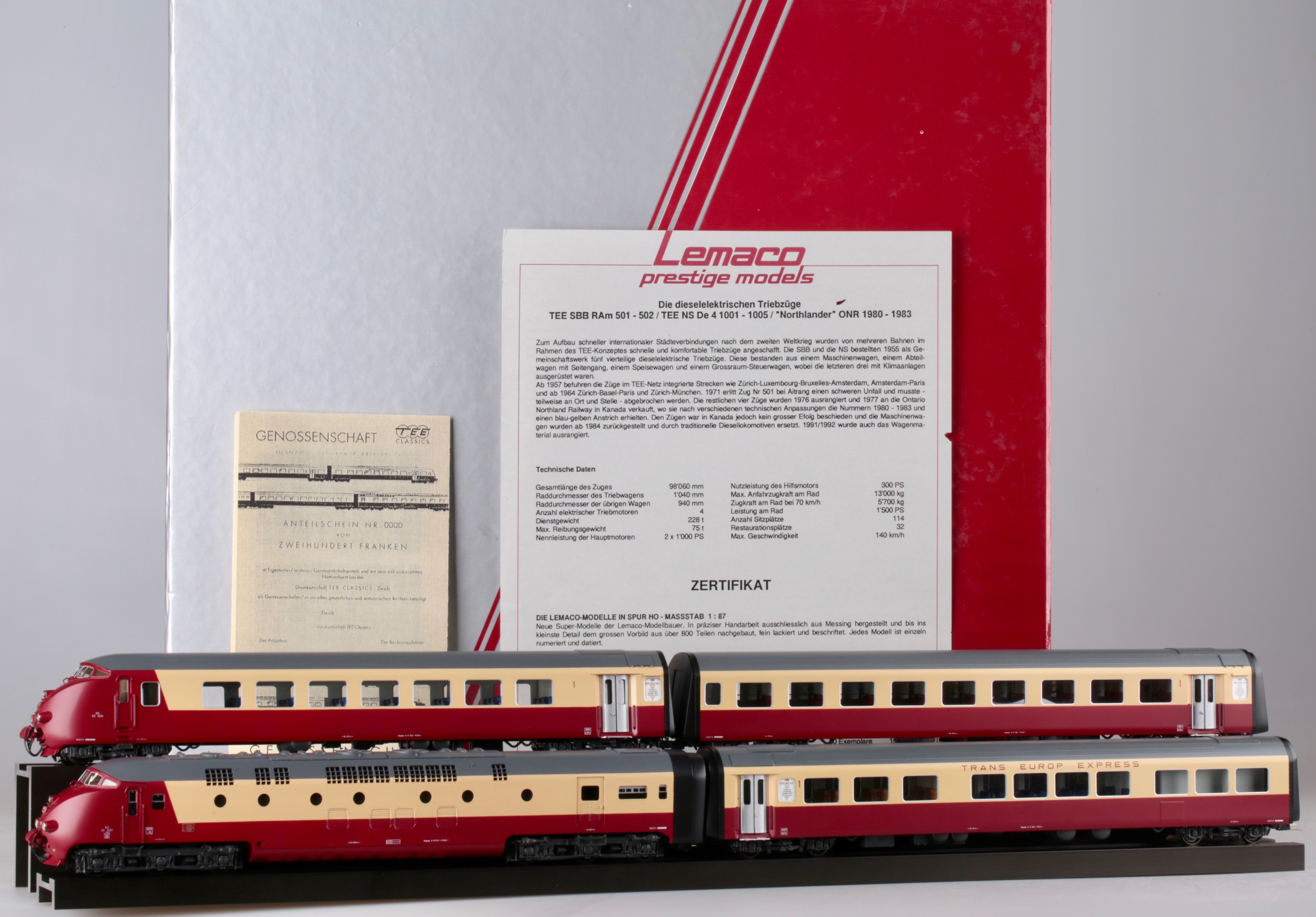 Хочу представить, как всегда совершенно редкую, латунную модель, которая вызывает огромный интерес у многих коллекционеров.Но все беда в том, что найти ее практически невозможно,а если выпадает такое счастье и находится подобная модель ,но с другим артикулом, ( там экземпляров в несколько раз больше чем у меня )покупатели с обезумевшими глазами, от свалившегося на них такого счастья, выкладывают 5000 долларов США.Одним словом-"моя прелесть". Завидуйте молча, оваций не надо, модель скоростного дизель поезда NS DE 1001 TEE Эдельвейс, Art HO-056/1, от великолепной швейцарской компании Lemaco,изготовлена в 1995 году-всего 15 экземпляров.Длина поезда-1135мм,вес-1кг 814 гр, проходит идеально радиус -540 мм, современное светодиодное освещение в вагонах.