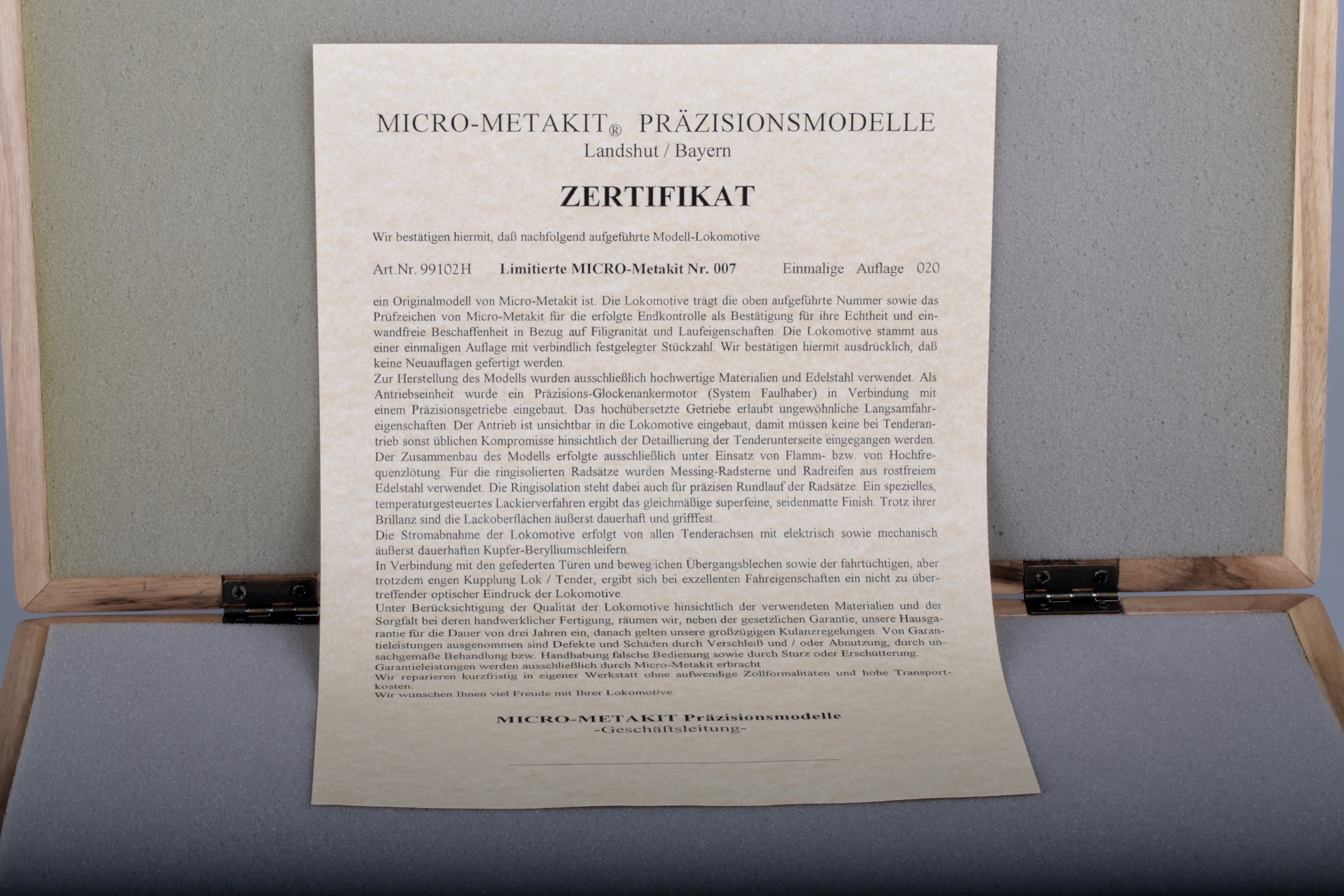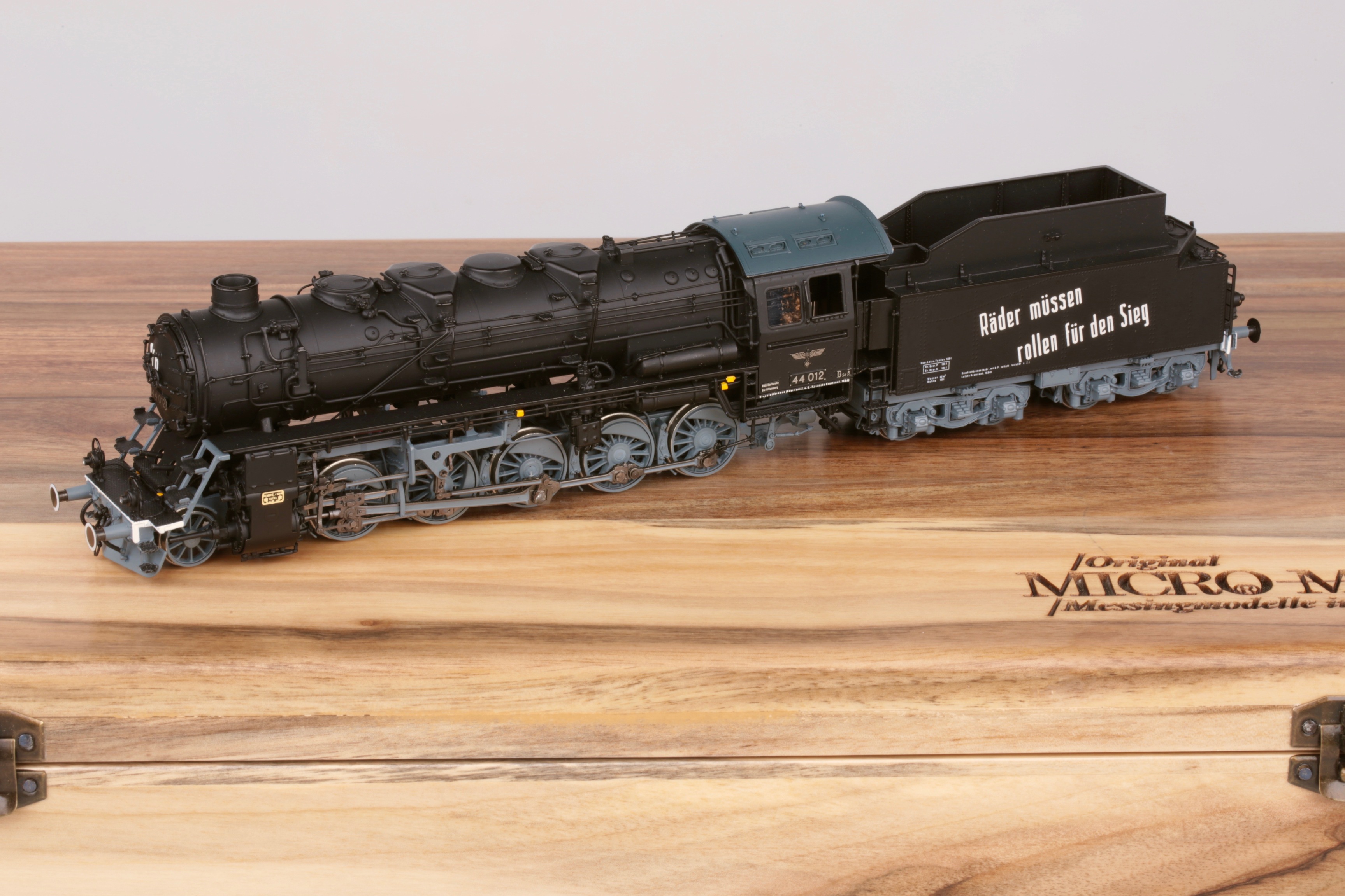 Представляю модель, германского грузового паровоза BR 44 012 DRG от Micro Metakit.Art. 99102 H. Ограниченный тираж-20 экземпляров, изготовлена в 2000-м году.Всю эту полукилограмованную красоту грации и изящества,( а вес локомотива без тендера составляет-575 гр, плюс 175 гр.вес самого тендера) приводит в движение двигатель и редуктор фирмы Faulhaber, причем все усилие передаются только на одну ось, дабы каждый мог насладиться и полюбоваться копийностью и совершенством ходовой частью модели.Особого внимания заслуживает рама паровоза, выполненная в полном соотвествии с прототипом, а какая изумительная тормозная система, как впрочем и ПР механизм, низ тендера- просто соловьиная песня, да и все остальное просто изумительное, про цвет и покраску модели говорить вообще нечего- кто еще может похвастаться такой изумительной работой? Для того что бы истинные любители железнодорожных моделей, могли восхищаться несравненной красотой и техническим изяществом, специалистам Micro Metakit пришлось раскроить, собрать, а потом покрасить модель, состоящую из всего-то 1910 деталей.Конечно и просто необходимо, всю эту филигранную красоту дополнить упаковкой, хотя нет, слово упаковка здесь не подходит, как-то по мещански, скорее обрамить и подчеркнуть монументальность модели, что и было исполено.Модель нежится в футляре из массива ореха покрытого матовым лаком.( вес футляра-2 кг.) Не знаю, как кто, лично я просто восхищаюсь такой гармонией,посему предлогам всем насладиться модельным вальсом.