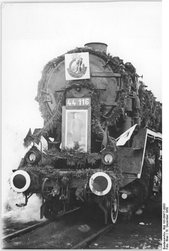 Illus Illner 18.12.50 Zum Monat der deutsch-sowjetischen Freundschaft. Freundschaftszug der DDR fährt in die Sowjet-Union. Zu Ehren des Geburtstages von Generalissimus Stalin fuhr am 17.12.1950 der Held der Arbeit, Oberlokführer Paul Heine, den 2500 Tonnen schweren Freundschaftszug von Leipzig über Halle - Magdeburg - Berlin - Frankfurt-Oder nach Brest-Litowsk. In Halle, Magdeburg und Halberstadt überreichten Delegationen der Reichsbahn Oberlokführer Heine Geschenke und Telegramme für Generalissimus Stalin. UBz: Die festlich geschmückte Lok des Freundschaftszuges.