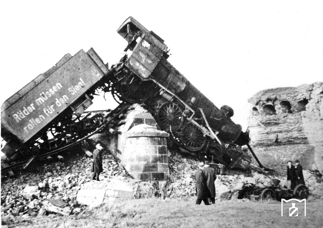 Im Herbst 1944 detonierte im Bw Münster eine alliierte Luftmine genau unter 50 2449 und türmte Lok und Tender zu einem bizarren Denkmal auf. Während die Durchgangsgleise durch den Einsatz von Kriegsgefangenen und Fremdarbeitern nach kurzer Zeit wieder befahrbar gemacht wurden, blieb 50 2449 noch bis zum Einmarsch der Engländer zu Ostern 1945 so stehen. Das Pressefoto von ihr ging anschließend um die Welt. Die Lok wurde nicht mehr repariert und ist als Kriegsschadlok 1946 ausgemustert worden. (03.04.1945) Foto: Pressefoto ACME