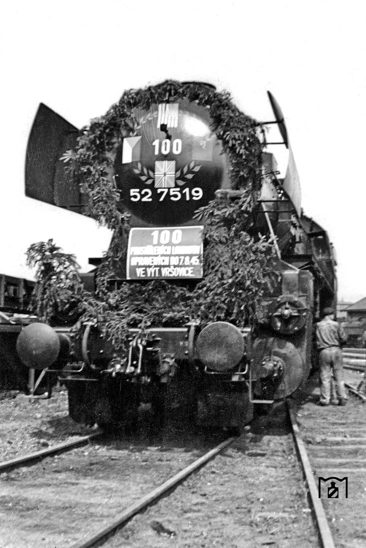Die im Oktober 1944 von den Skoda-Werke, Pilsen an die RBD Regensburg abgelieferte 52 7519 kam mit "viel Tamtam" nach Ende des Zweiten Weltkriegs wieder zurück in die Tschechoslowakei. Der Text auf der Rauchkammer lautet: "100. zerschossene und reparierte Lok in der Heizhauswerkstätte Prag-Vrsovice." Später wurde sie CSD 555.052 umgezeichnet und gelangte noch als BDZ 15.119 nach Bulgarien. (07.08.1945) Foto: Jaroslav Bures