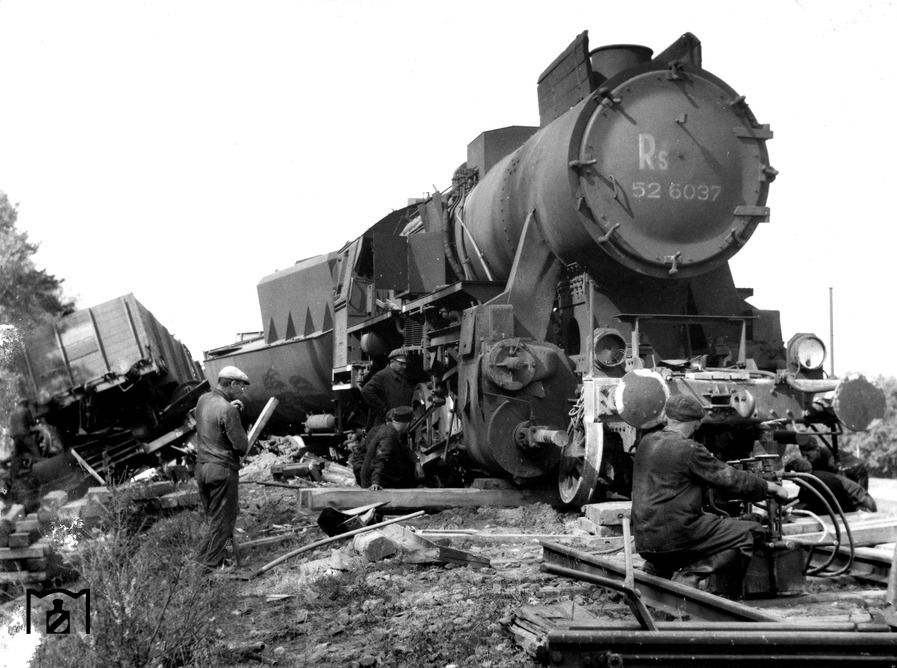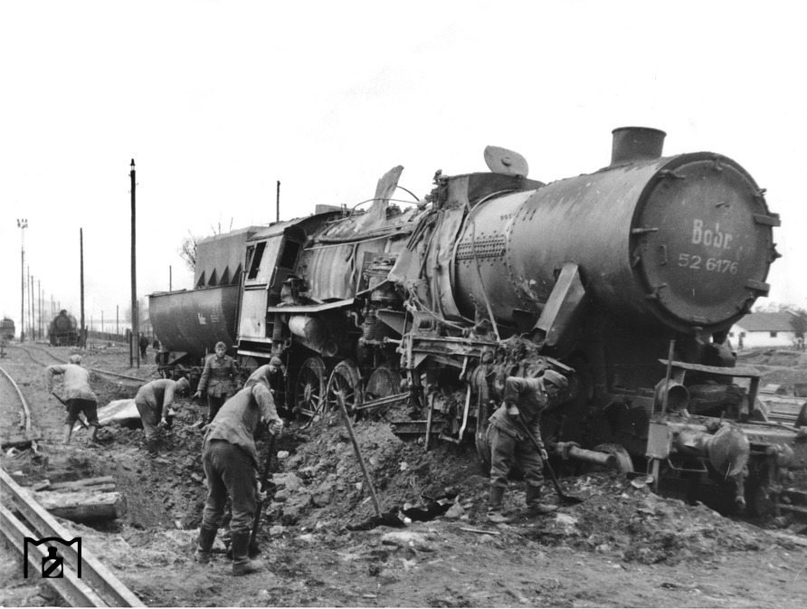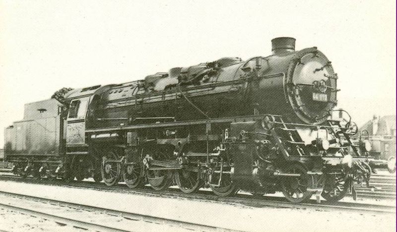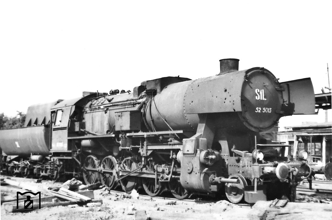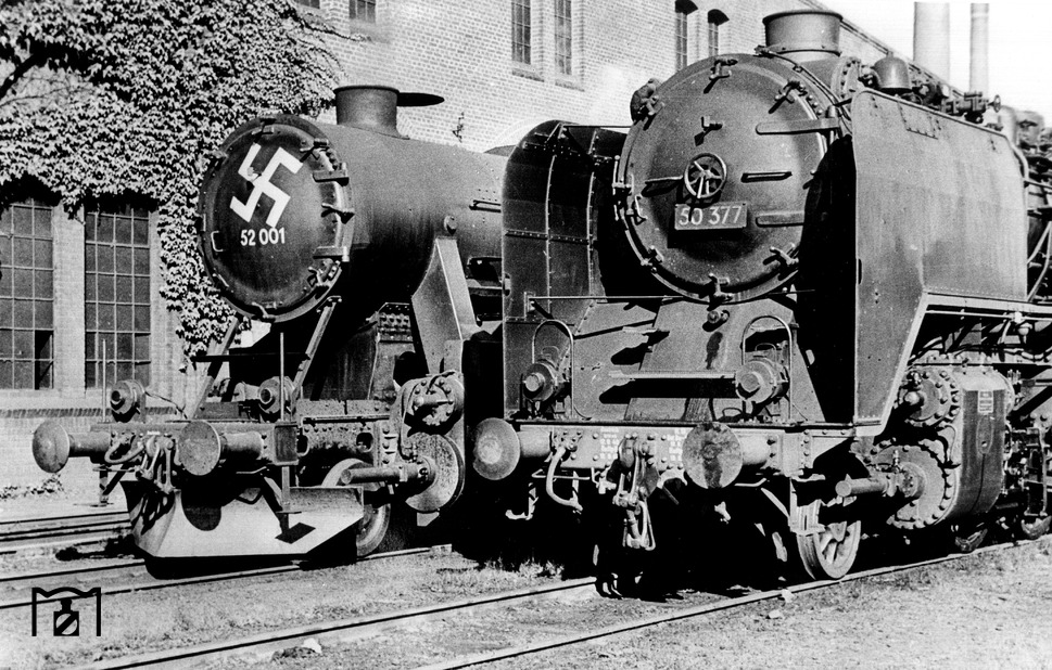 Im September 1942 wurde die erste Kriegslok der Baureihe 52 bei Borsig fertiggestellt. Durch bauliche und technische Vereinfachungen sollte eine Leistungssteigerung herbeigeführt werden. So sprach die Propaganda davon, dass im Vergleich zur Baureihe 50 etwa 26000 kg Material und 6000 Arbeitsstunden eingespart wurden. Zusammen mit 50 377 ging 52 001 auf „Propagandafahrt" durch Deutschland, um zu zeigen, mit wieviel weniger Aufwand und Material eine Lokomotive hergestellt werden konnte. Findige Ingenieure erkannten jedoch recht bald, daß die genannten Einsparungen von Kupfer und Zinn Täuschungen waren. So wurde bei der 50er ein Verbrauch von 2358 kg Kupfer und 450 kg Zinn angegeben. Bei der 52er sollten es nur noch 126 kg Kupfer und 23,5 kg Zinn sein. Die größte Einsparung an Kupfer entfiel auf die Kupferfeuerbüchse. Die BR 50 besaß aber wie die BR 52 von Anfang an eine Stahlfeuerbüchse. Dies traf in ähnlicher Weise auch auf die Einsparung an Zinn zu. Die 50er besaß wie die 52er schon längst Dünngußlager.... (12.10.1942) Foto: RVM (Scherl)
