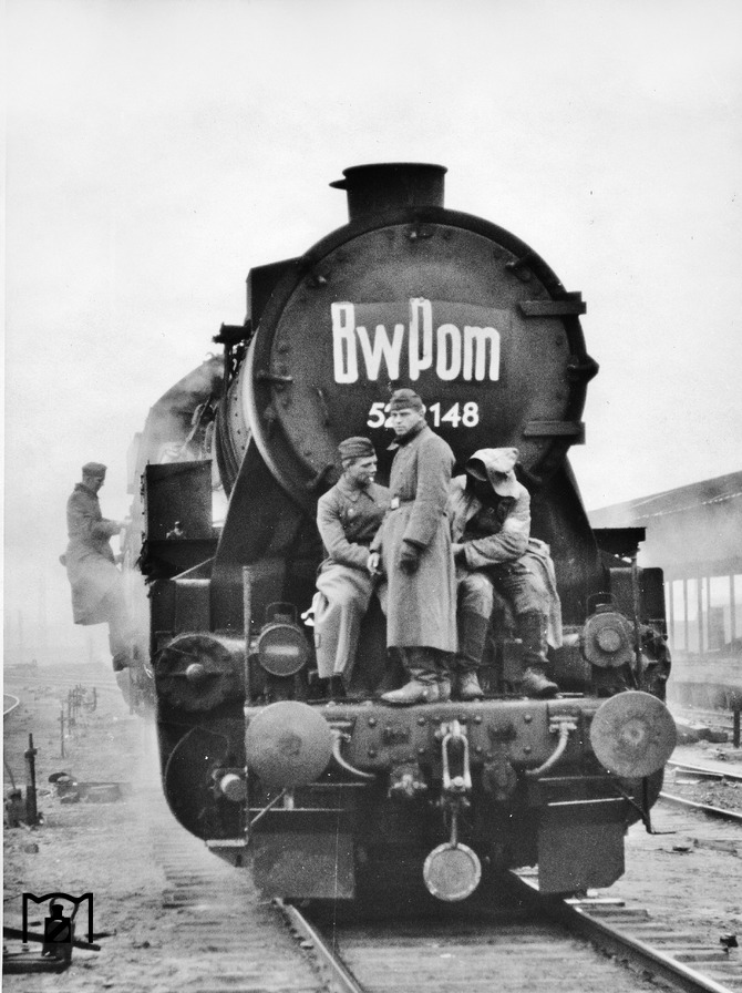 Wehrmachtsangehörige belagern die Kriegslok 52 2148, die unübersehbar zum Bw Pomoschnaja ("Bw Pom") in der Ukraine gehört. Das Bild vom Herbst 1943 vermittelt bereits Endzeitstimmung. Ein geordneter Rückzug war vielerorts nicht mehr möglich, es wurde alles genutzt, was noch fuhr. (11.1943) Foto: Walter Hollnagel