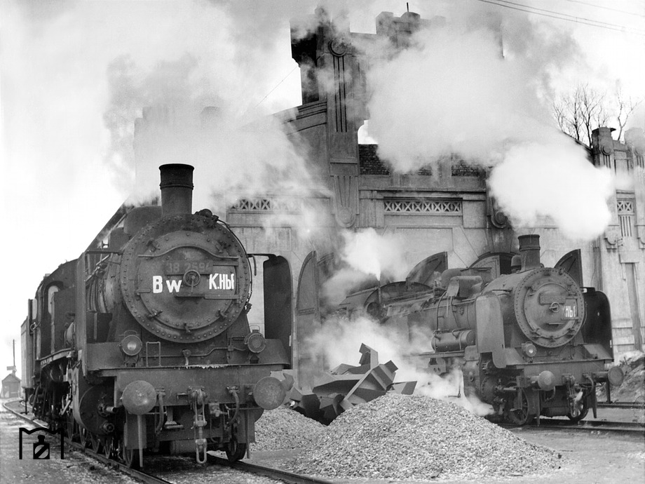 38 2594 (ex Bw Halle P) und 38 2898 (rechts) im Bw Kiew Hbf. Zur Jahreswende 1942/43 besaß das Bw Kiew bis zu 62 preußische P 8. (1942) Foto: RVM (Ittenbach)