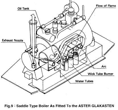 ). Если в первых моделях конструкция бака и горелки была довольно примитивной, то со временем инженерами Aster Hobby была разработана интересная конструкция автоматического дозатора. Независимо от интенсивности горения уровень спирта в стаканах горелки оставался постоянным. Сама же горелка, в зависимости от типа котла располагалась под барабаном котла или в топке