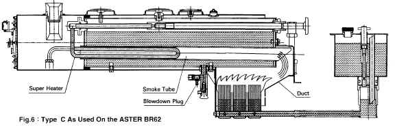 Котлы предыдущего типа и типа С в моделях Aster Hobby отапливаются спиртовыми горелками. Более редкий тип котла как бы объединяет преимущества котлов попроще. В нем применена технология принудительной циркуляции, как в седельном котле. Увеличенный размер топки, входящей внутрь барабана, делает площадь испарения не меньше, чем в котлах Пот типа. Внутренняя топка позволила разместить жаровые трубки довольно большого диаметра (как в центральном типе) и установить перегреватель.