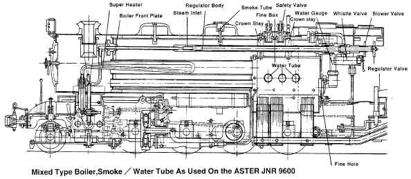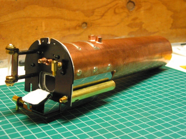 Барабан котла с дымовыми трубами имеет вырез в задней нижней части для установки "сухой", т.е. не омываемой водой, топки Сама топка выполнена из нержавейки и облицована теплоизолирующим слоем из керамической ваты Отдельный лобовой лист служит для декоративных целей и закрепления арматуры: регулятора, крана сифона, клапана свистка, водомерного стекла, манометра, крана отбора пара на смазочное устройство (лубрикатор). Медная жаровая труба (обычно диаметром 16 мм) позволяет разместить в ней петлю перегревателя В дымовой коробке тоже всё, как у людей - сифон, коллектор перегревателя, трубки подачи смазки