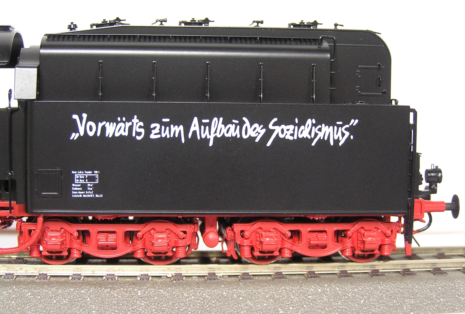 Напомню, что в феврале 1953-го года паровоз был отправлен на испытания в лабораторию в Халле, где его обвешали датчиками и измерительными приборами, а также подменили тендер на стандартизированный на то время тендер ванного типа.