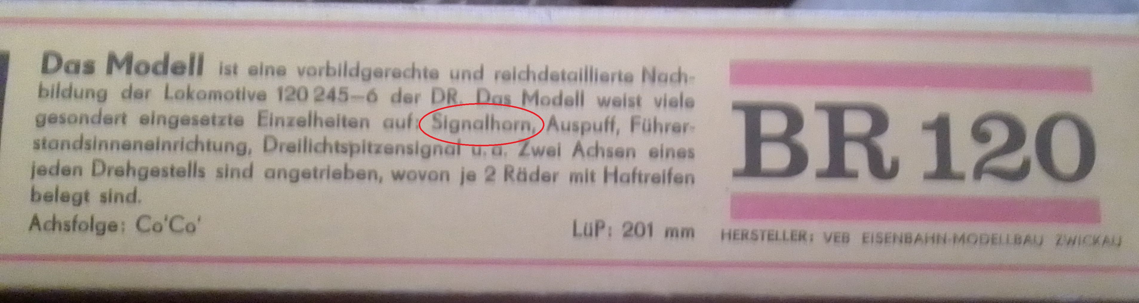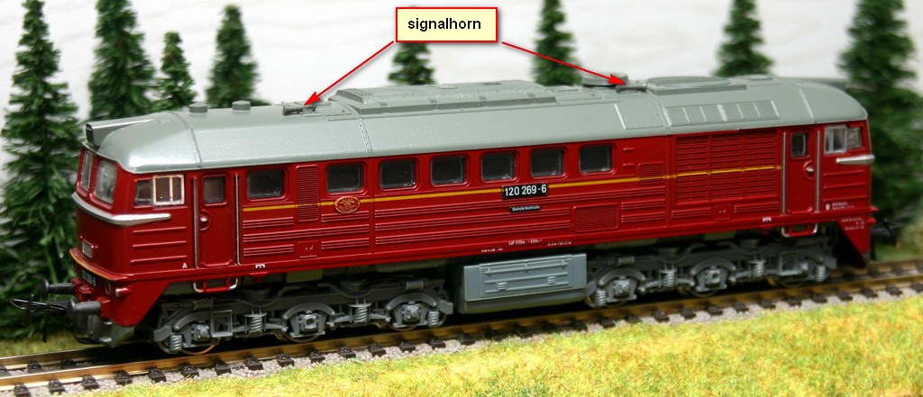 Signalhorn указанный на фото присутствует практически на всех моделях тепловозов, включая даже JUNIORовские модификации т.е. это неотъемлимый атрибут практически любой модели тепловоза. Вся фишка в том, что в описании модели signalhorn указан только на 120м. Лично я на других моделях не встречал. Интерьер кабины - согласен, это в те годы было новшеством, поэтому он и попал в описание, но чтобы удивить покупателя наличием бутафорского тифона на тепловозе.... Удивить моделиста или коллекционера можно было разве что его отсутствием.