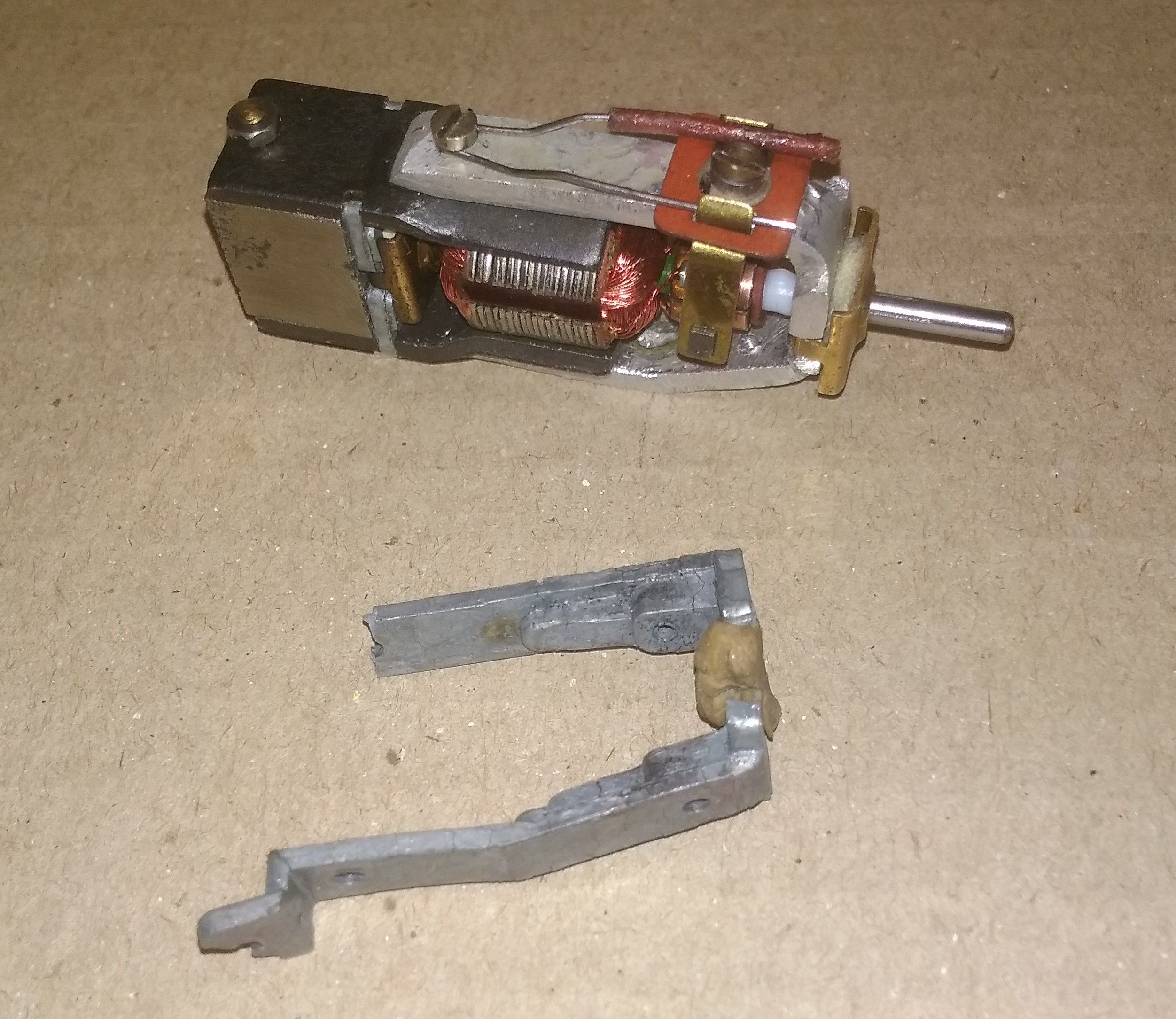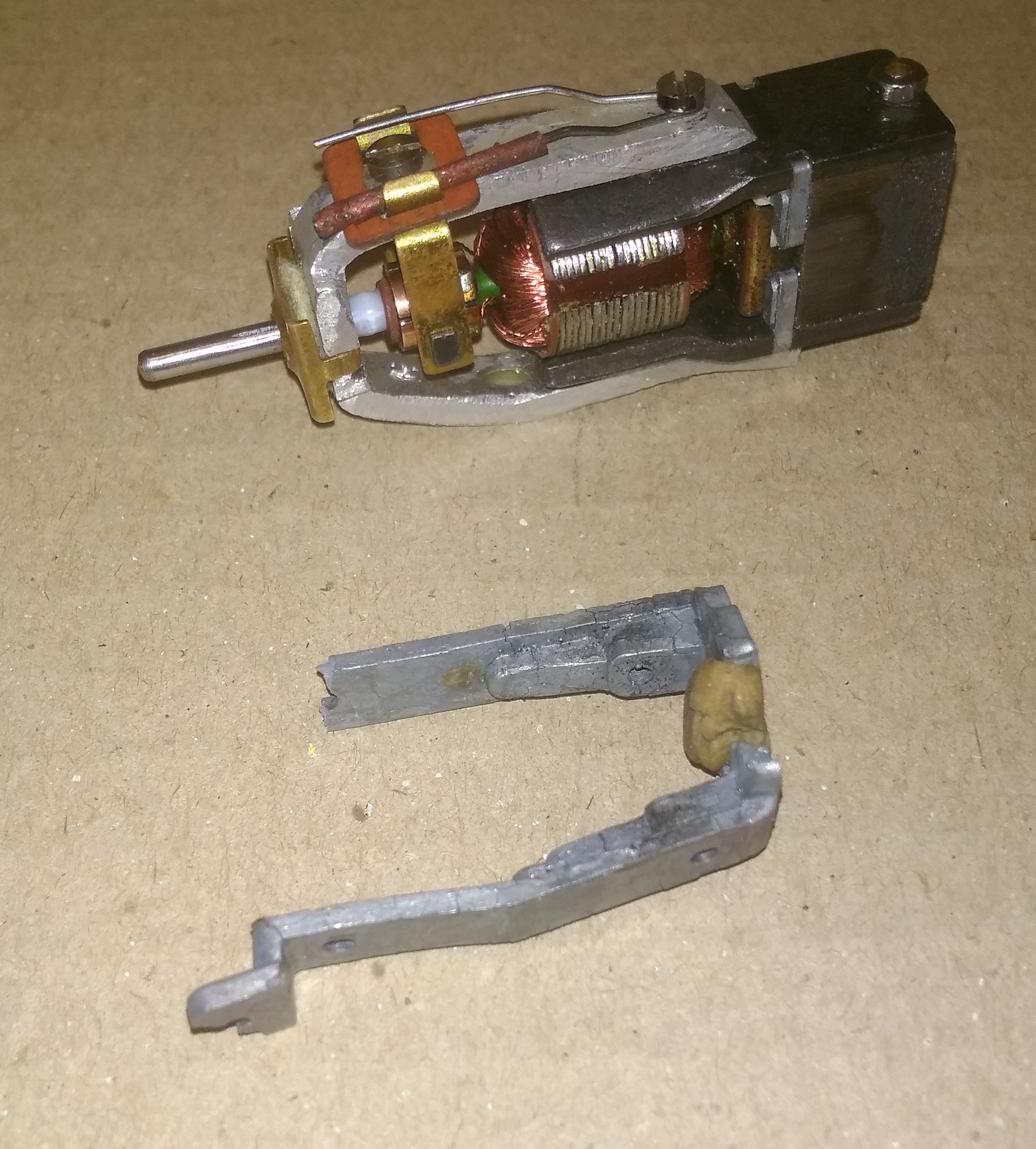 Можно было бы заменить мотор, но в паровозе стоял пятиполюсный двигатель, поэтому решил всё-таки восстановить родной мотор. Подобрал алюминиевую пластину подходящей толщины, отрезал полоску нужной ширины, посверлил где надо отверстия. После этого согнул её по габаритам старой рамы , «пересыпал» в неё ротор, магнит и подшипники, щётки с держателями. Немного пришлось поиграться с соосностью, но в результате двигатель заработал.