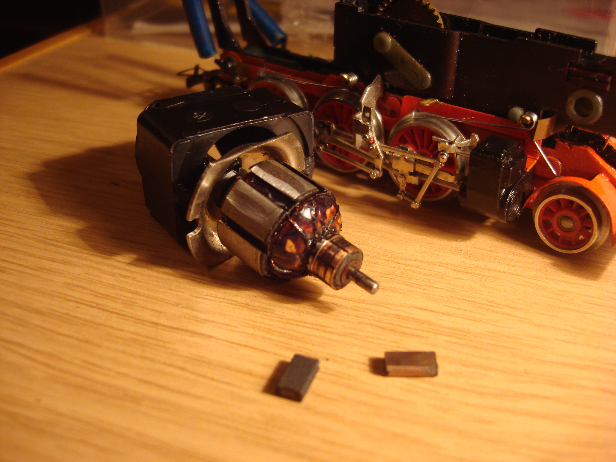 главное чтоб на вашей Хрюшке -грушке была целая обмотка в якоре без виткового и все выводы припаяны, щеточки я тоже сам выпиливал и подгонял тут главное руки нужны ,глаза и немного терпения по подгонке)), данный паровоз можно и переделать под СЖД вот типа такого