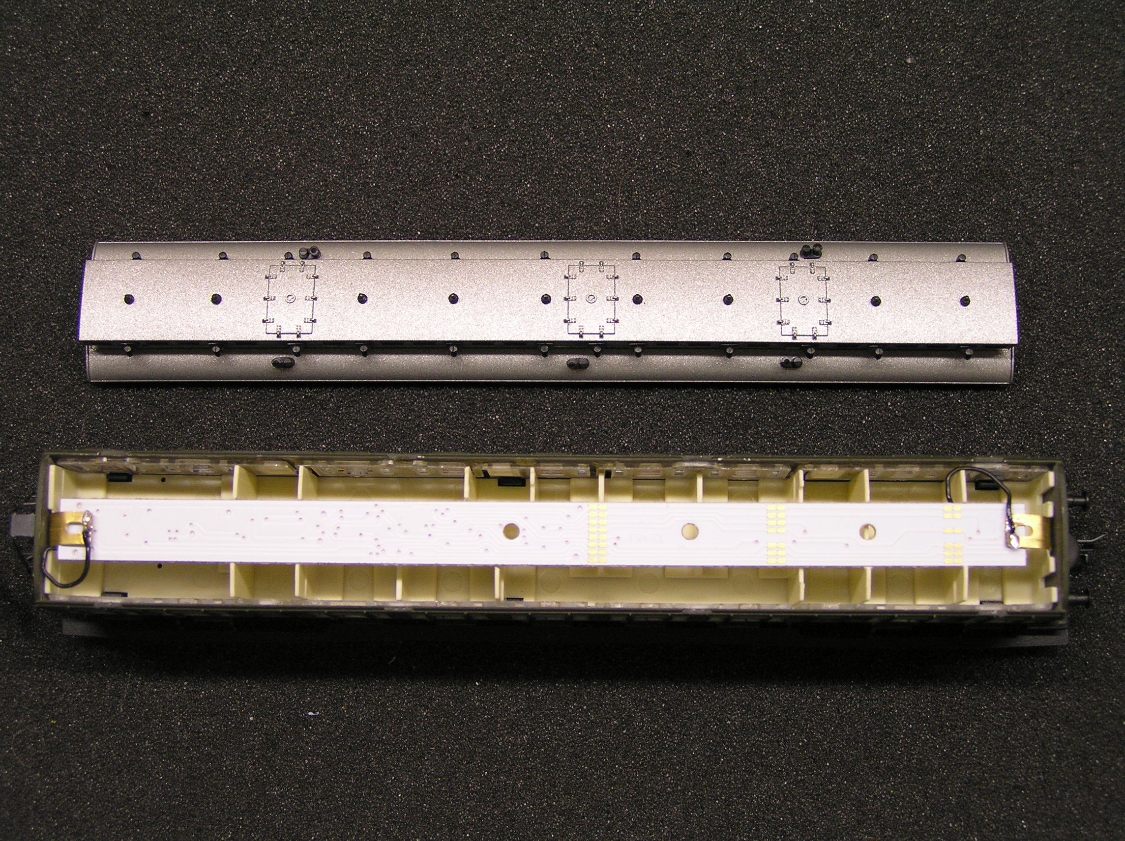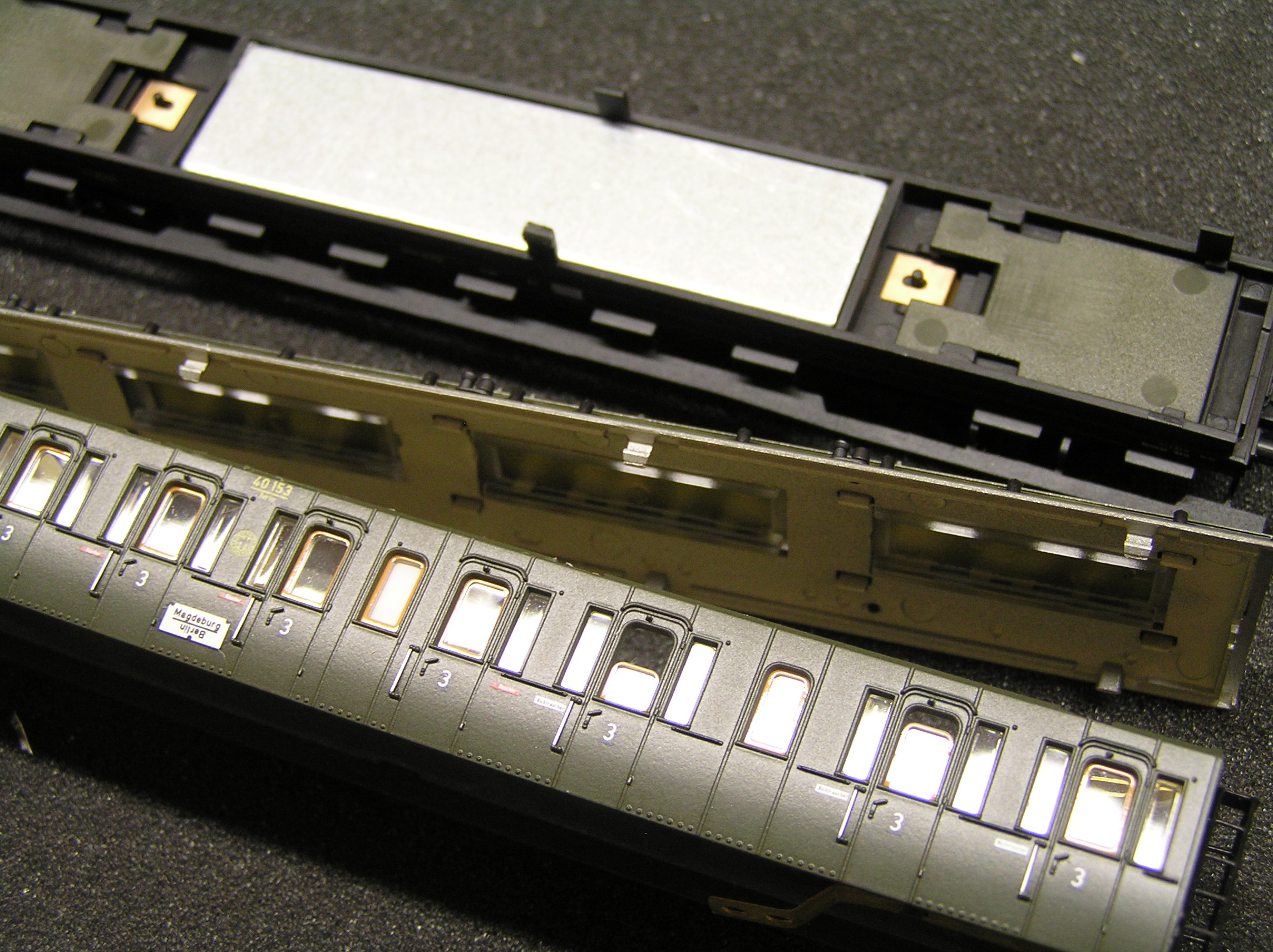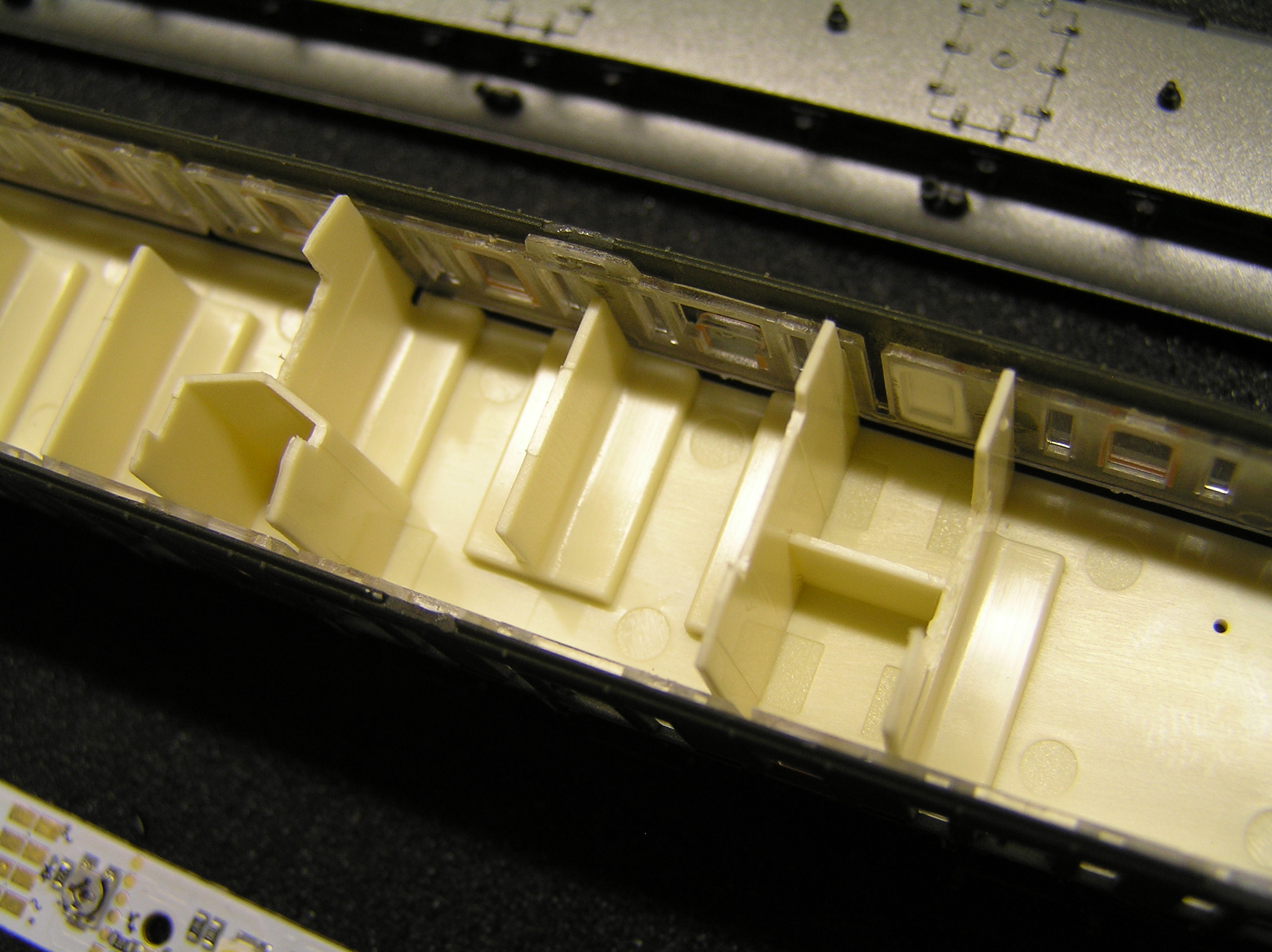 Данные вагоны имеют штатное место для установки платы освещения шириной 7мм. Цифровые платы от Viessmann имеют ширину 9мм. Из-за этого пришлось немного "расширять" посадочные места в имитации салона вагона.