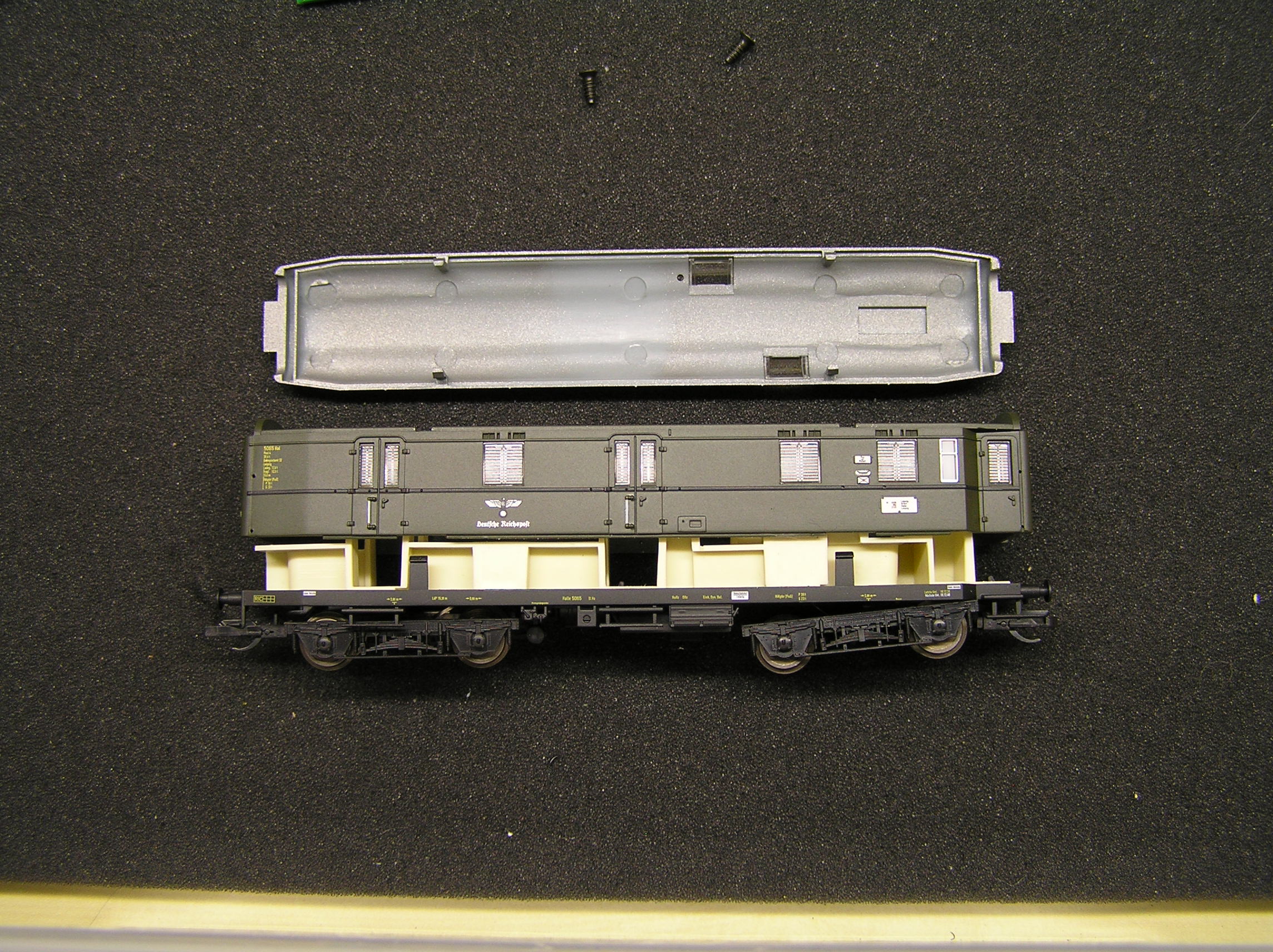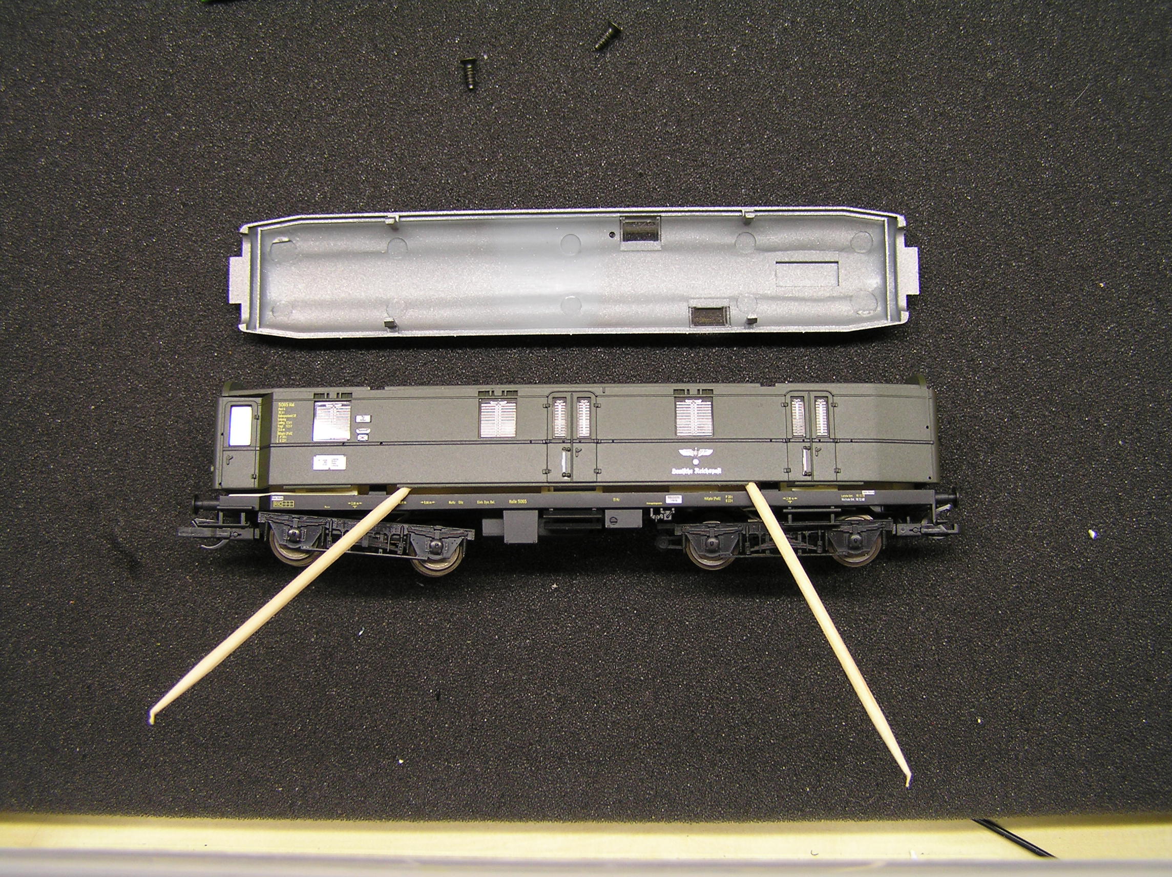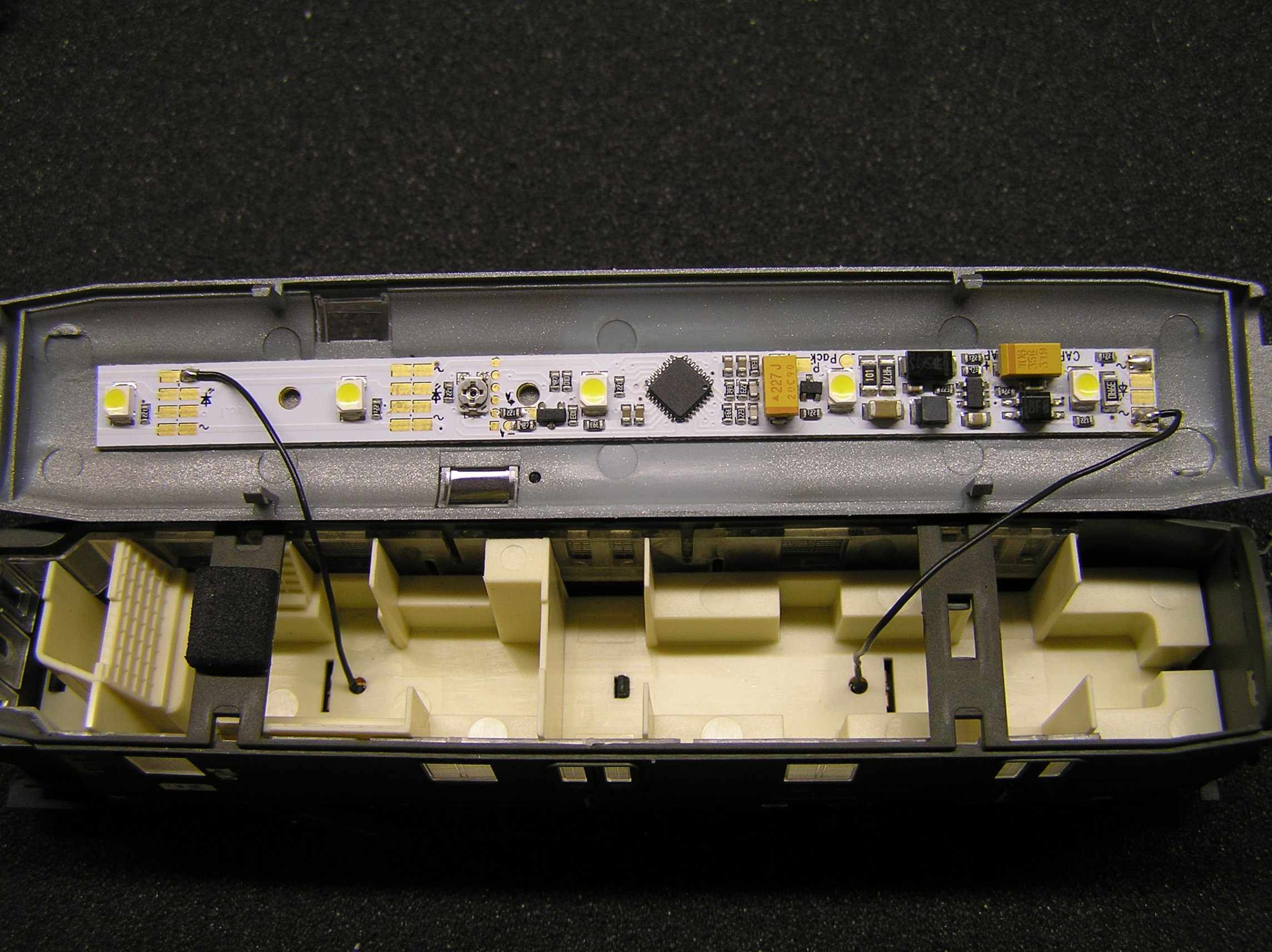 Данный вагон имеет штатное место для установки платы освещения шириной 7мм. Цифровые платы от Viessmann имеют ширину 9мм. Плата была установлена с фиксацией под крышу вагона.