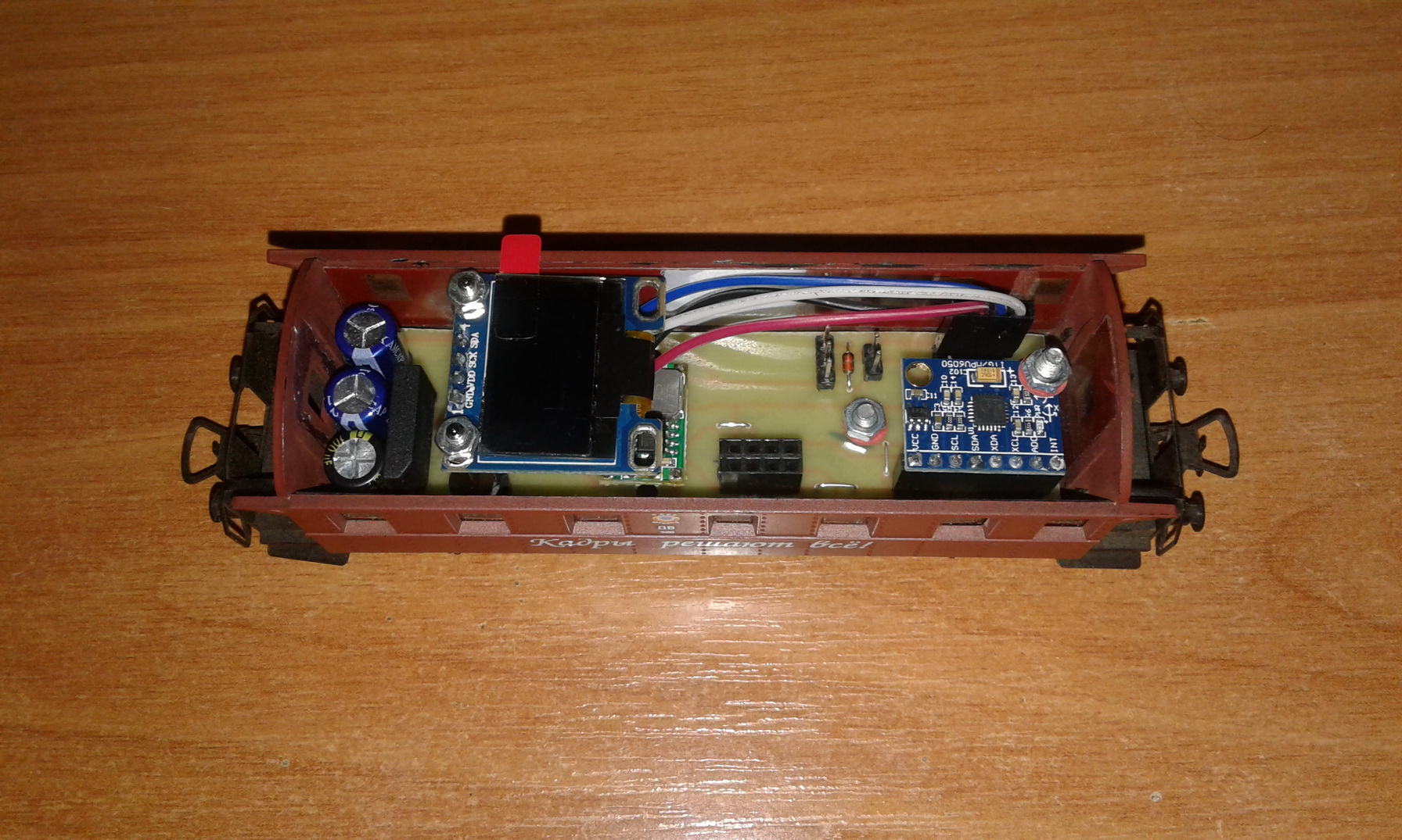 Припаял входную цепь питания платы к заклепкам, фиксирующим скобы-держатели колесных пар и установил плату в вагон.