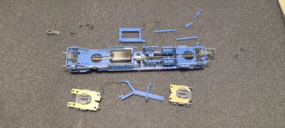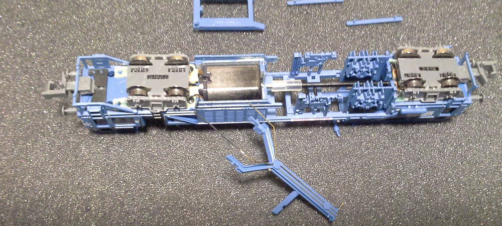 Откручиваем крепление двигателя и вынимаем два боковых резервуара которые являются фиксаторами кузова относительно груза (рамы). Должен заметить, что эти самые резервуары изначально имеют очень плохую фиксацию, поэтому руки так и чешутся их приклееть. выводим из зацепления балку внутри которой расположены токонесущие шины ко второй тележке откручиваем два винта крепления задней тележки и четыре винта передней.