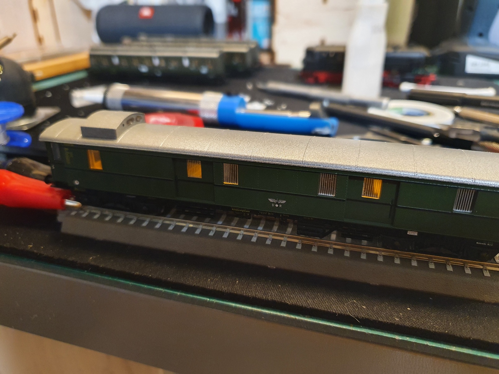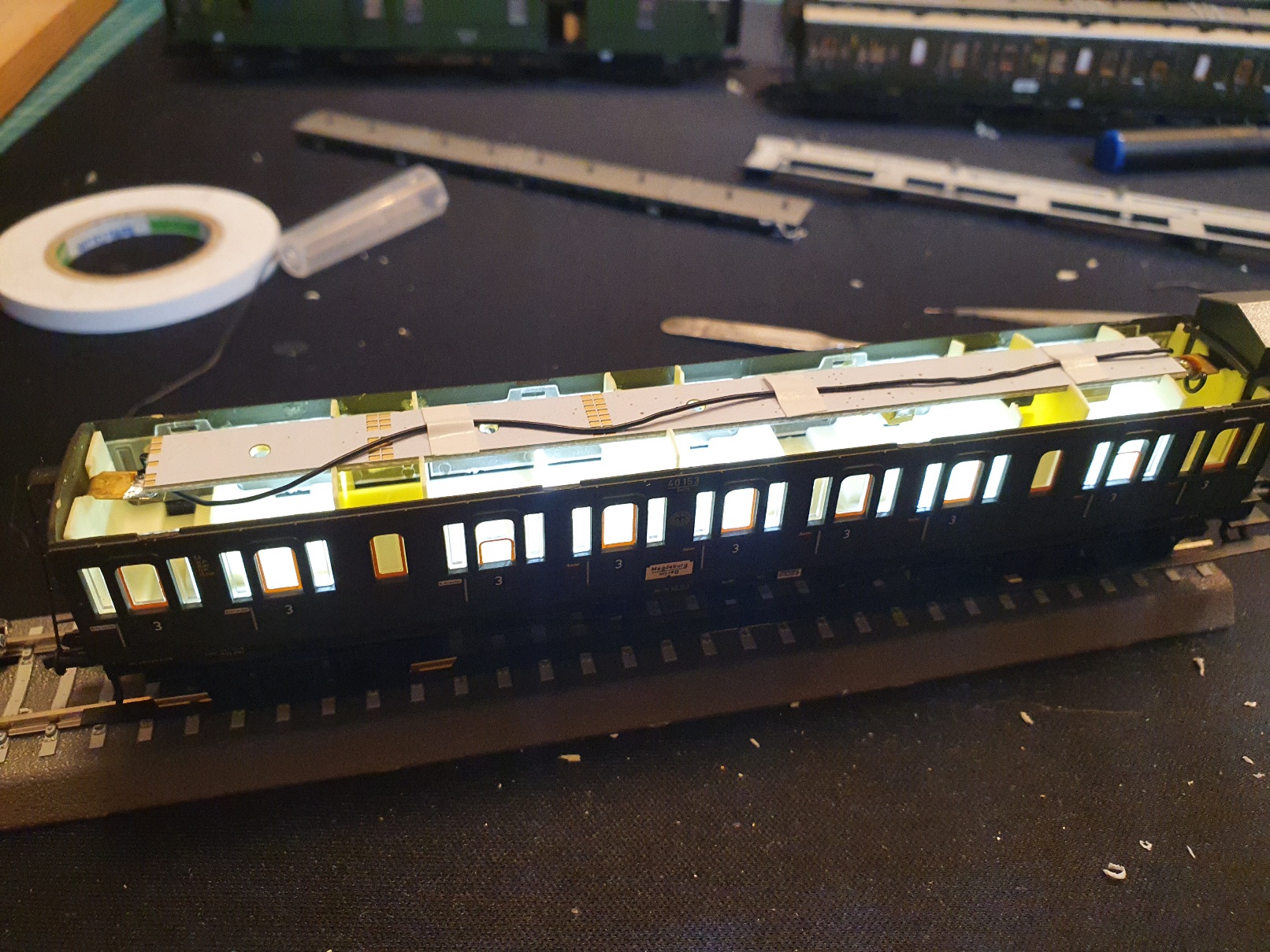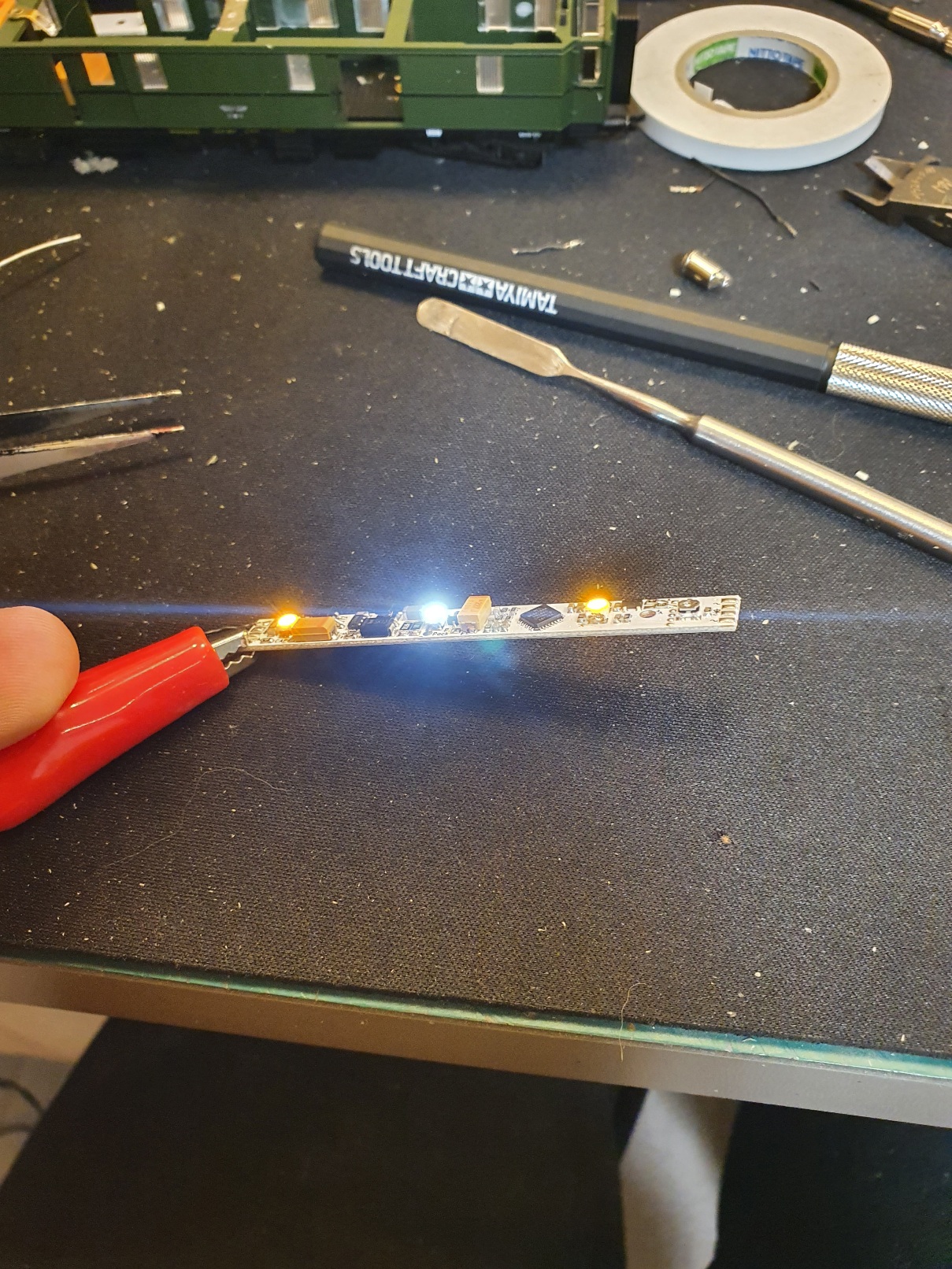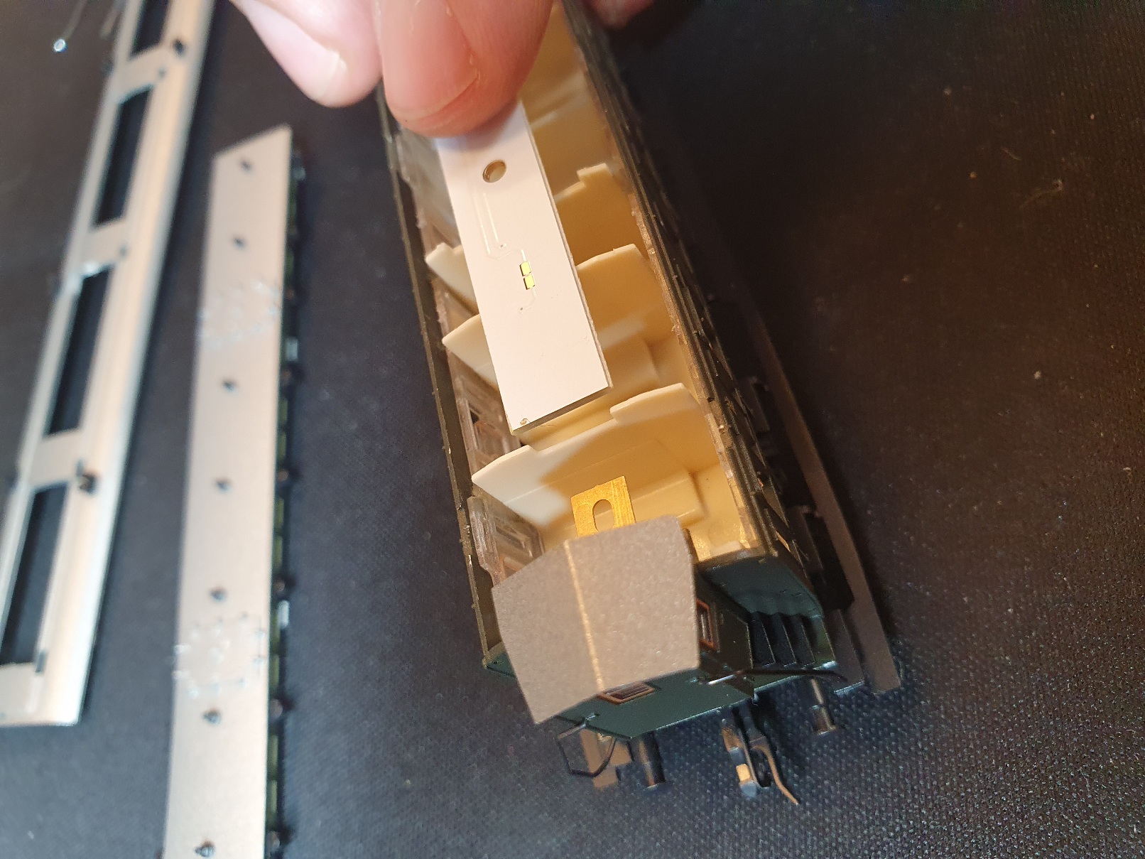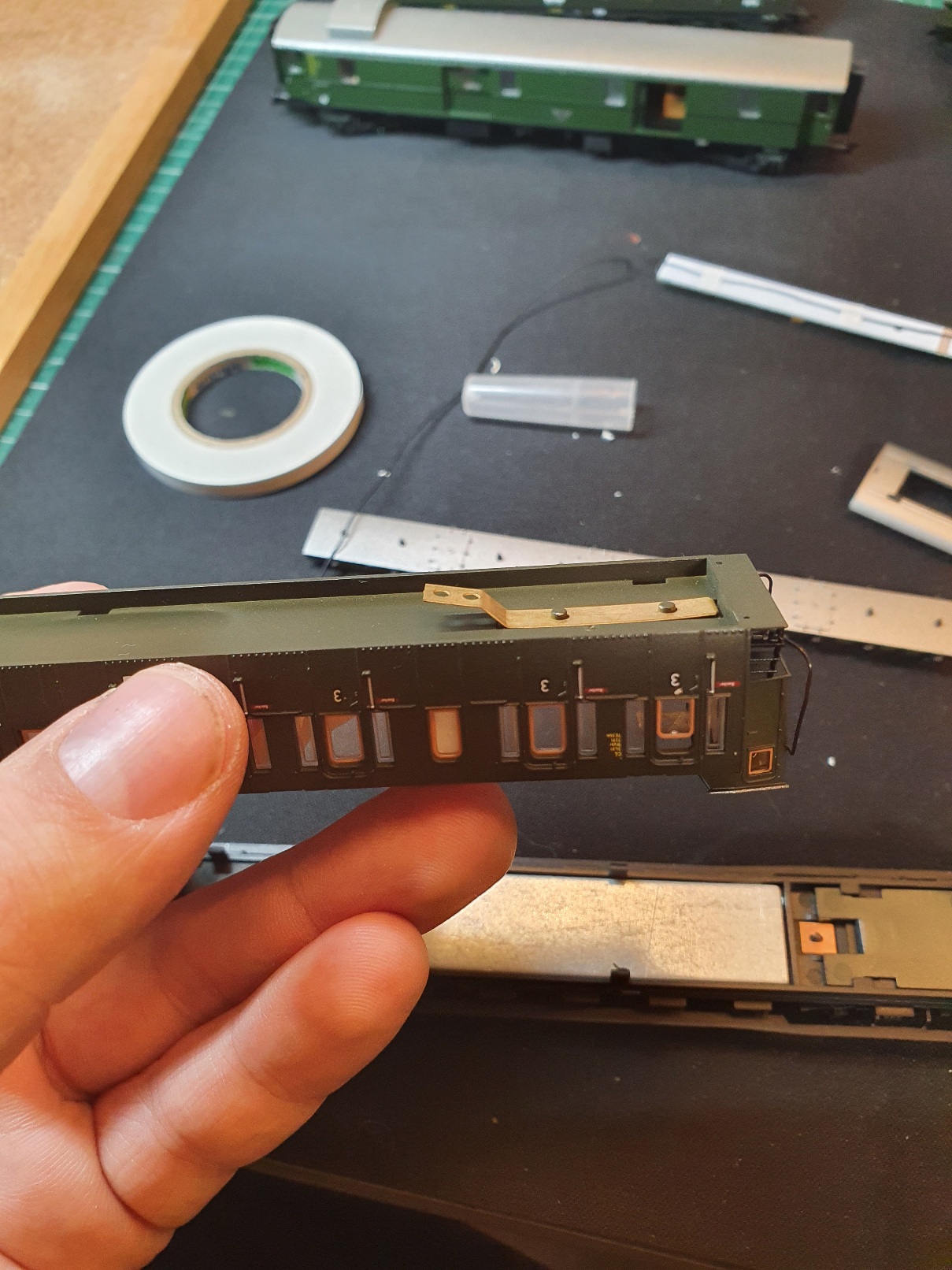 Стартую, первым делом снимаю верхний погон крыши, следом саму крышу вагона На внутрянке вагона уже есть места под плату освешения и токосъем, места правда уже чем нужно Материал салона мягкий и подгонка посадочных мест не вызывает проблем, отрезаем "ленту" нужной длинны и примеряем на место проверяю токосъем, на одном нет контакта, отковыриваю вагон от днища, тут нужно немного подогнуть контакты, собираю обратно, проверяю, все ок, можно паять пату Прописываю декодер, и... И мягко говоря удивляюсь, два вагона светят правильным тёплым светом, а вот один похоже почувствовал что превалил в 5ю эпоху, снимаю плату паяю другую, все ок. Тут кстати забавная ситуация, "белая" плата оказалась в закрытой новой коробке с артикуом жёлтой Теперь очередь багажного, снимаю крышу, тут всё хуже, вагон старше, установлен заводской свет, но он подведен только в дежурку ещё одна проблема, места в вагоне не много, и двери работают, просто так кинуть плату на пол не вариант. Посидел подумал...