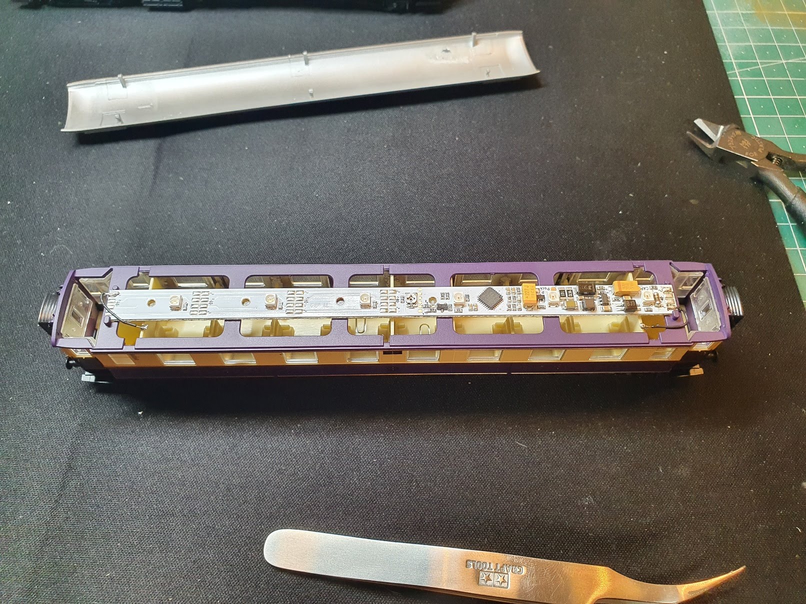 Обрезаем плату, ставим на место и припаеваем, ничего сложного, собираем вагон.