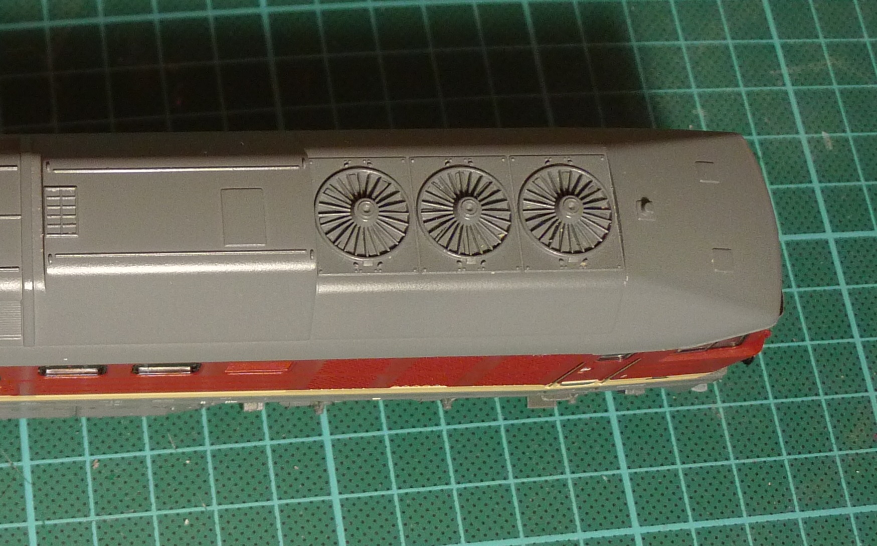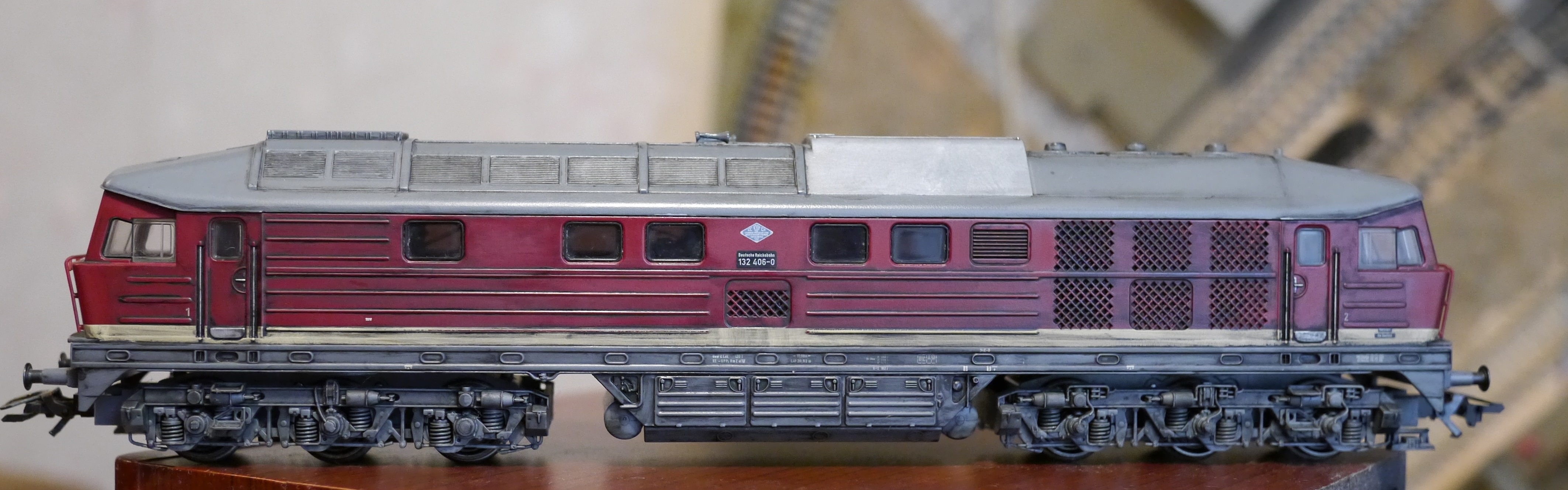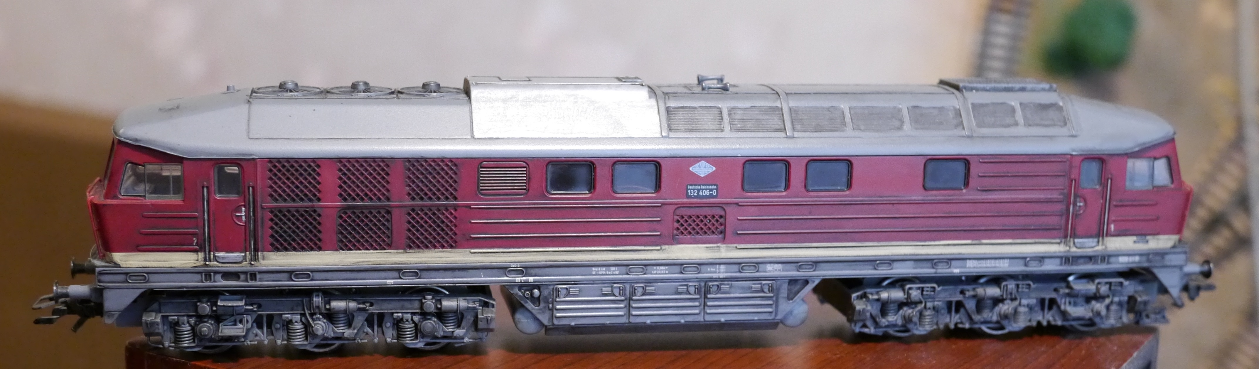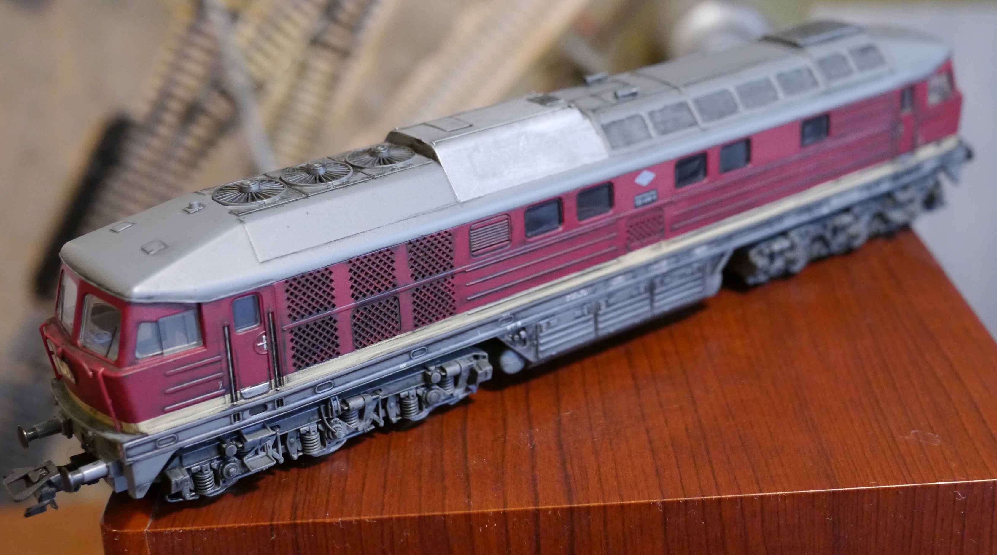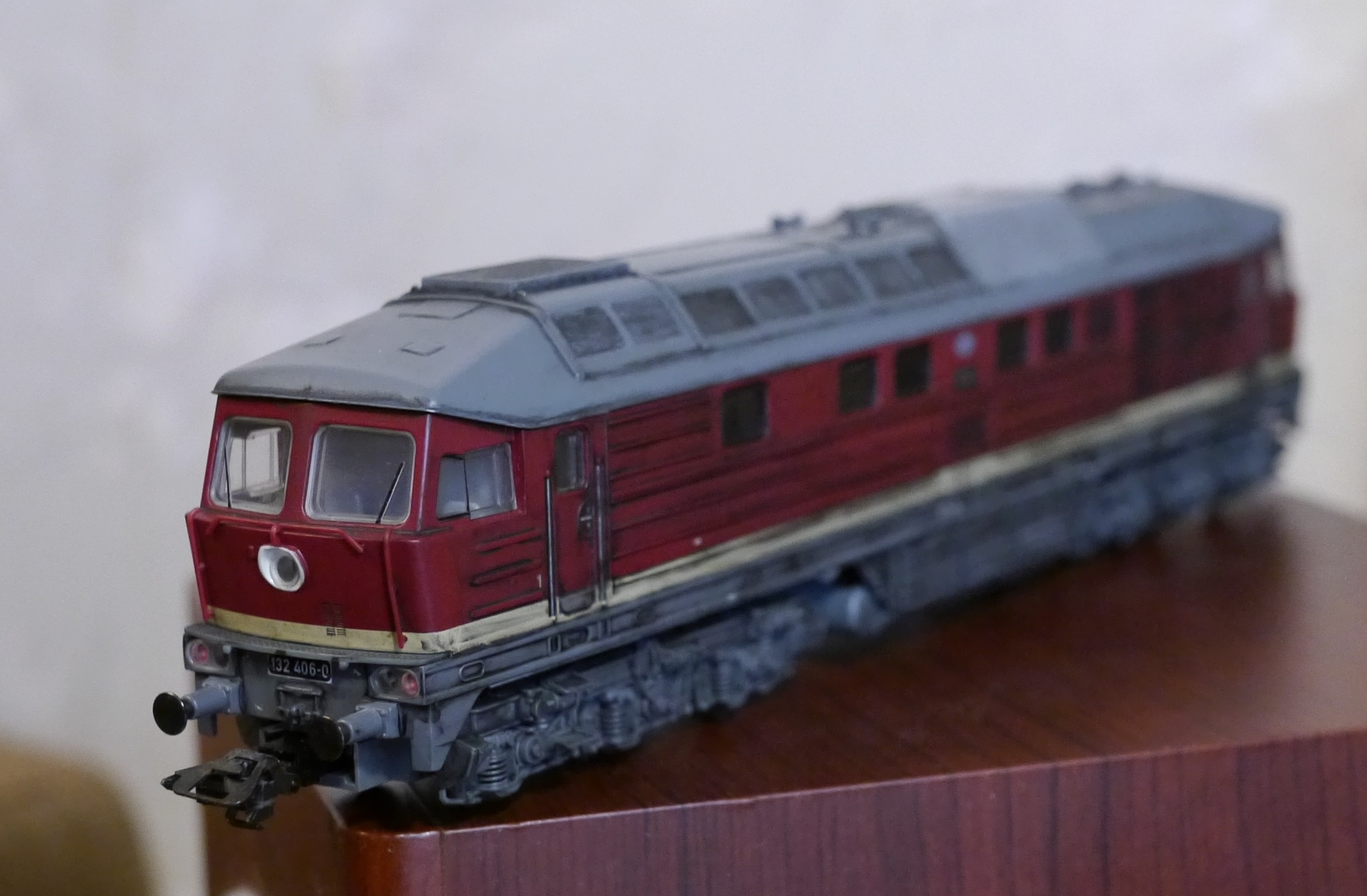 Попытался добится "рабочего" вида тепловоза. На многих фотографиях из ГДР видно, что машины подкопчены, краска несколько выцвела. Что-такое попытался изобразить и я. Фотки попробую подобрать "Было/стало". Левый (от кабины №1) борт: Второй борт: Мордаха.