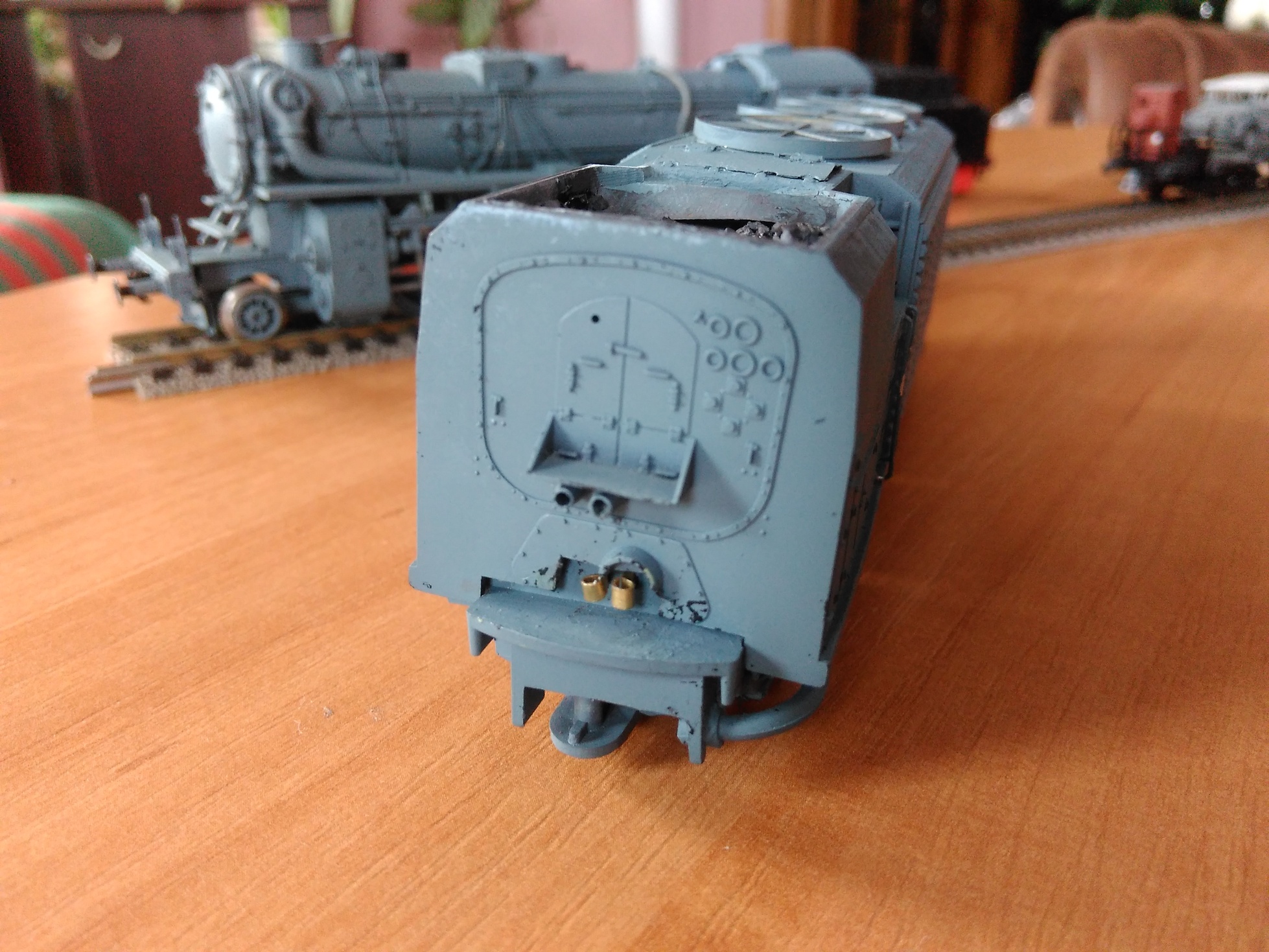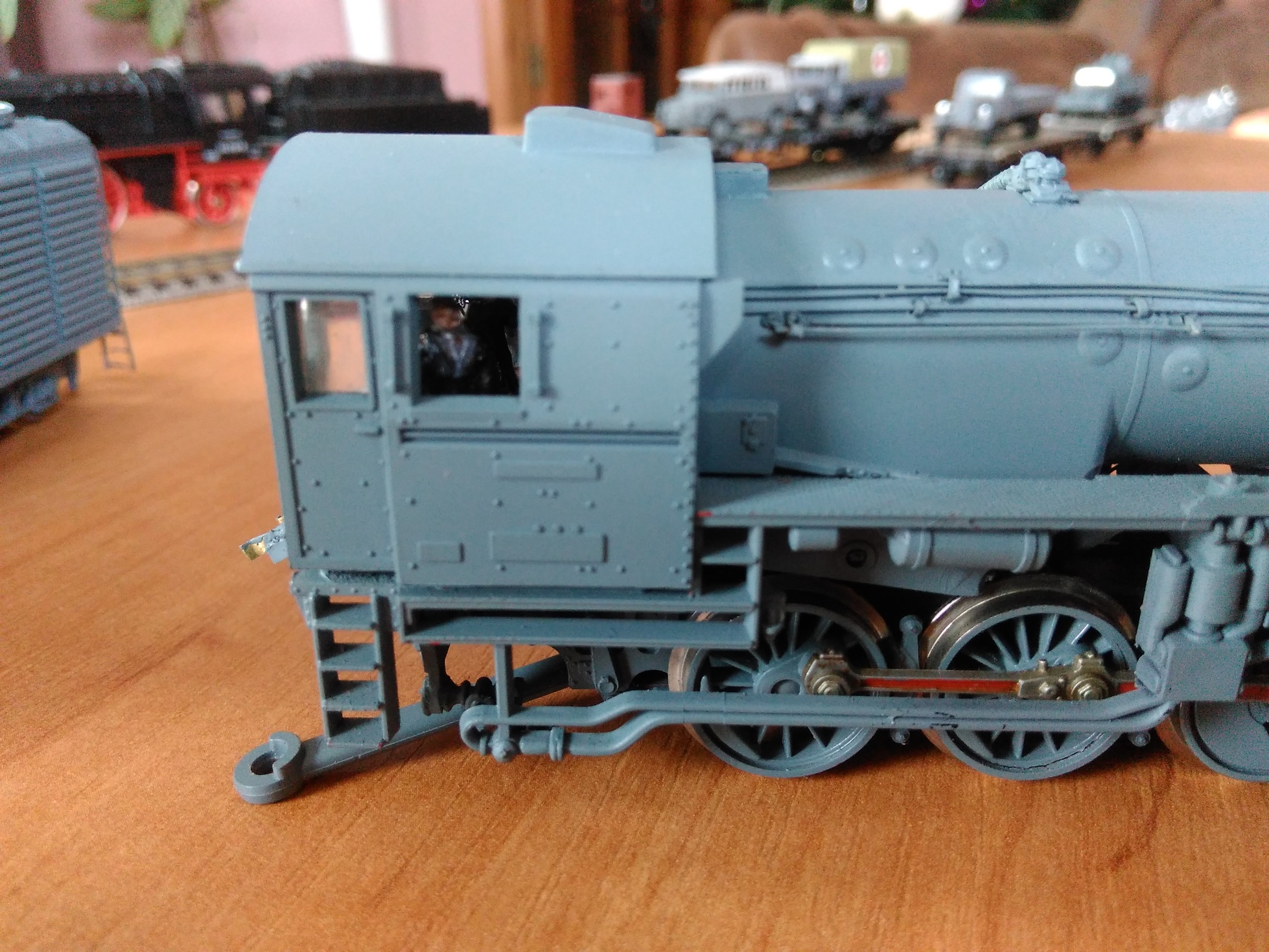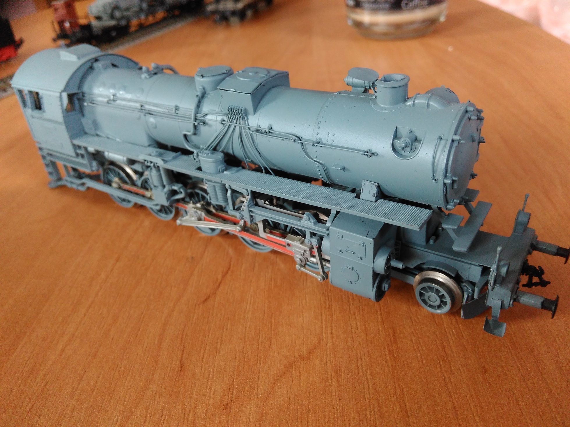 Модель очень серьёзно доделана. У PIKO короткий котел. Поэтому я нарастил спереди дымовую коробку. Спаял подножки на буферном брусе, полностью заменил обвязку котла трубками и проводкой, перенес Динамо ближе к будке, сделал тяги механизма управления турбиной, массу поручней и прочее, и прочее.