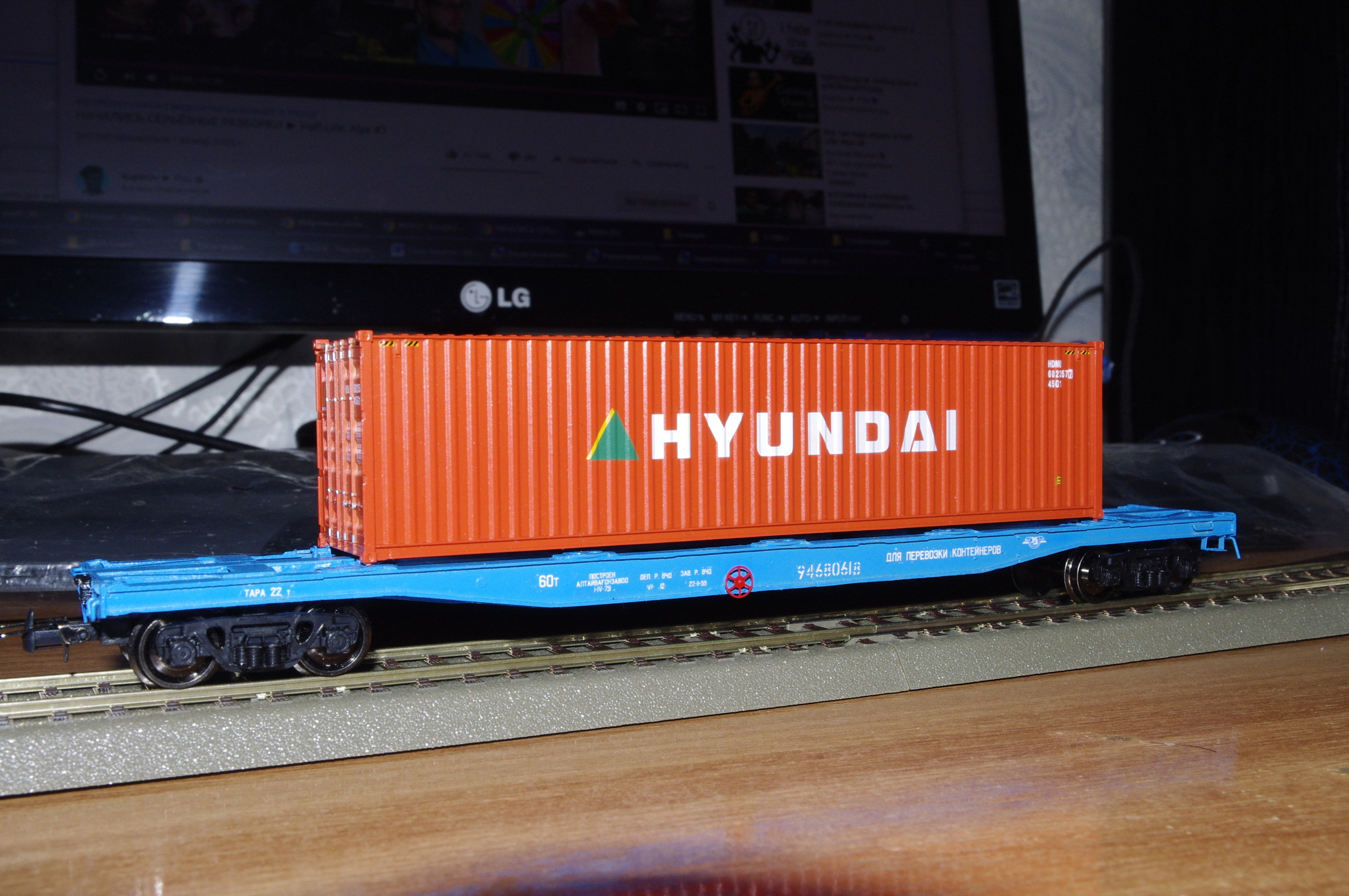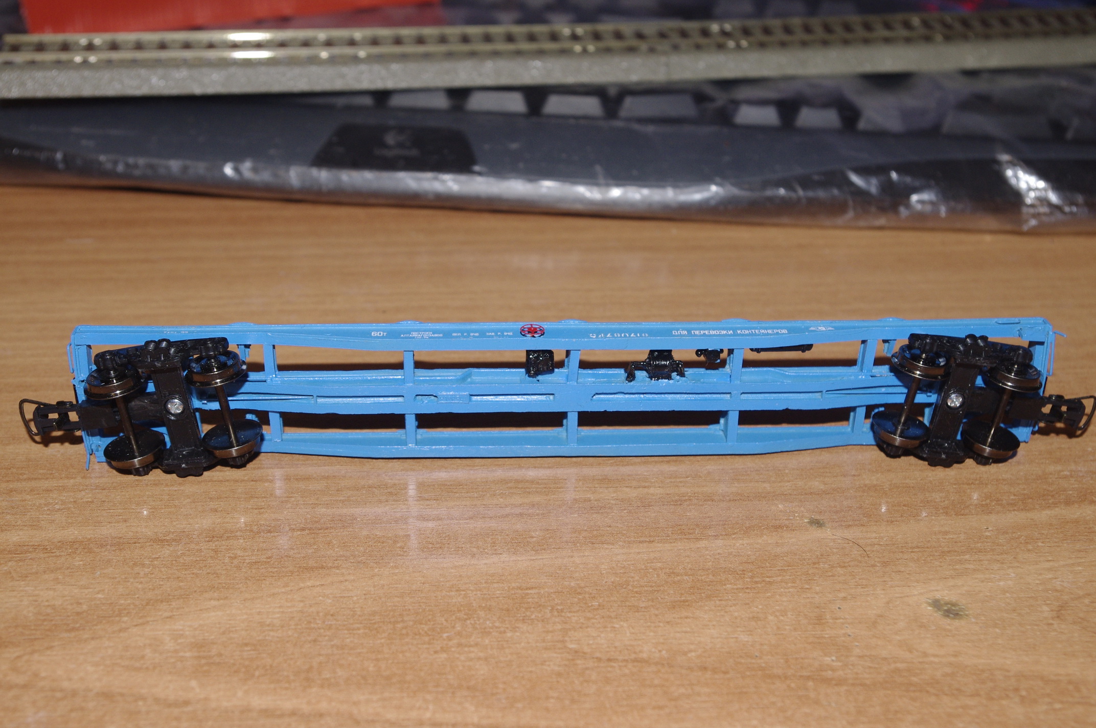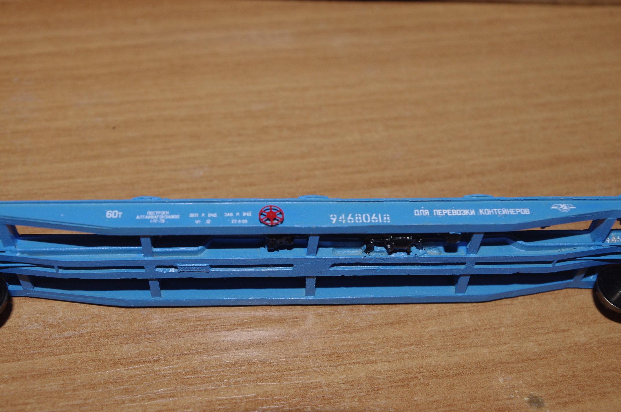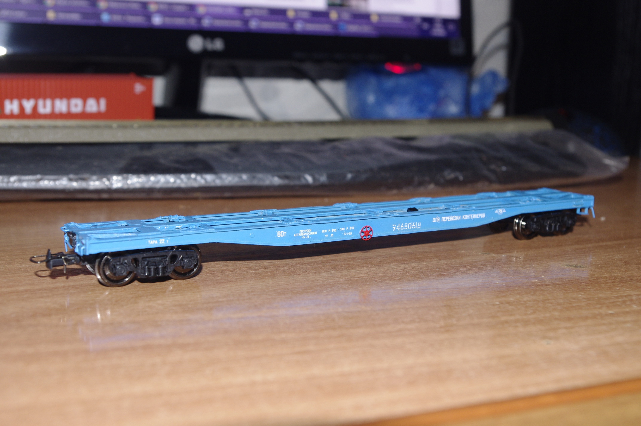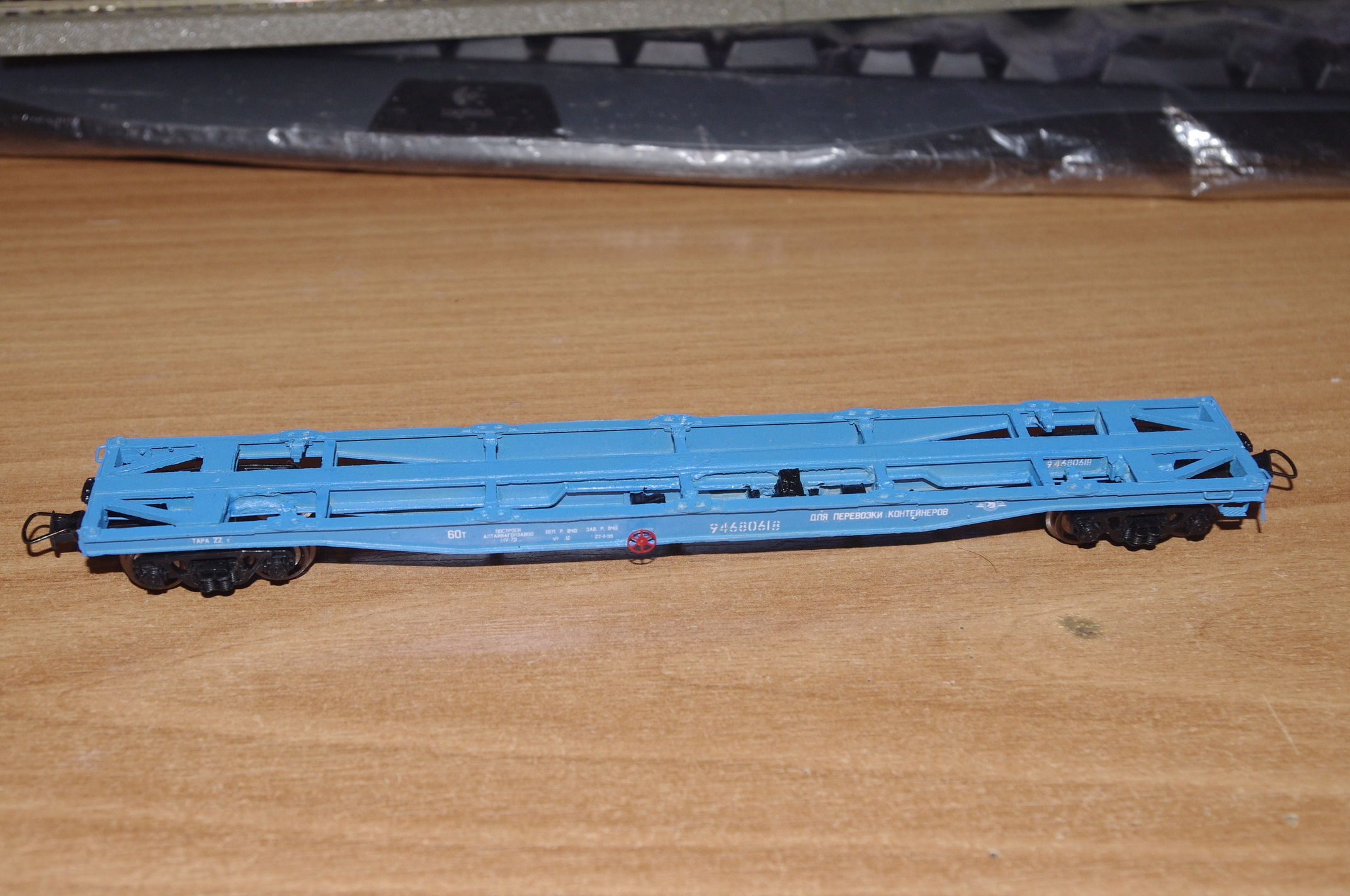 Доработка платформы-контейнеровоза от Modela - снял краску, убрал по возможности косяки отливки, коих у Моделы, к сожалению, предостаточно, установил все проволочные элементы (тормозную магистраль, тяги, подножки), травленый тормозной штурвал, окрасил и нанес декали под 6 эпоху УЗ.