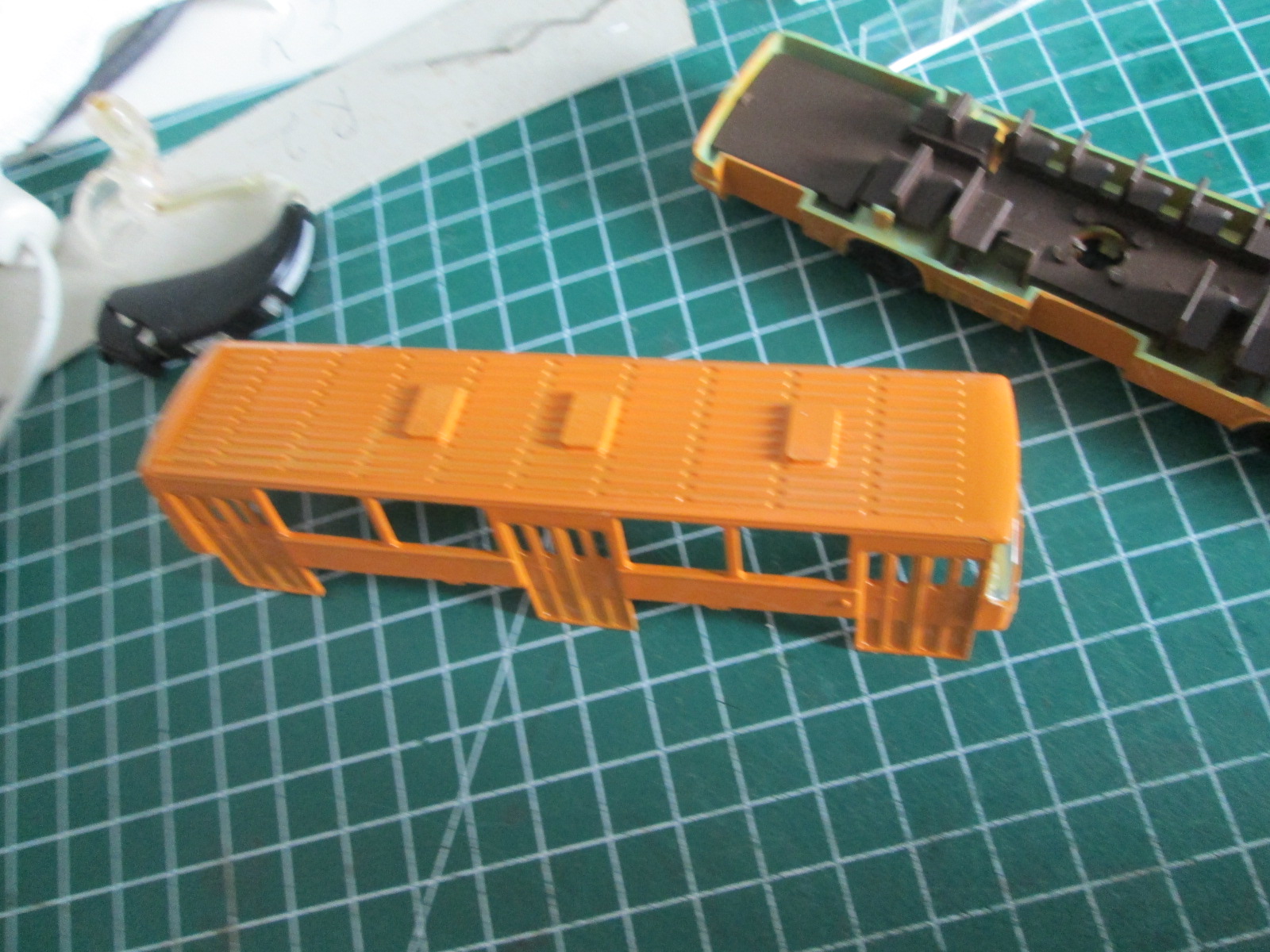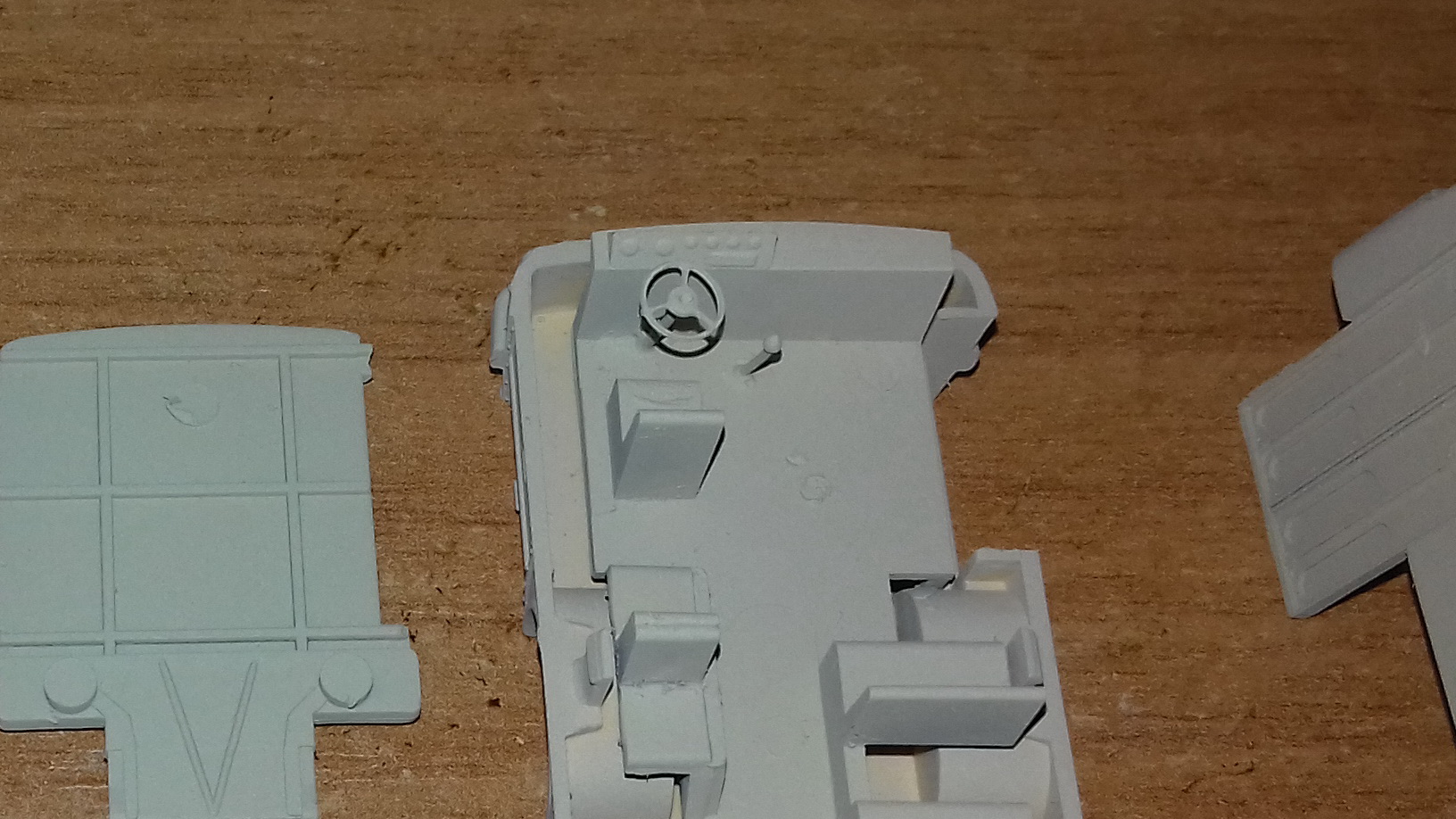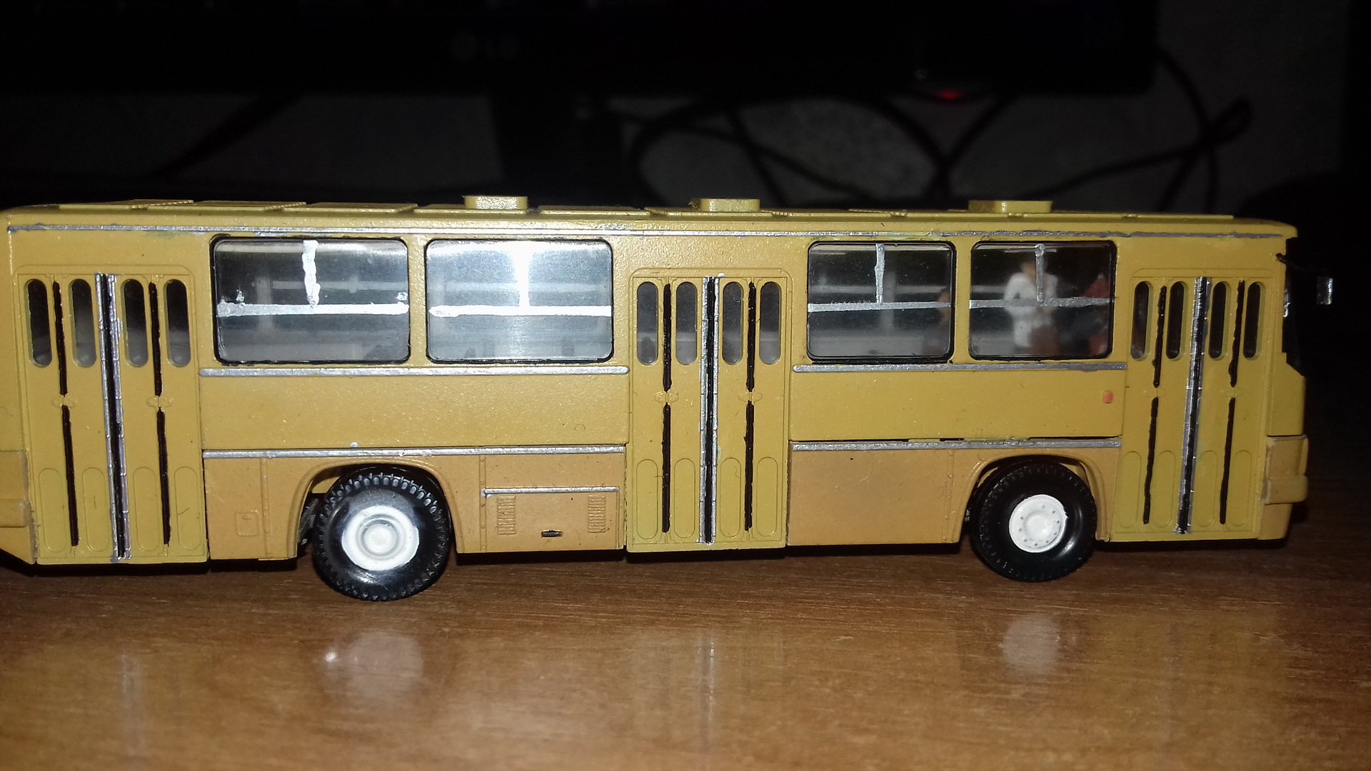 Небольшое "перетрахивание" модельтековского 260-го икаруса - руль, ручка кпп, зеркала заднего вида, потолок из тонкого пластика, покраска. Пока на стадии грунтовки. Красить буду в стандартную для городских икарусов охру.