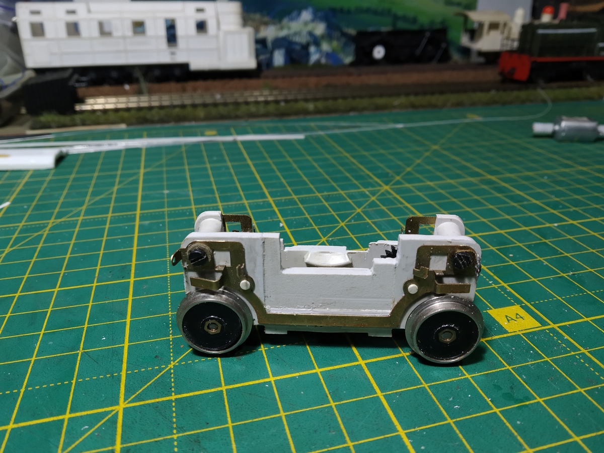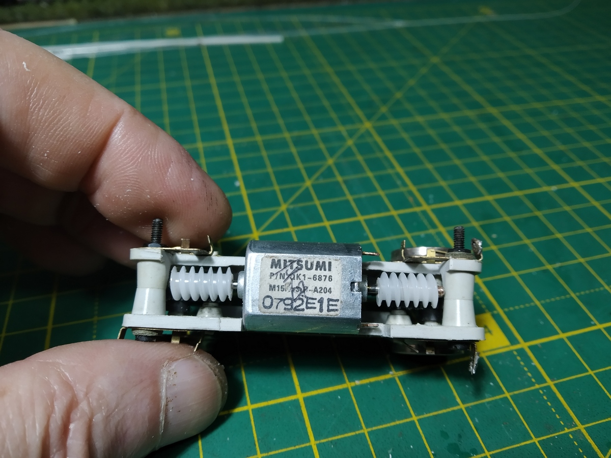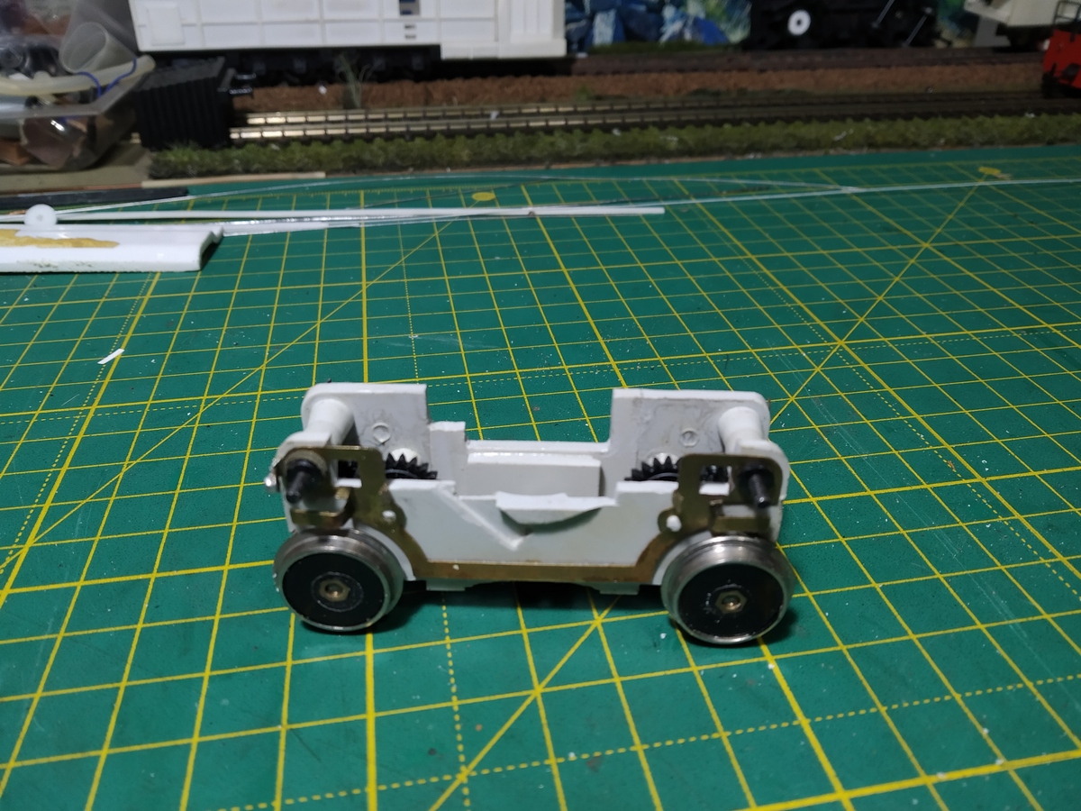 По базе это Е69, но штатная ходовка Е69 не помещается в капот резинохода. И всё же решил делать из Е69. Нашёлся в закромах интересный экземпляр с корпусом редуктора из полистирола. И вообще когда-то был не совсем обычный Е69 потому, что рама изначально была красного цвета, как можно заметить по сколам краски.