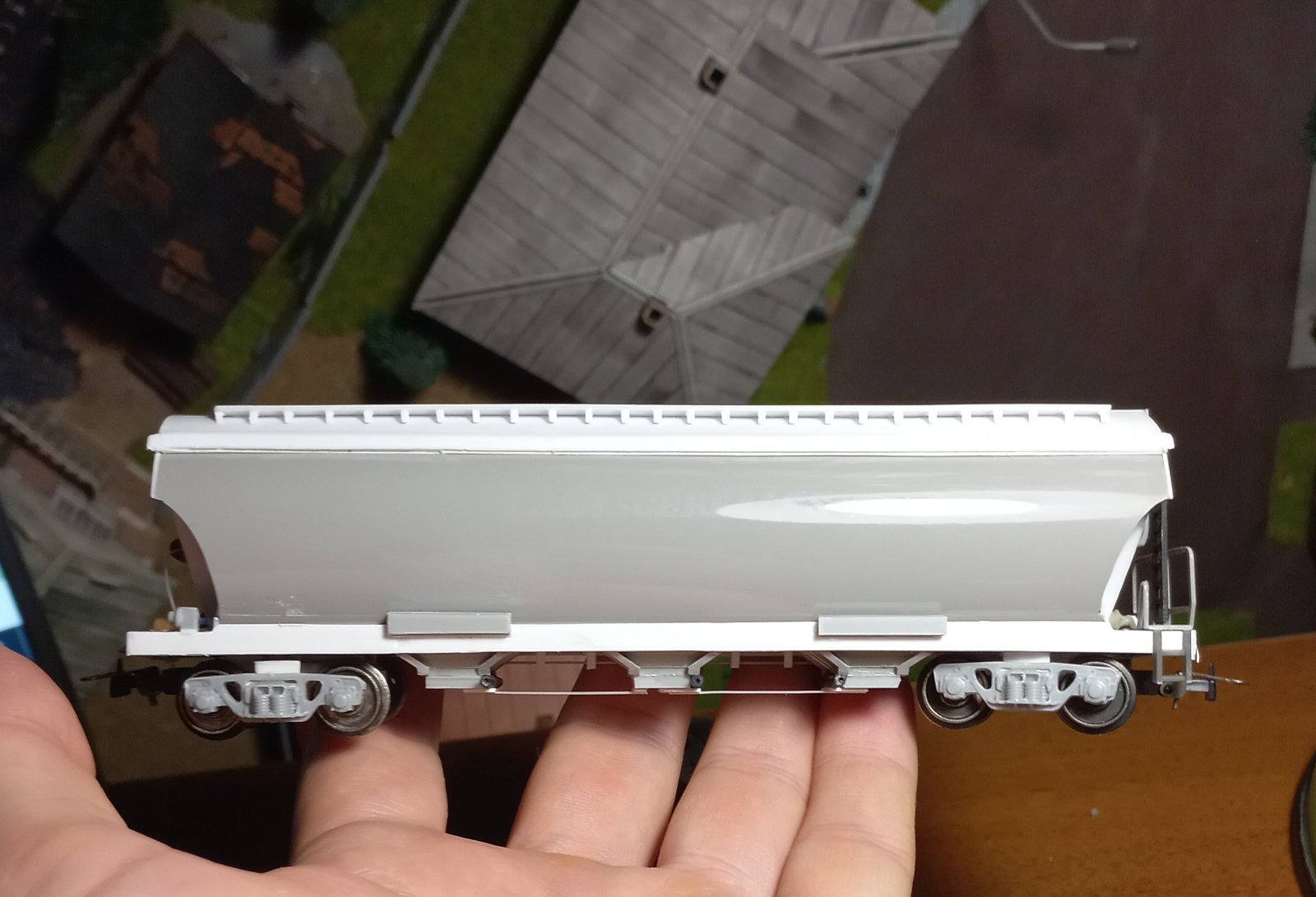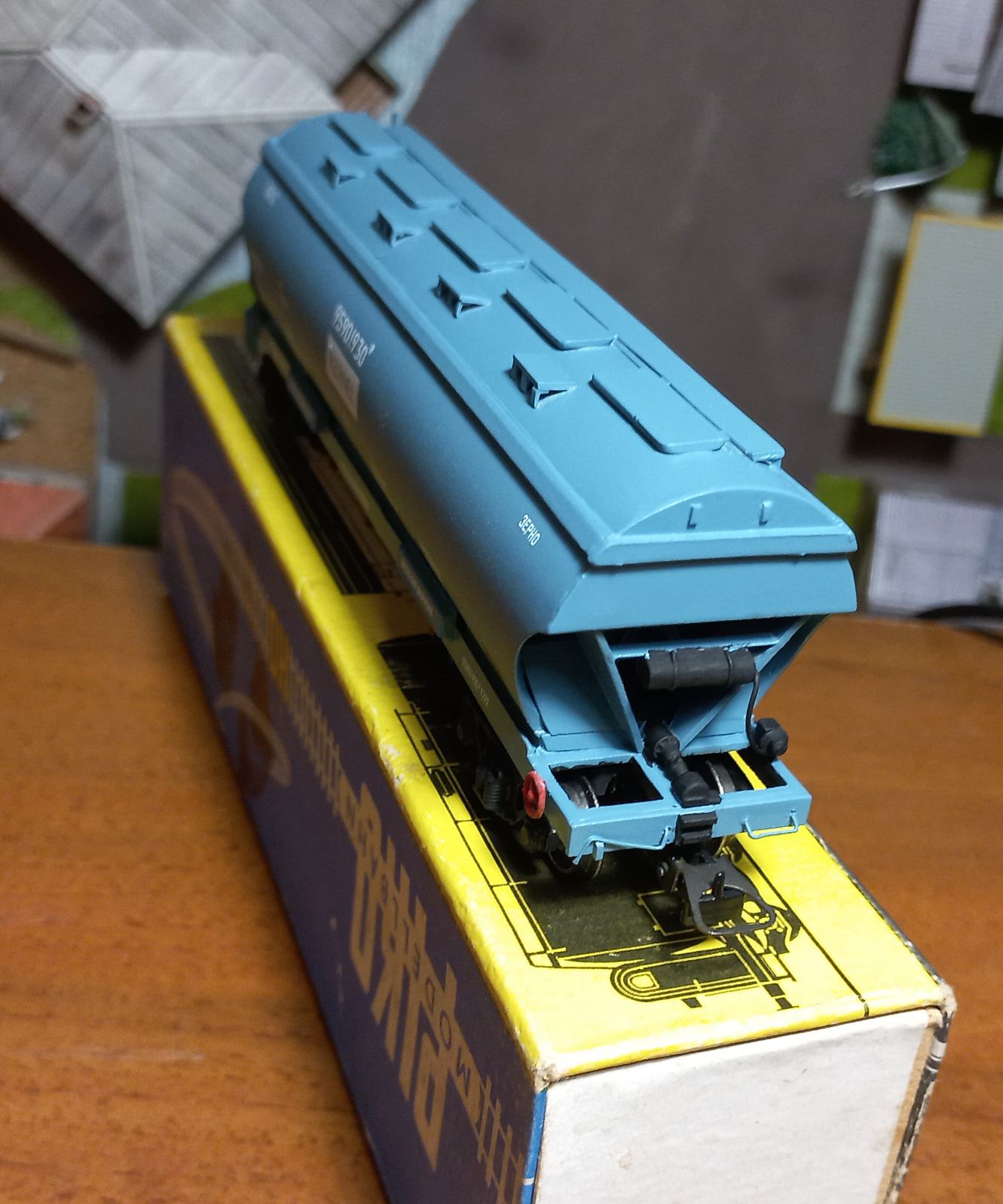 Легка конверсія "Модіміо" у критий вагон УЗ. Перефарбував, легкий везер, прикрутив ходові візки. Це той випадок, коли готовий виріб з пластику/металу дешевше за смоляні криві кіти... :|