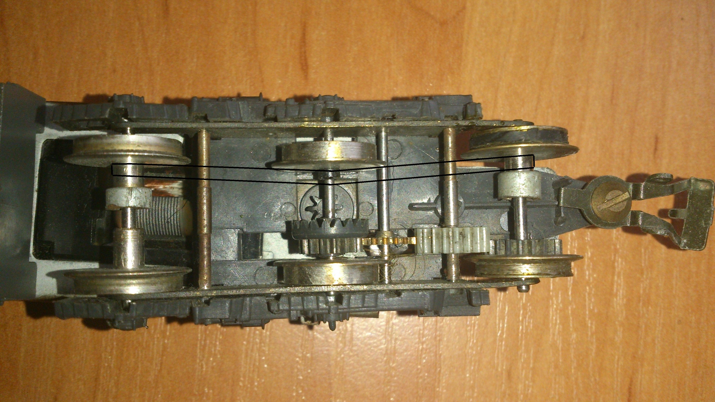 обрезиненые оси телег. 8-) На представленном снимке видна полная механика редуктора,