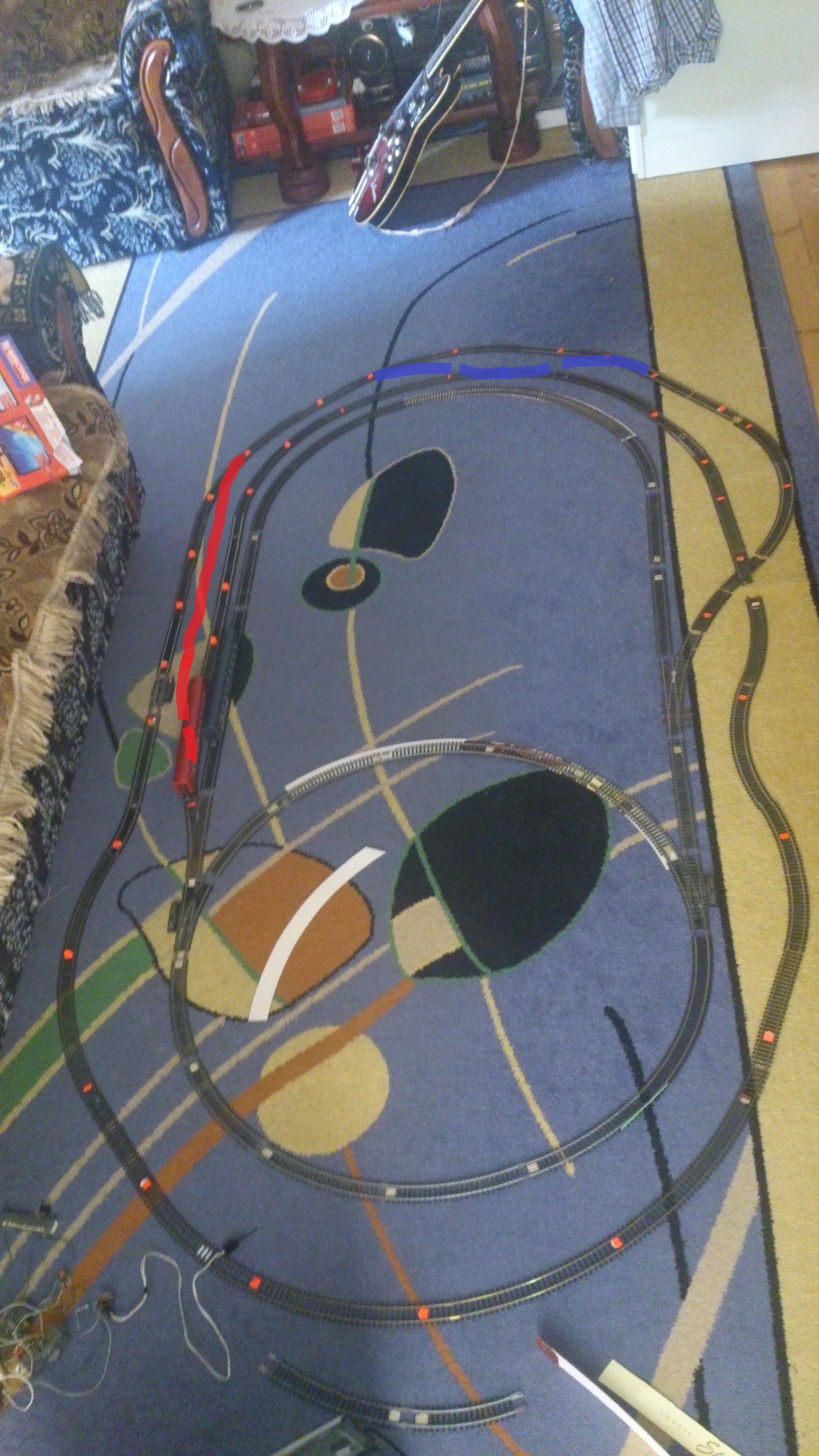 Прикупив у Вовера подвійну стрілку, але не приміряв її ще. Позначив синім. Червоне - стрілок ще нема, і не знаю, як саме прокладу. Є ще незадіяних рельсів десь на метр.